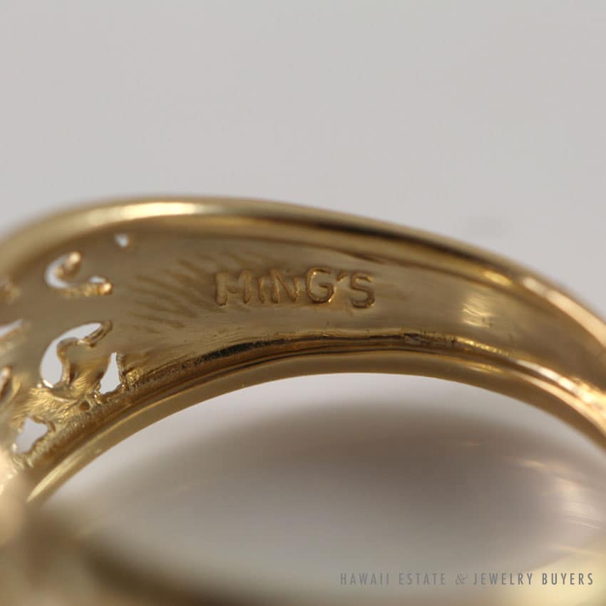 DescriptionSTAMPED: MING’S 14K HKSIZE: US 6.75 -7$550.00Out of stockSKU: dmmay-03Category: Pre-owned Ming's JewelryTag: ming'sRelated StylesMing’s Hawaii Oval Carved Flower Large Jade 14K Yellow Gold Ring$2,440.00Ming’s Hawaii Jade Pale Green/White and Brown Splash 14K Yellow Gold Bangle Bracelet$3,500.00Ming’s Hawaii Twin Jade Ball Pearl Ring$1,760.00Ming’s Hawaii Pearl Cluster Leaf 14K Ring$2,140.00
