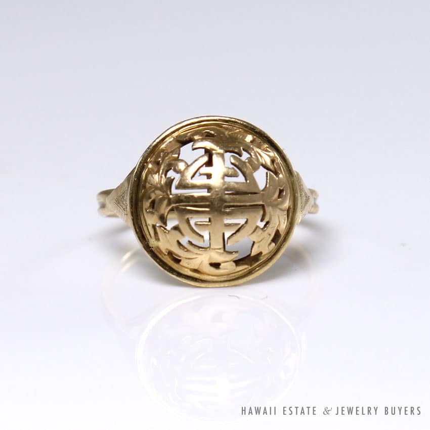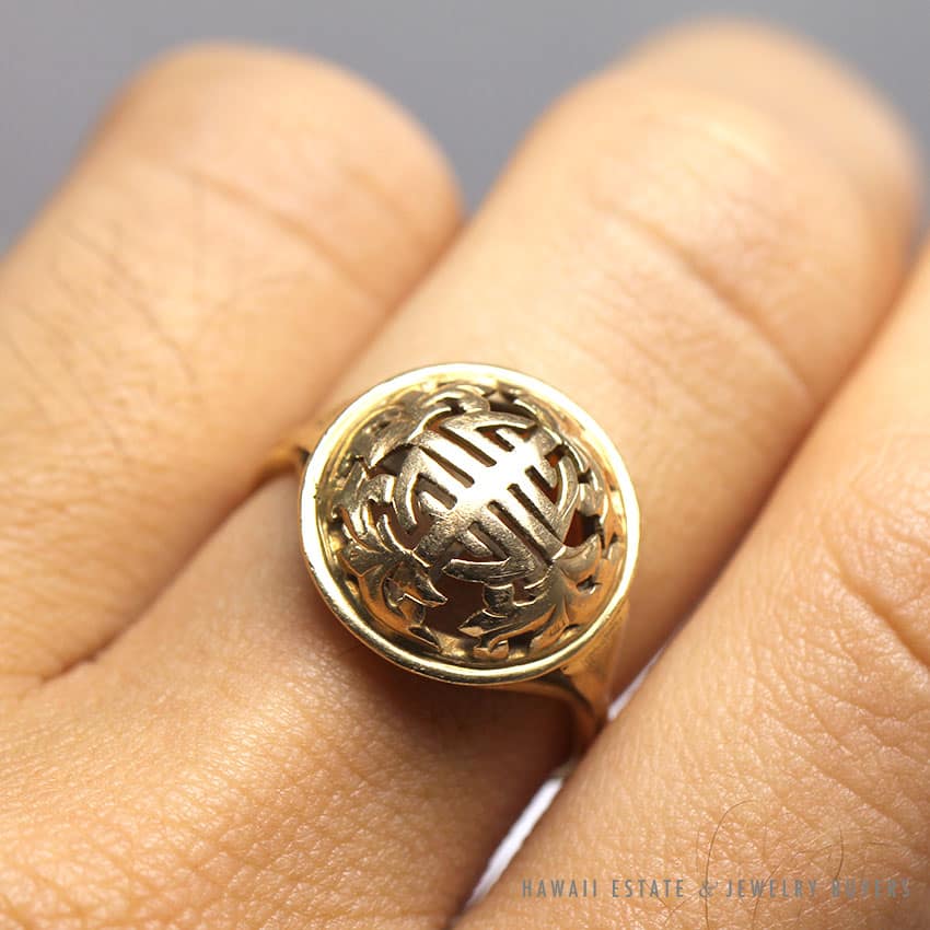 DescriptionMings Hawaii round domed Chinese designed 14k yellow gold ringStamped “14K”Approx size 5.25$780.00Out of stockSKU: 3980-02-1Categories: Pre-owned Ming's Jewelry, Pre-owned Vintage JewelryRelated StylesNatural GIA Certified Ruby Diamond Ring$6,800.00Natural Lavender Cabochon Pendant$2,300.00GIA CERTIFIED MARQUISE NATURAL JADE APPLE GREEN COLOR JADE RING GIA JADE SZ 5.25$1,000.001.65ct Natural Pink Sapphire and Diamond Ring$6,500.00