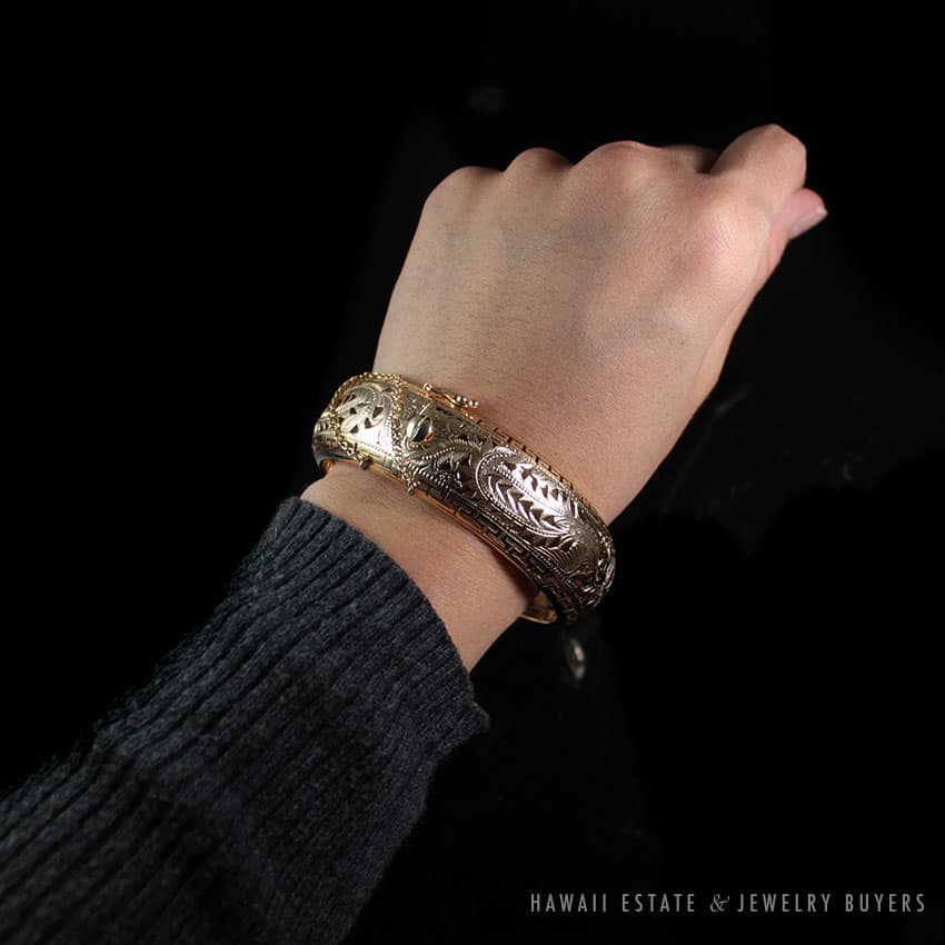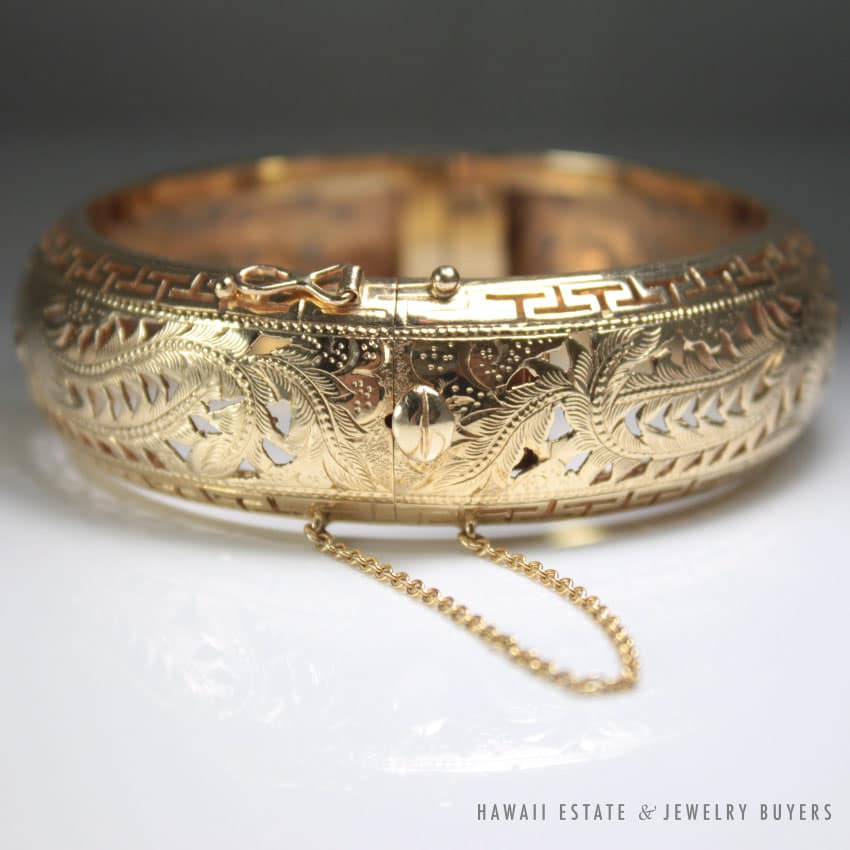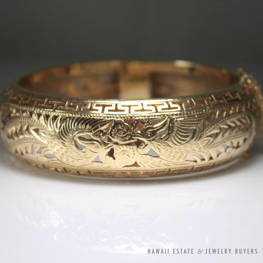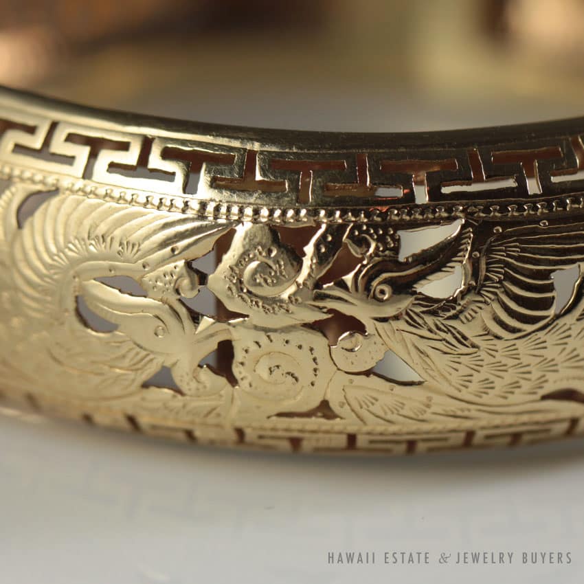 DescriptionSigned, authenticMetal: 14K Yellow GoldSize: 19mmWeight: 43.0gSKU: 1772-02Inner circumference measures approx 7 1/4″$5,200.00Out of stockSKU: 1772-02Category: Pre-owned Ming's JewelryRelated StylesMing’s Hawaii Pearl Cluster Leaf 14K Ring$2,140.00Ming’s Multi Color Jade & Pearl Grid Ring$1,900.00Ming’s Hawaii Jade Cabochon Pearl Ring$2,975.00Ming’s Hawaii Twin Jade Ball Pearl Ring$2,620.00