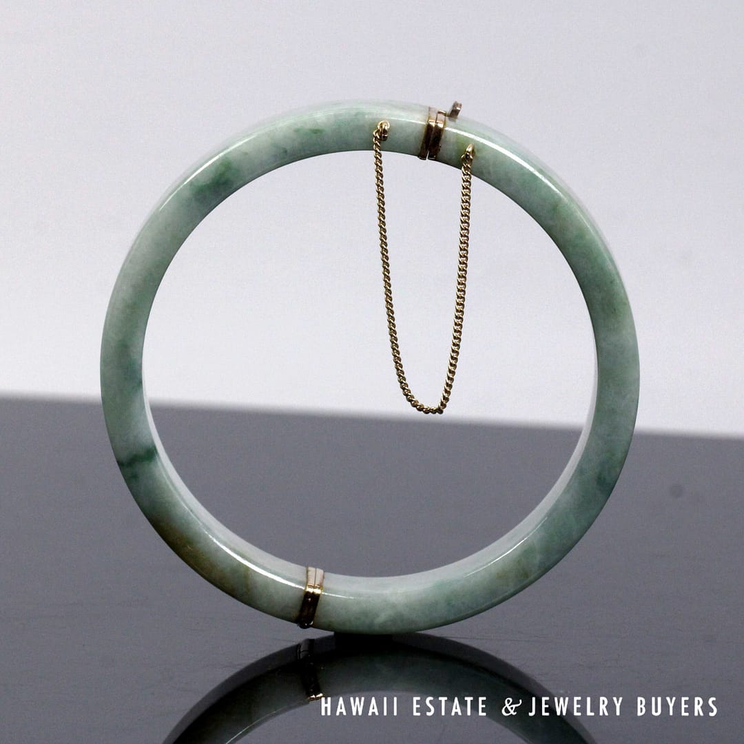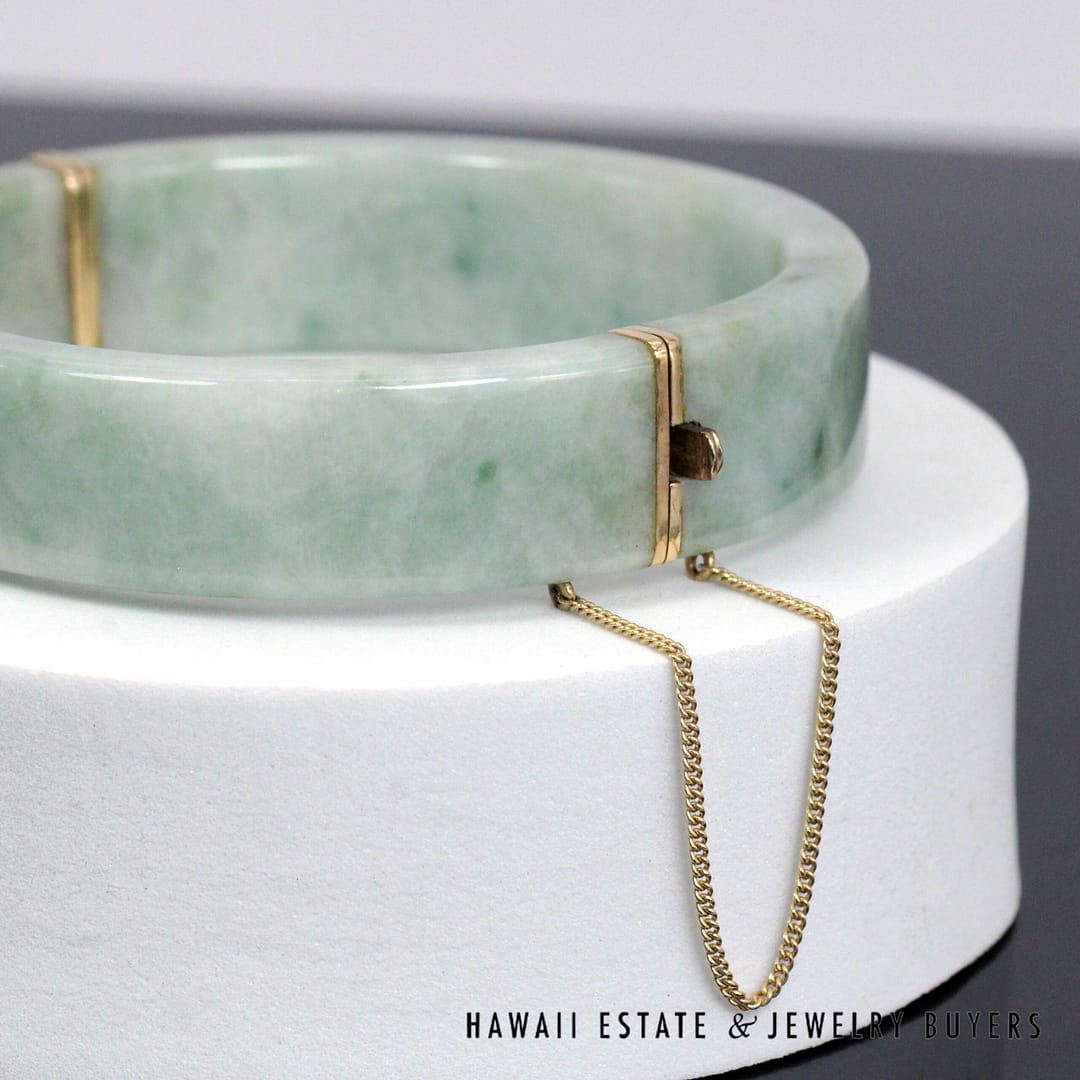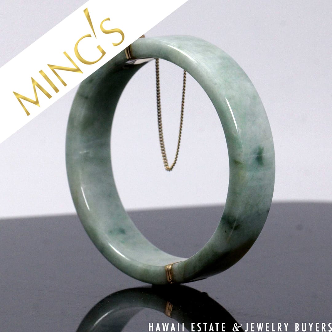 Authentic Ming's Hawaii hinged bangle bracelet featuring smooth green jade with 14K yellow gold fittings and safety chain, showcasing classic mid-century island elegance.