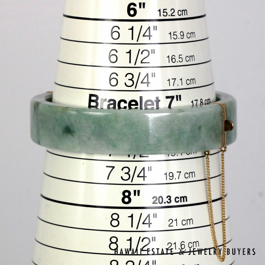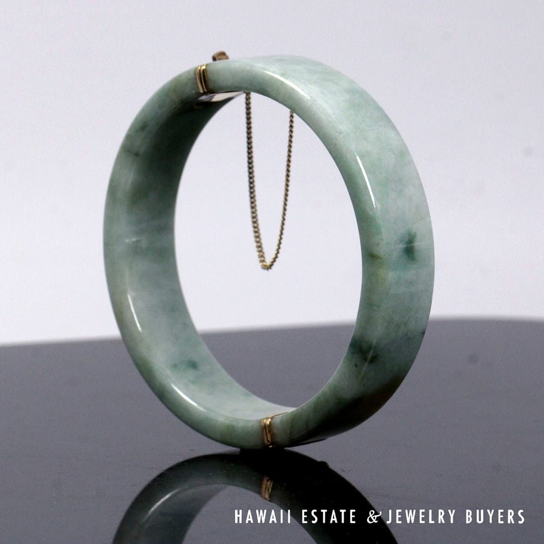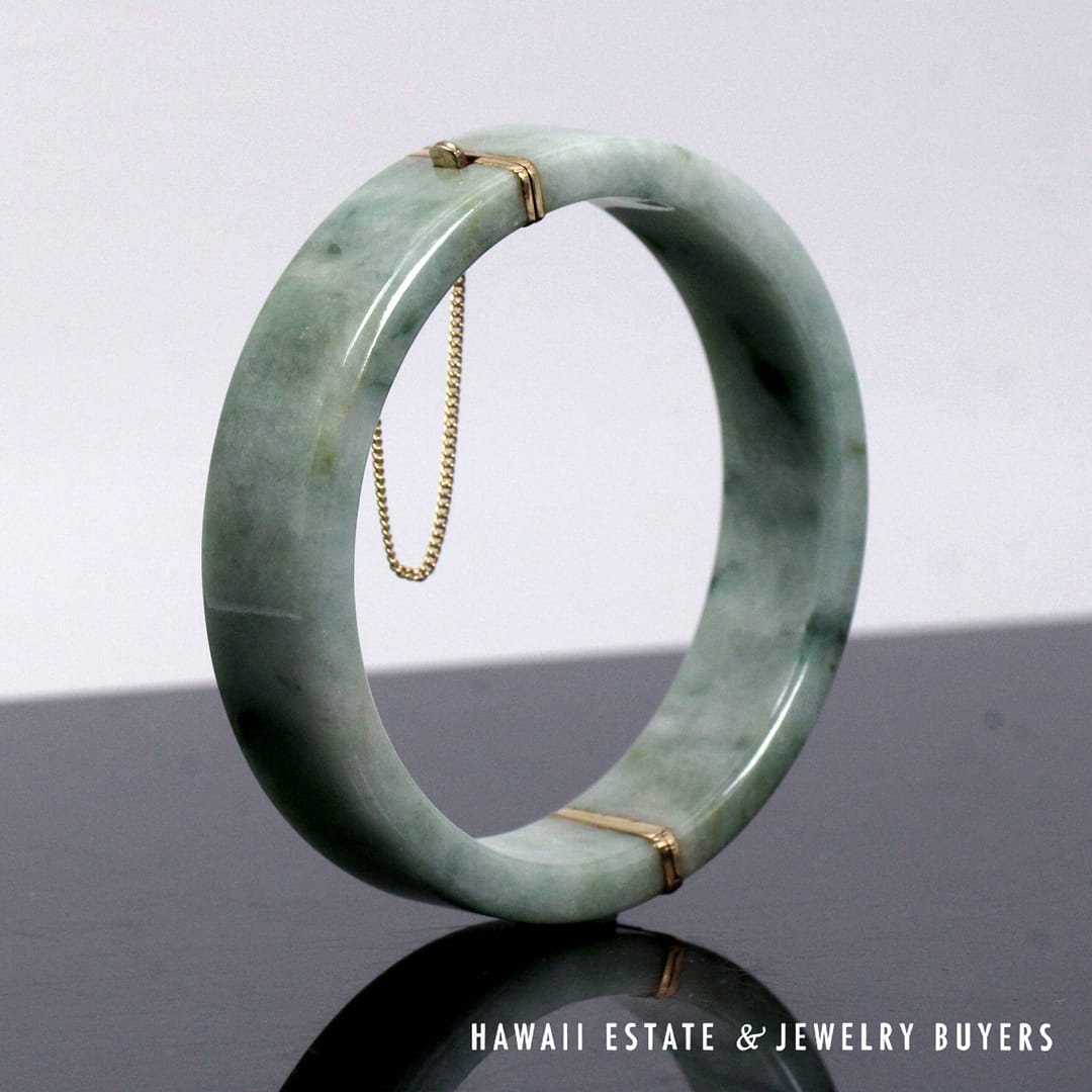 Authentic Ming's Hawaii hinged bangle bracelet featuring smooth green jade with 14K yellow gold fittings and safety chain, showcasing classic mid-century island elegance.