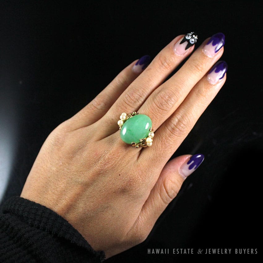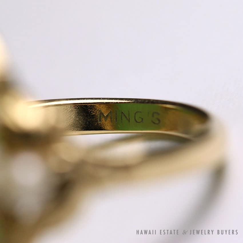 DescriptionSTAMPED: 14K MING’S$2,650.001 in stockMING'S HAWAII GREEN JADE CABOCHON & PEARL 14K YELLOW GOLD RING SIZE 6.5 quantityAdd to cartMake OfferSKU: CZ100-03Category: Pre-owned Ming's JewelryTag: ming'sRelated StylesMing’s Hawaii Grey Jade Pearl Set$2,300.00Ming’s Pale Whitish Jade Cabochon Ring$3,925.00Ming’s Hawaii Jade Pale Green/White and Brown Splash 14K Yellow Gold Bangle Bracelet$3,500.00Ming’s Hawaii Oval Carved Flower Large Jade 14K Yellow Gold Ring$1,800.00