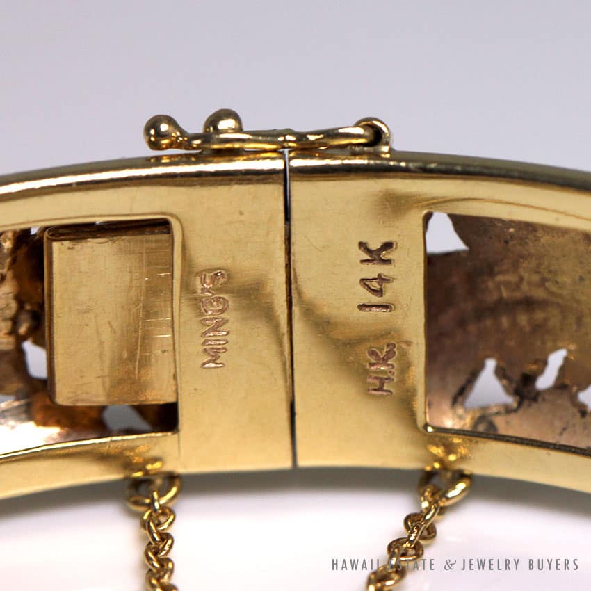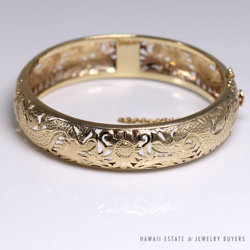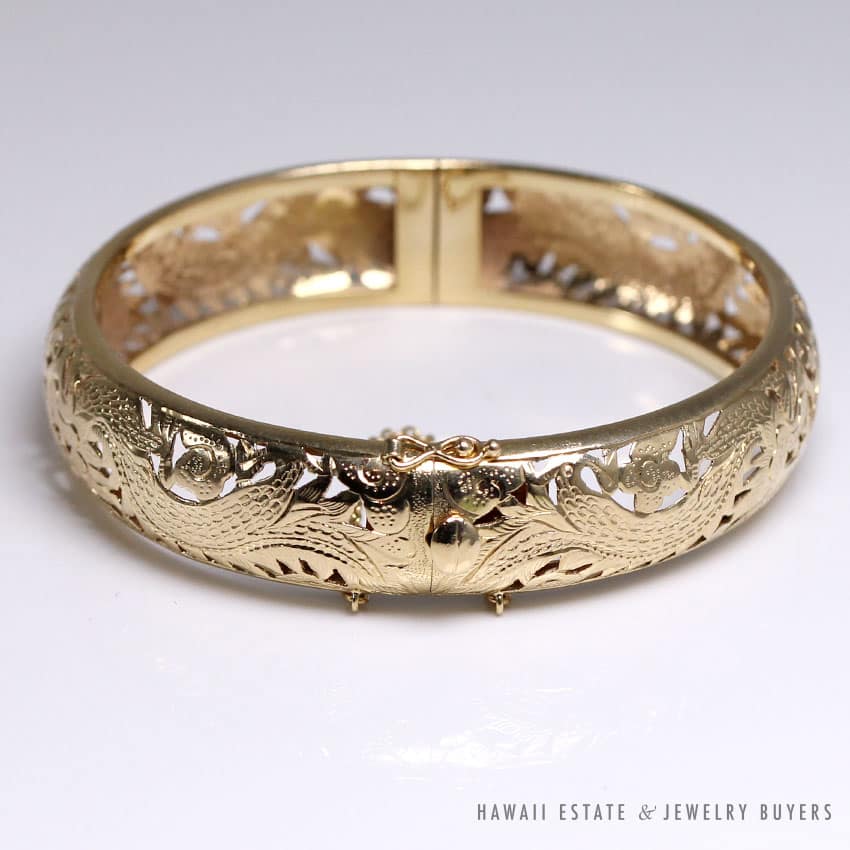 DescriptionMings Hawaii hand engraved twin dragon and sun 14k yellow gold hinged bangle.Stamped “14K”$3,100.00Out of stockSKU: KN111819-01Categories: Pre-owned Ming's Jewelry, Pre-owned Vintage JewelryRelated StylesVintage Fire Opal & Diamond 18K Ring$7,000.0022.8g 18KWG TYPE A IMPERIAL JADE BUDDAH HAND CARVING w/2.50ctw DIAMOND PENDANT MEASURES 58x28mm (1395-01)$13,900.00Natural Lavender Cabochon Pendant$2,300.00Natural Grade A White Jade Archer Ring$3,800.00