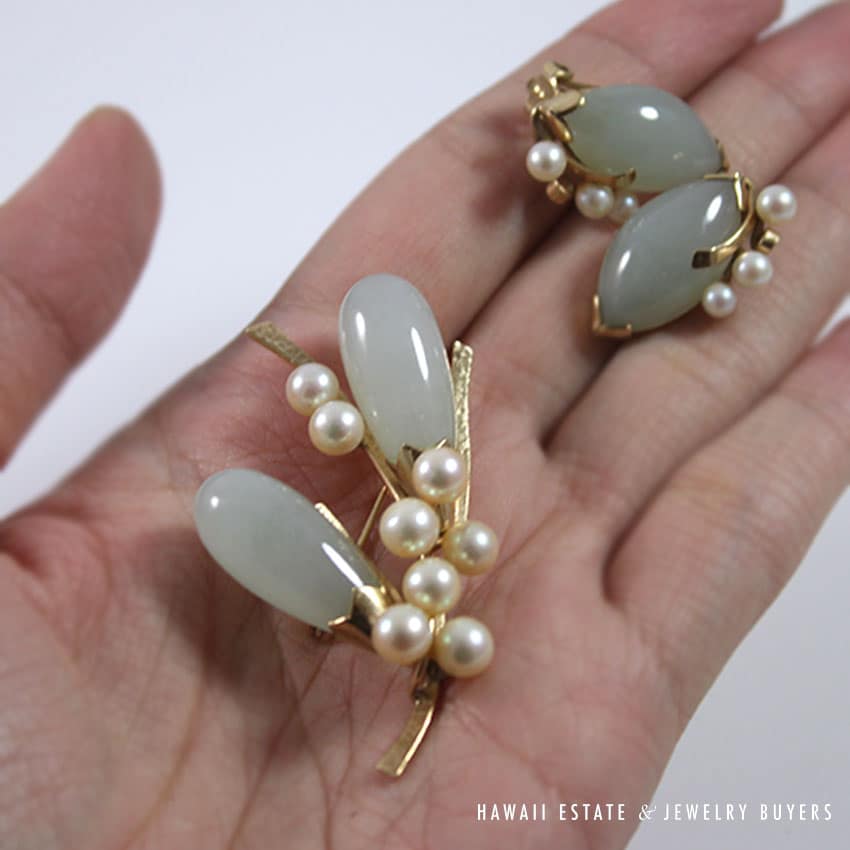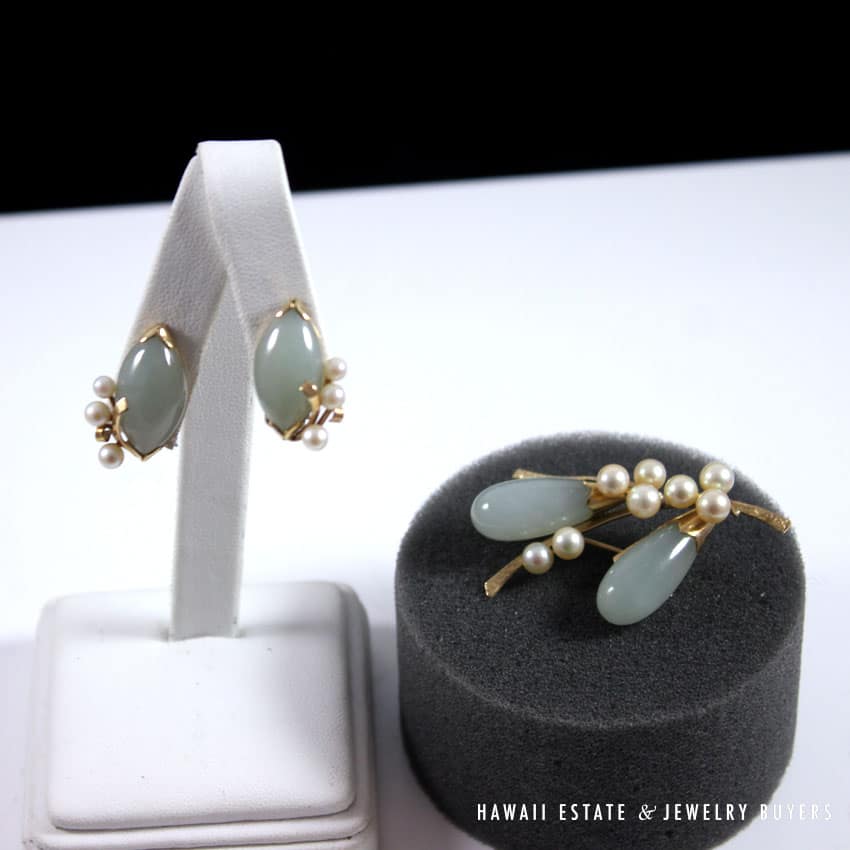 DescriptionBRAND: MING’S HAWAII (singed, authentic)STAMPED: 14KSKU 0722-12$1,380.001 in stockMing's Hawaii Jade Green & Pearl Cluster 14K Yellow Gold Earrings Brooch Set quantityAdd to cartBuy withMake OfferSKU: 0722-12Category: Pre-owned Ming's JewelryTags: hawaii mings, jade, ming's, ming's hawaii, pealr, set, vintage ming's, yellow goldRelated StylesMing’s Hawaii Grey Jade Pearl Set$2,300.00Ming’s Hawaii Twin Jade Ball Pearl Ring$1,300.00Ming’s Hawaii Pearl Cluster Leaf 14K Ring$1,600.00Ming’s Hawaii Oval Carved Flower Large Jade 14K Yellow Gold Ring$1,800.00