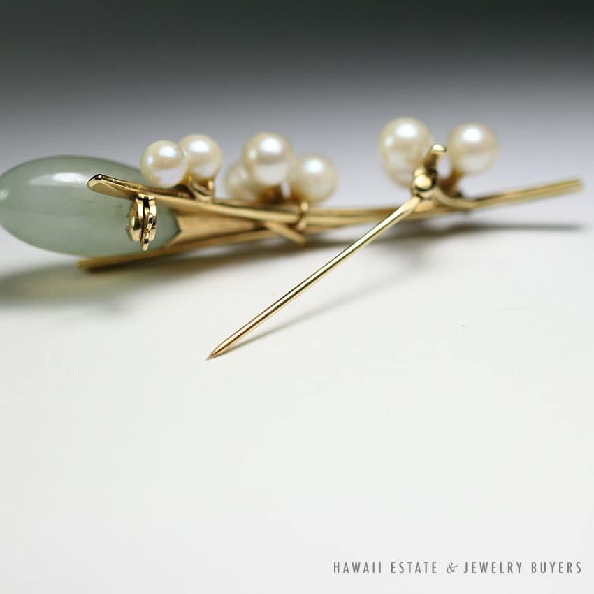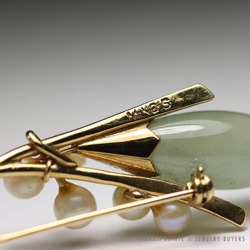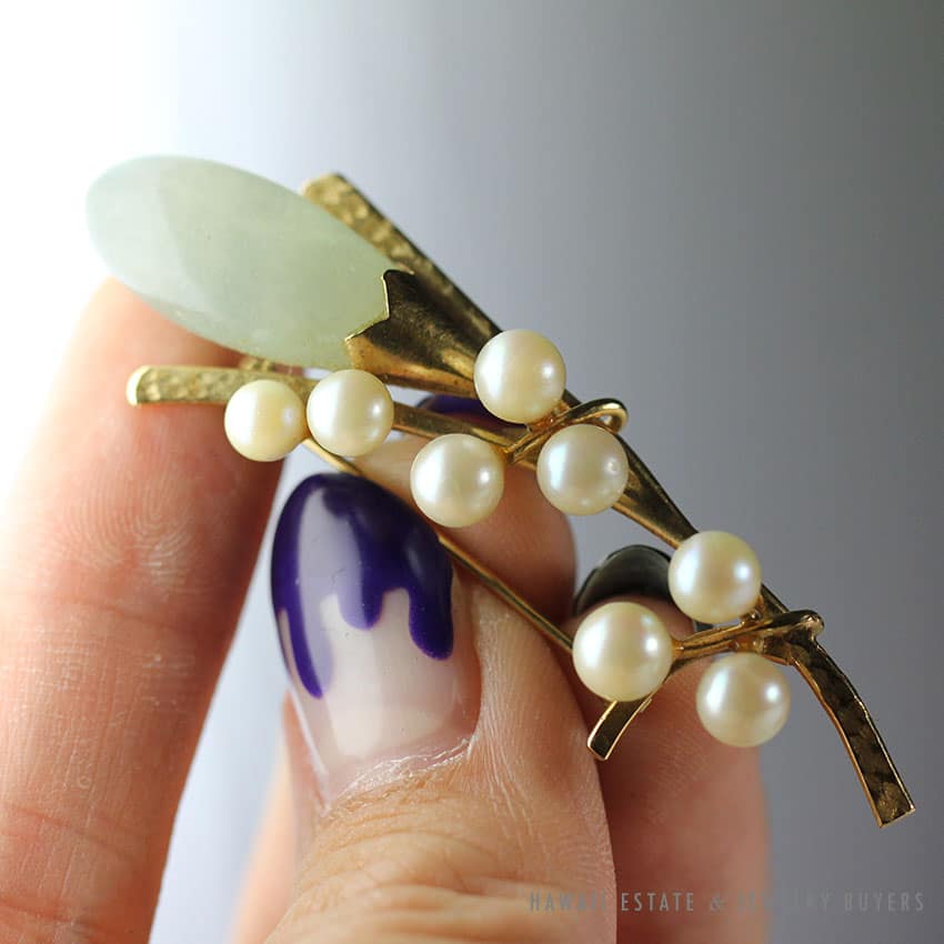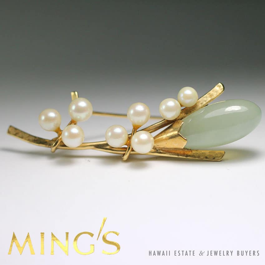 DescriptionMING’S HAWAII JADE & PEARL 14K YELLOW GOLD BROOCH PIN$1,760.001 in stockMING'S HAWAII JADE & PEARL 14K YELLOW GOLD BROOCH PIN quantityAdd to cartMake OfferSKU: 2022-02Category: Pre-owned Ming's JewelryRelated StylesMing’s Hawaii Pear Jade Pearl Twin Ring$1,500.00Ming’s Hawaii Pale Green Twin Jade Ball & White Pearl Ring$1,600.00Ming’s Hawaii Green Jade 14K Yellow Gold Hinged Bangle$7,480.00Ming’s Hawaii Pale Green Jade 14K Yellow Gold Bangle Bracelet$6,830.00