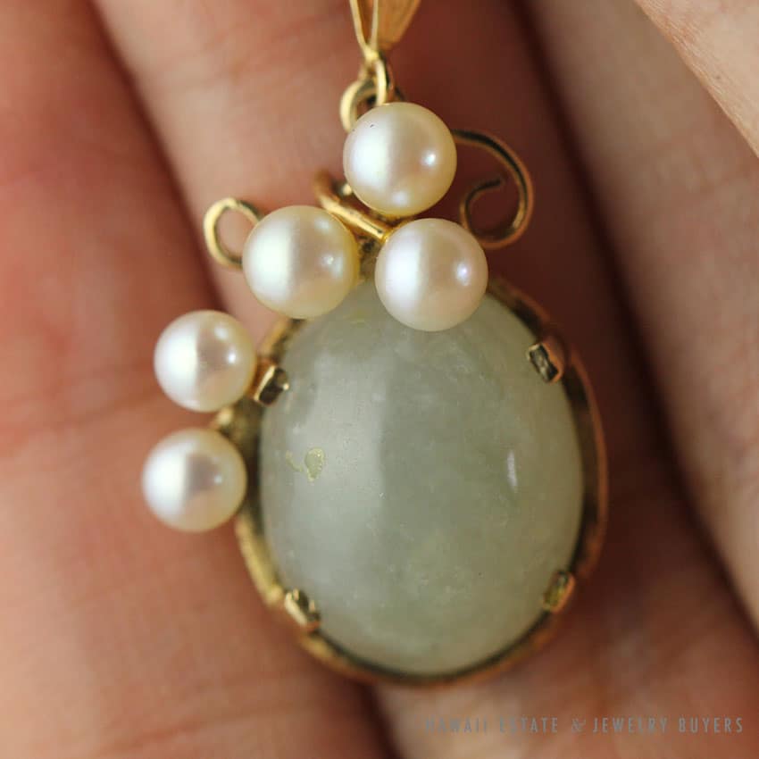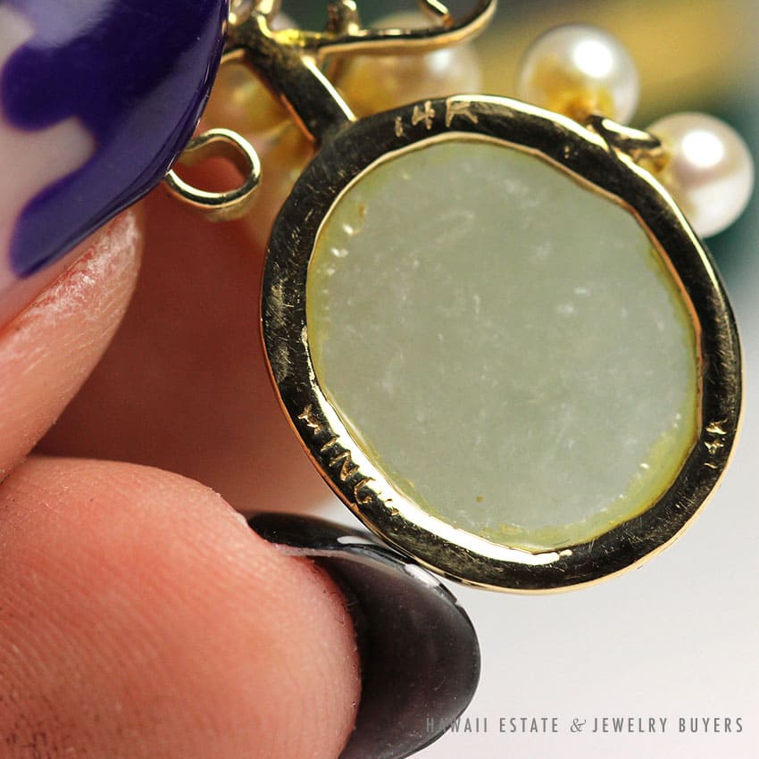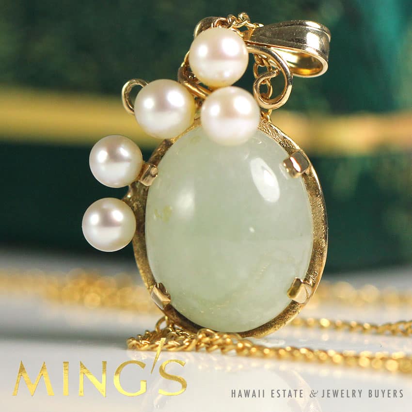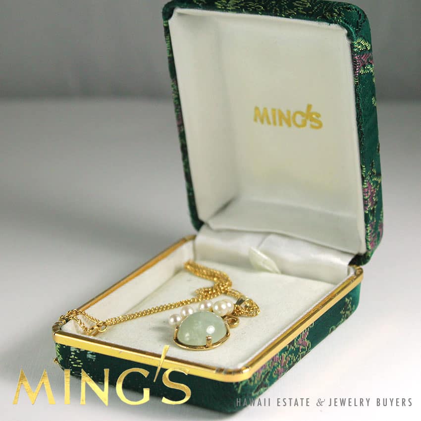 DescriptionSTAMPED: 14K MING’SNote: comes with original gold brocade box. Box shown is not original. $1,500.001 in stockMING'S HAWAII JADE & PEARL 14K YELLOW GOLD PENDANT W/ NECKLACE CHAIN AND BOXARL 14K YELLOW GOLD PENDANT & CHAIN NECKLACE (Copy) quantityAdd to cartBuy withMake OfferSKU: 2040-06Category: Pre-owned Ming's JewelryTag: ming'sRelated StylesMing’s Hawaii Grey Jade Pearl Set$2,300.00Ming’s Hawaii Pearl & Multi-Color Jade Cluster 14K Ring$2,650.00Ming’s Hawaii Pearl Cluster Leaf 14K Ring$1,600.00Ming’s Hawaii Pale Green Twin Jade Ball & White Pearl Ring$1,600.00