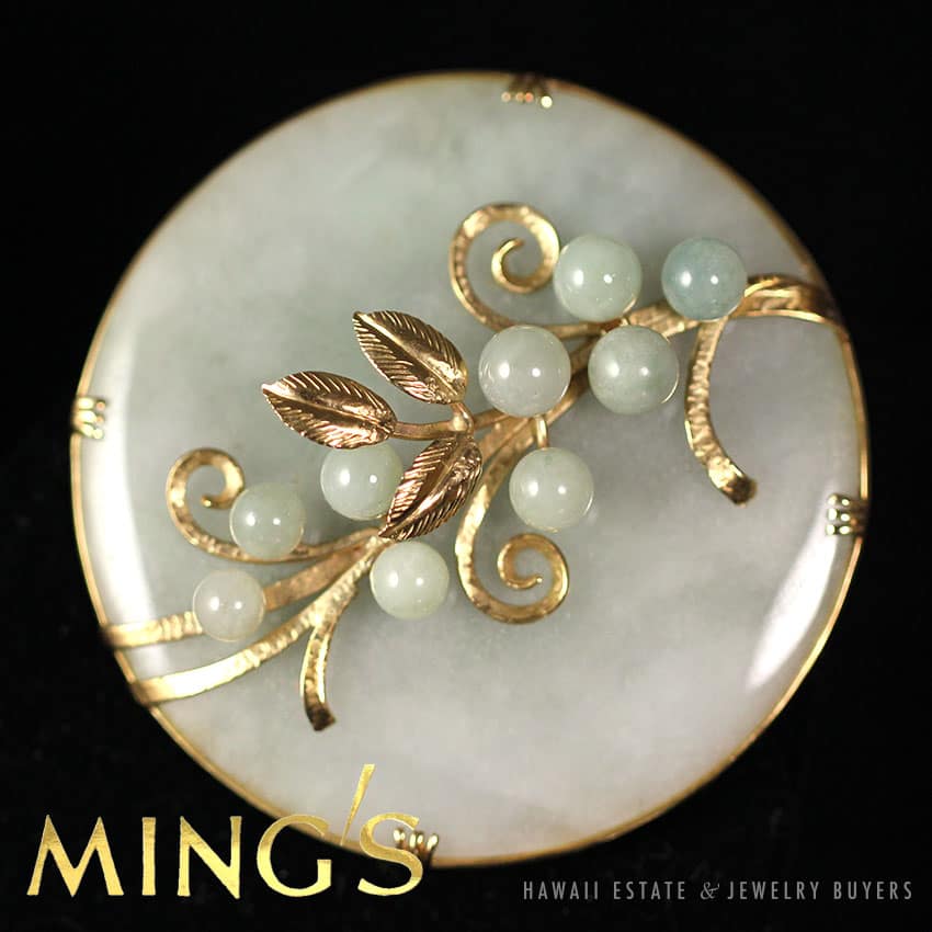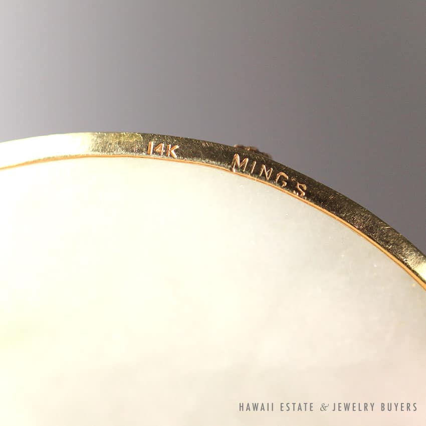 DescriptionSIGNED: MING’S 14K $900.00Out of stockSKU: 2062-01Category: Pre-owned Ming's JewelryRelated StylesMing’s Hawaii Pear Jade Pearl Twin Ring$1,500.00Ming’s White Jade14K Yellow Gold Set$3,800.00Ming’s Lavender Jade & Pearl Ring$3,600.00Ming’s Hawaii Oval Carved Flower Large Jade 14K Yellow Gold Ring$2,440.00