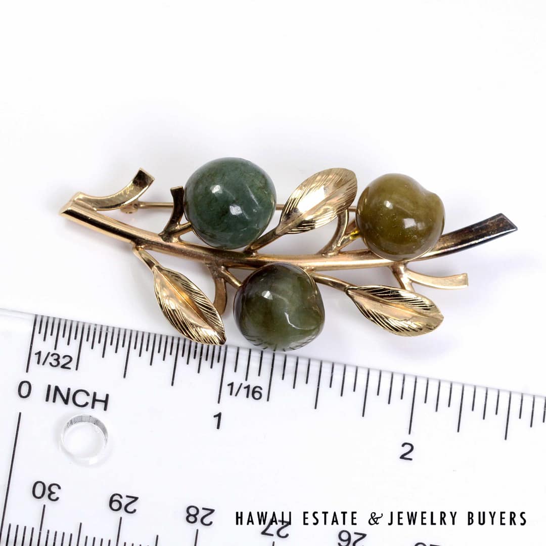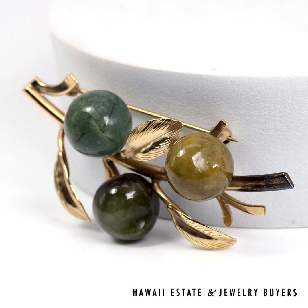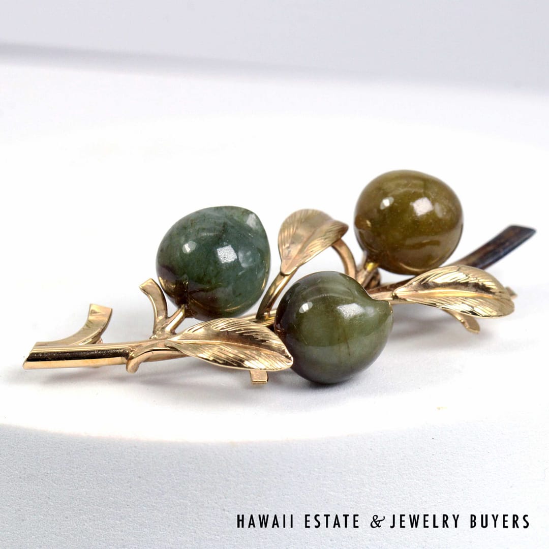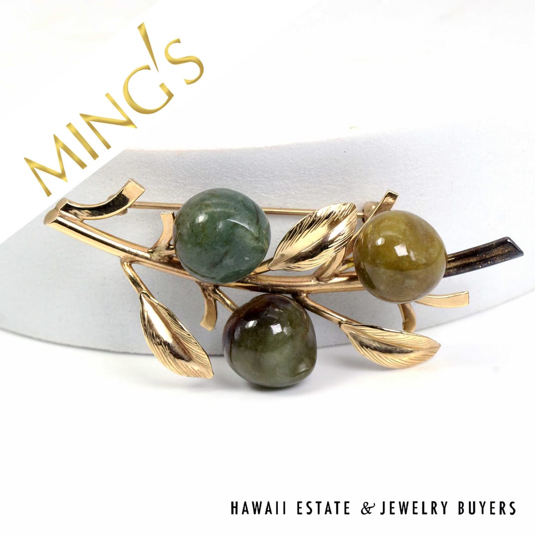 This vintage Ming's Hawaii brooch features three polished jade orbs in rich green tones set among intricately sculpted 14K yellow gold leaves and branches, creating a timeless botanical design.