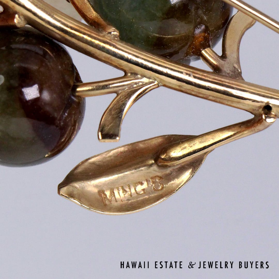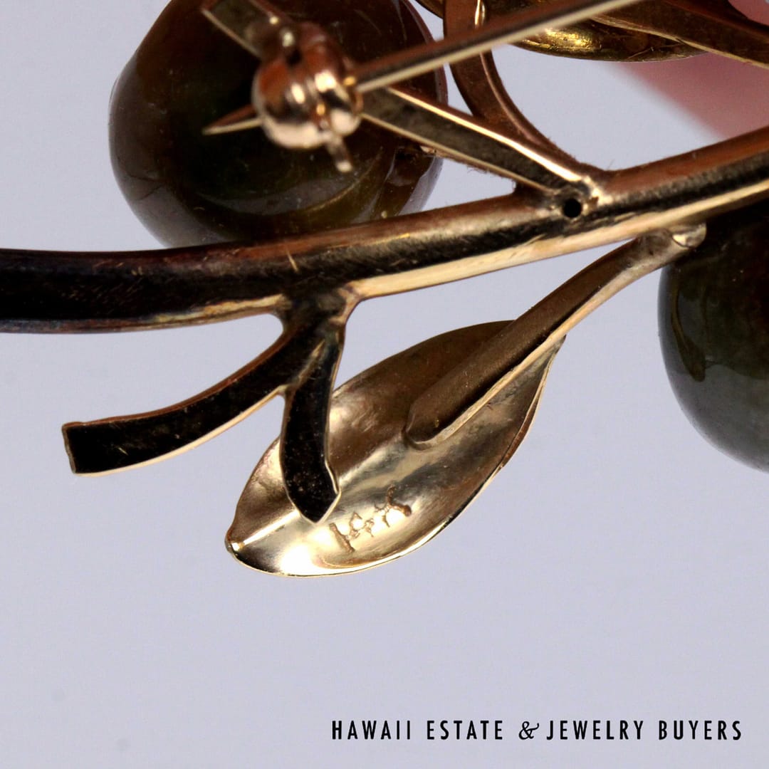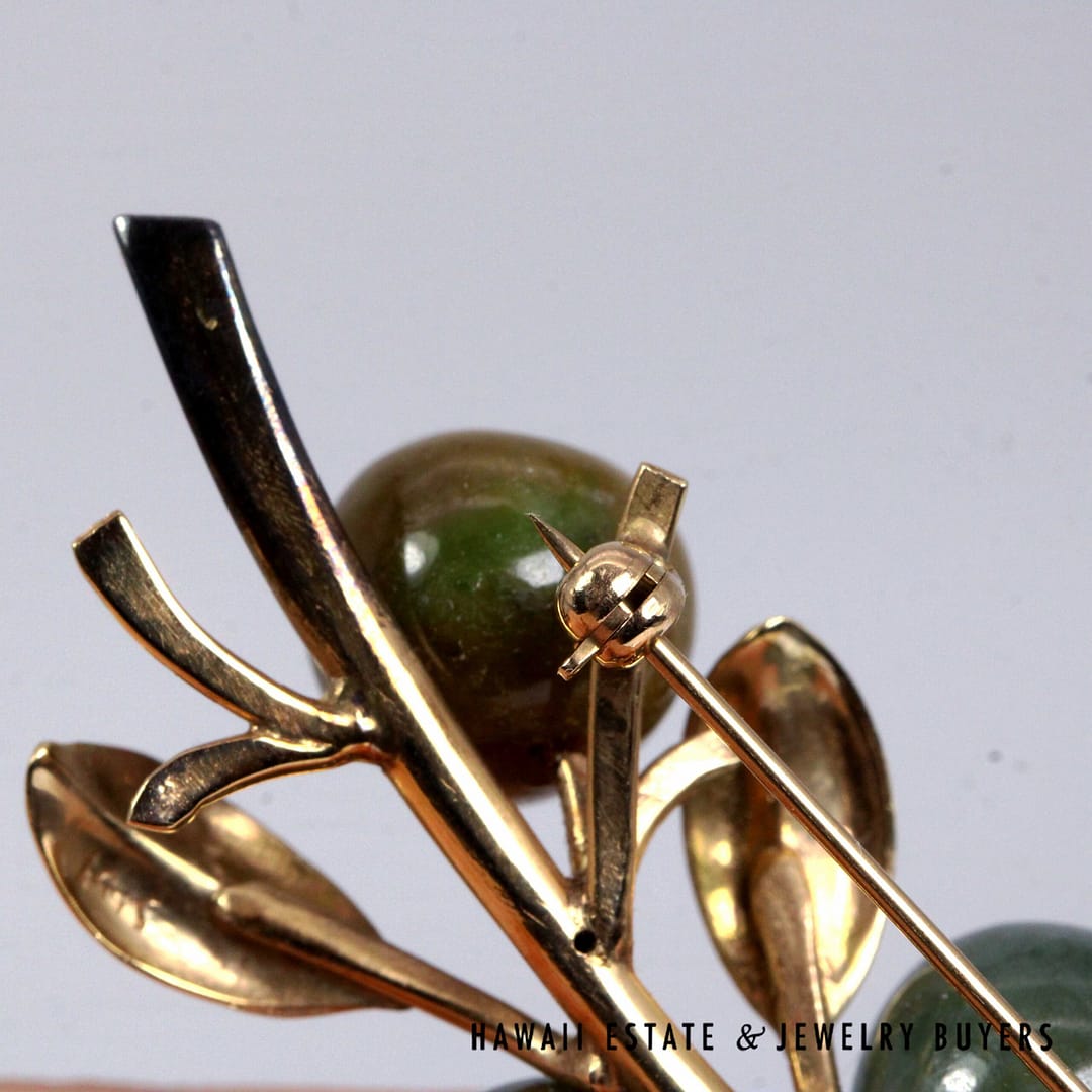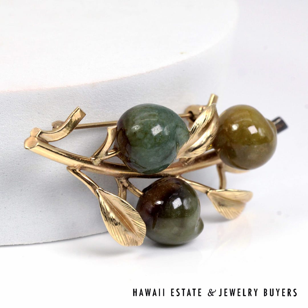 This vintage Ming's Hawaii brooch features three polished jade orbs in rich green tones set among intricately sculpted 14K yellow gold leaves and branches, creating a timeless botanical design.