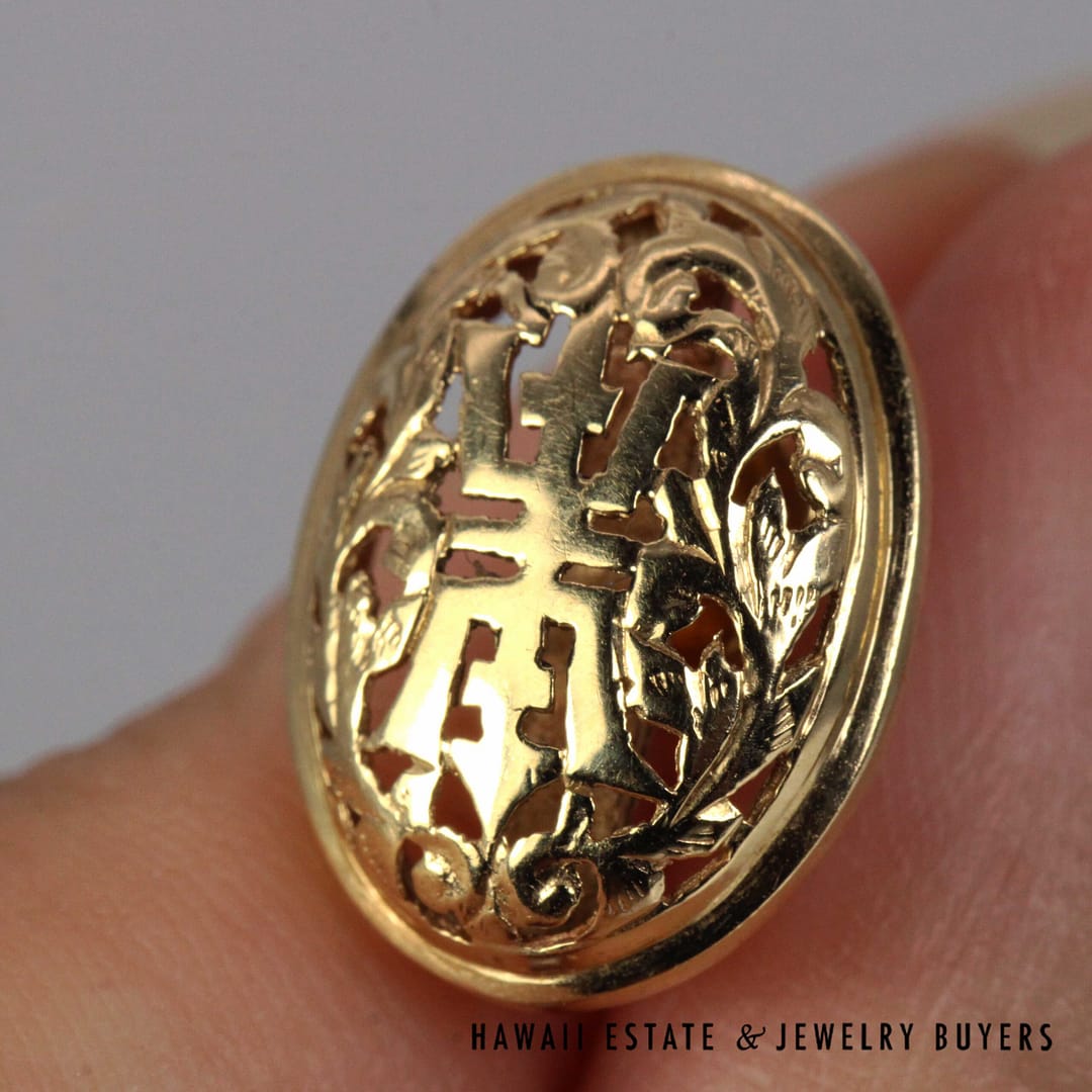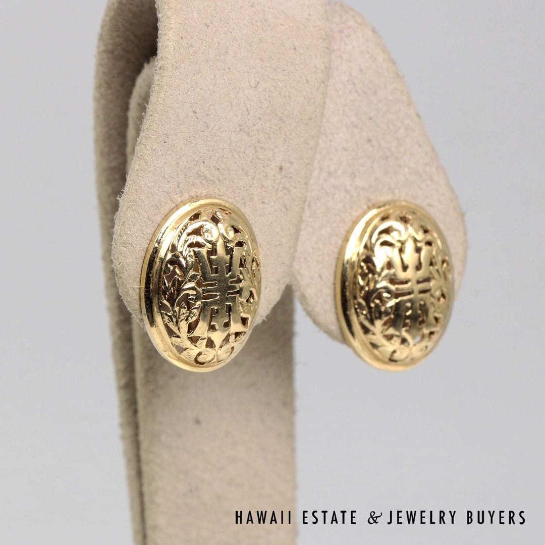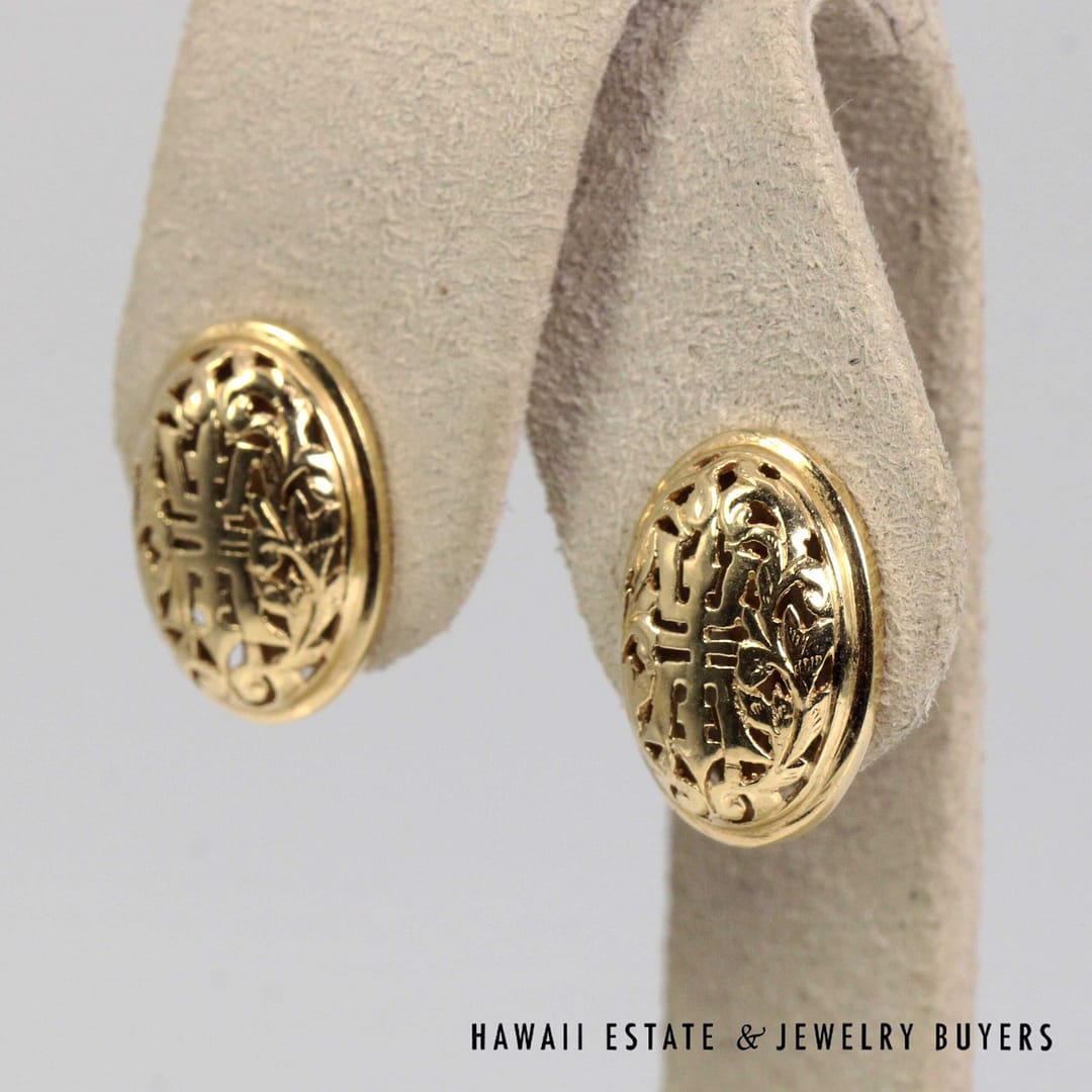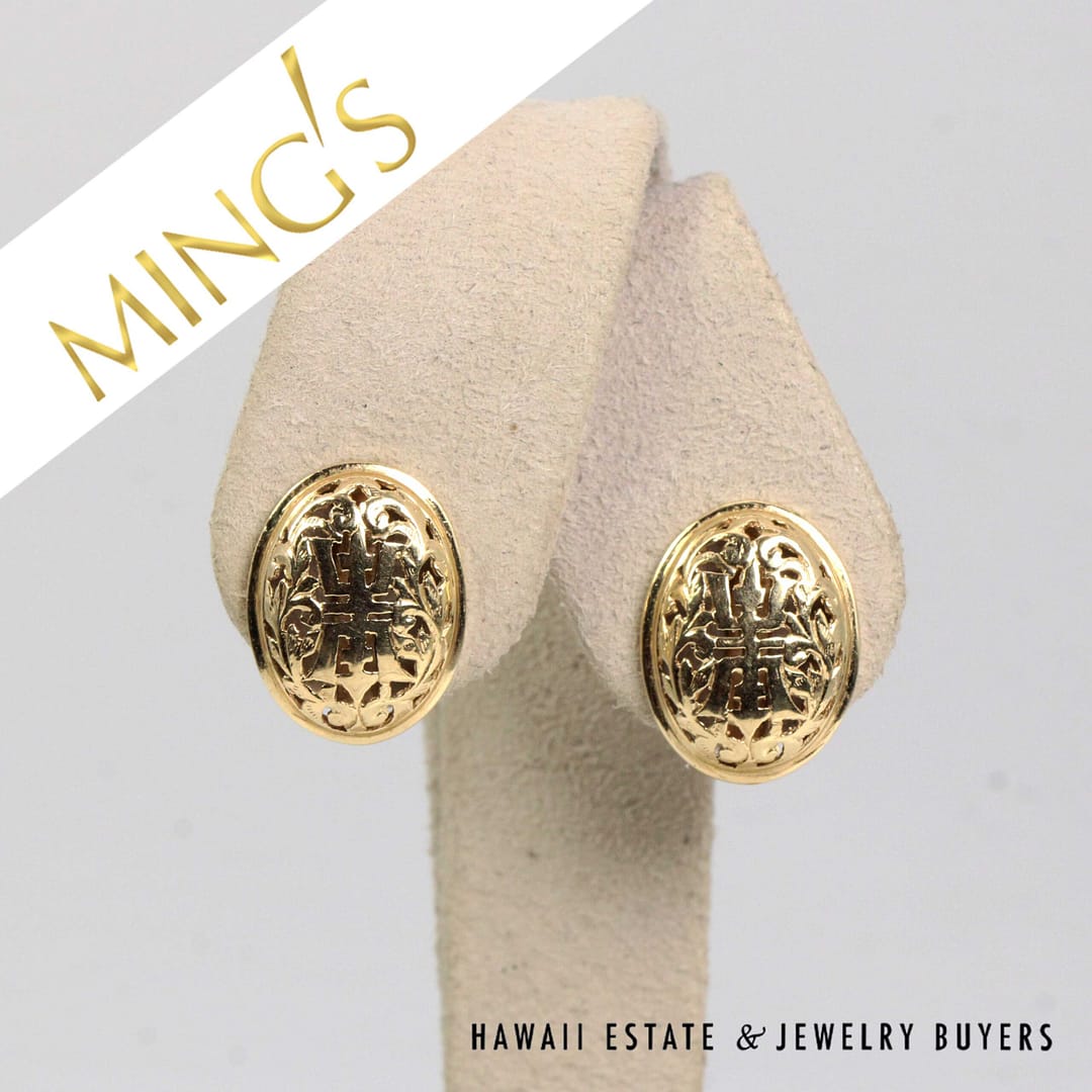 Timeless Ming's Hawaii solid 14K yellow gold oval Shou stud earrings, featuring a classic and elegant design perfect for everyday or special-occasion wear.
