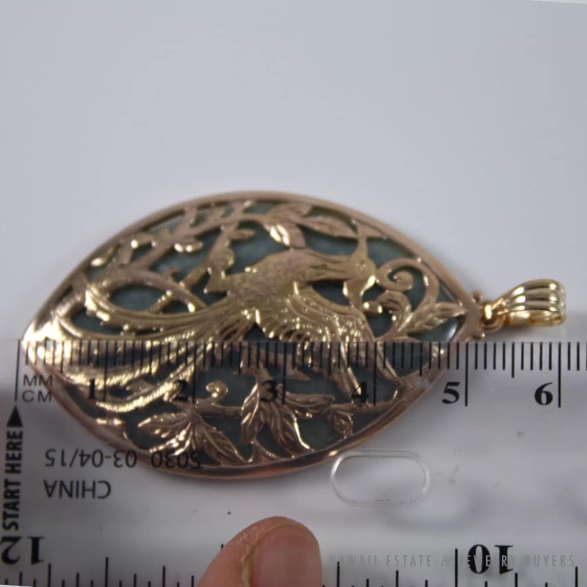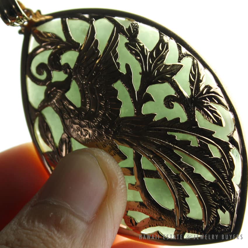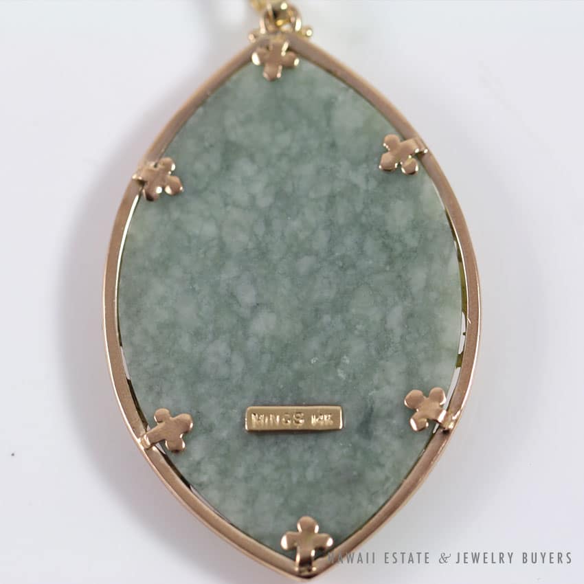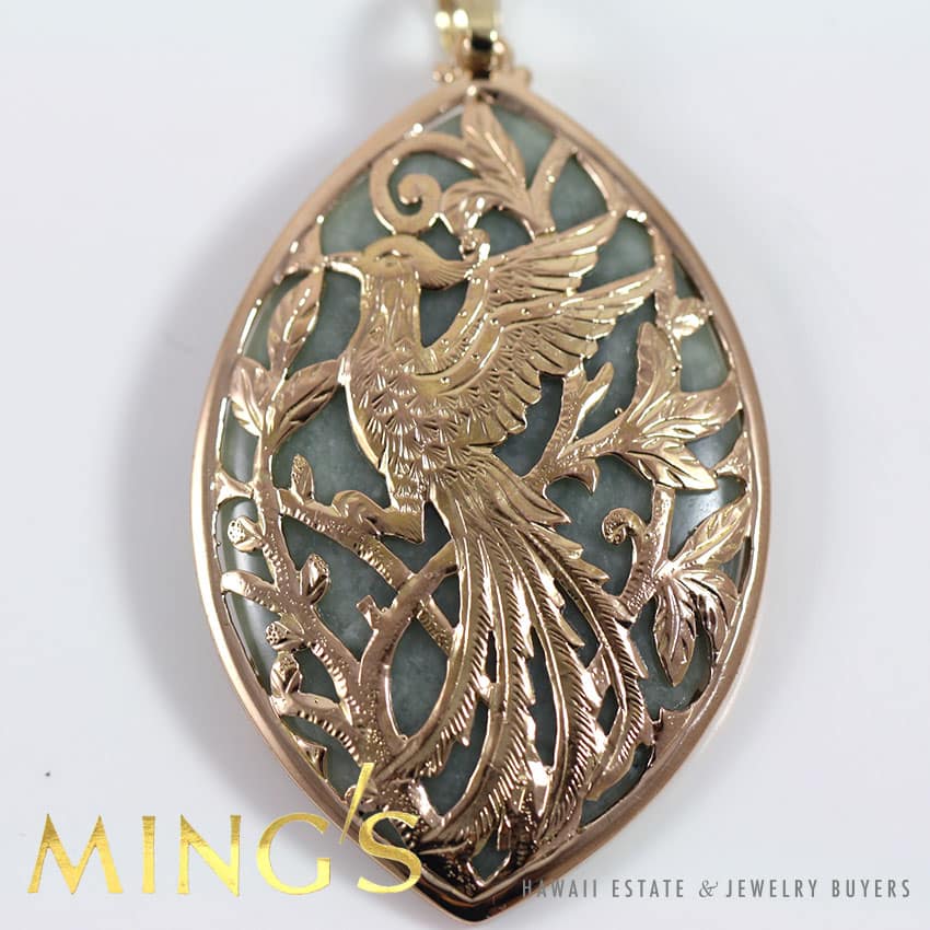 DescriptionSTAMPED: MING’S 14KThis authentic vintage Ming’s Hawaii has one oval shaped green jade with a 14K yellow gold overlay of a phoenix.The open back design allows light to pass through the jade an illuminate the back of the phoenix.SKU: 2003-10$1,800.00Out of stockSKU: 2003-01Category: Pre-owned Ming's JewelryTags: ming's, ming's hawaiiRelated StylesMing’s Hawaii Pale Green Jade 14K Yellow Gold Bangle Bracelet$6,830.00Ming’s Hawaii Jade Pale Green/White and Brown Splash 14K Yellow Gold Bangle Bracelet$3,500.00Ming’s Hawaii Twin Jade Ball Pearl Ring$2,620.00Ming’s Hawaii Pear Jade Pearl Twin Ring$1,500.00