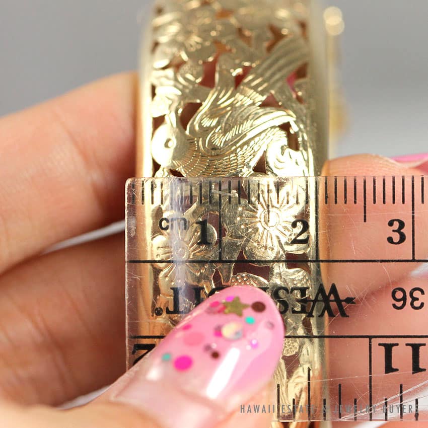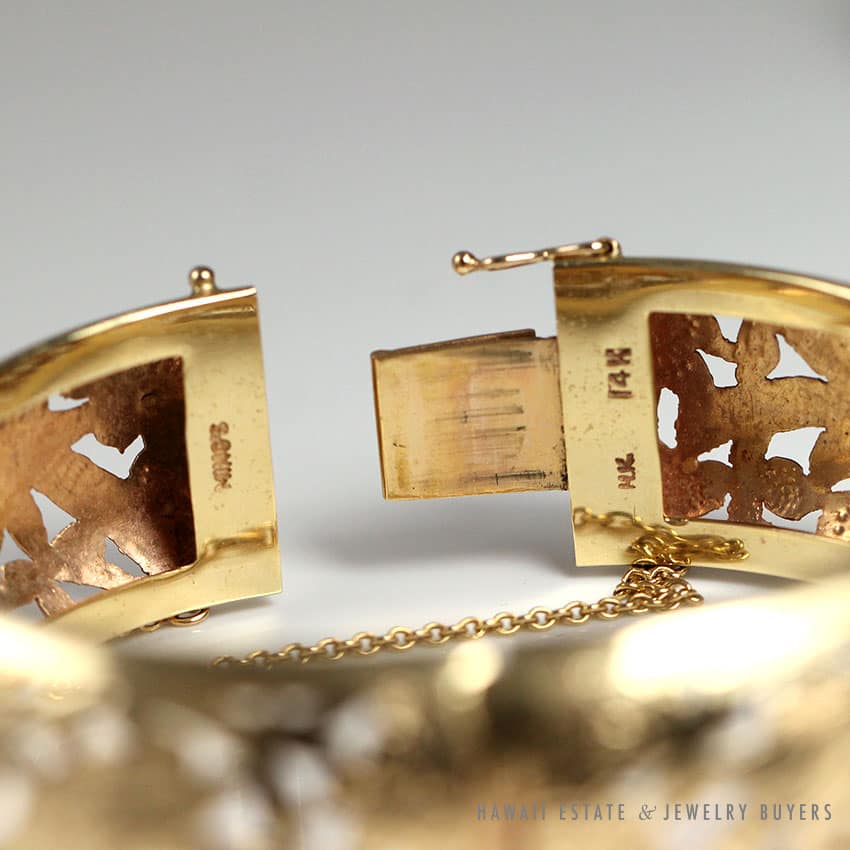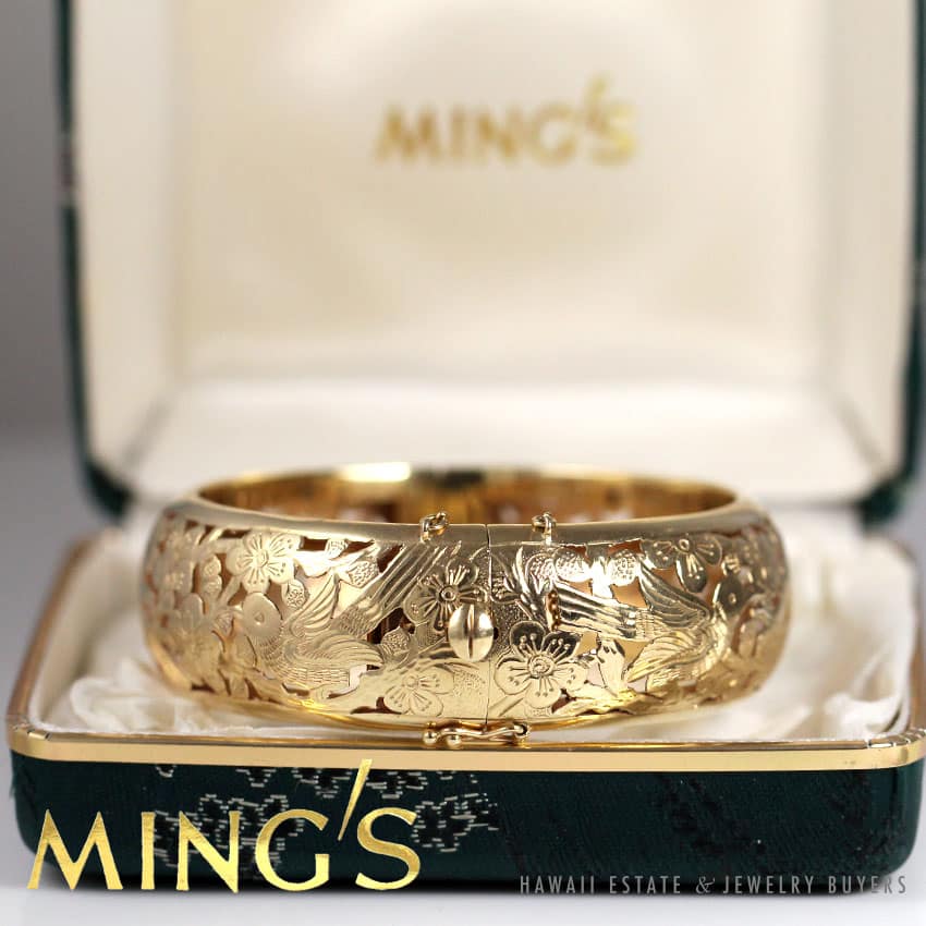 DescriptionApprox 6.5″ inside circumference when closed.STAMPED MING’S HK 14K$3,950.00Out of stockSKU: 2161-01Category: Pre-owned Ming's JewelryRelated StylesMing’s White Jade14K Yellow Gold Set$3,800.00Ming’s Hawaii Pale Green Jade 14K Yellow Gold Bangle Bracelet$6,830.00Ming’s Hawaii Pearl Cluster Flower 14K Ring$1,100.00Ming’s Hawaii Jade & Pearl 14K Brooch$1,690.00