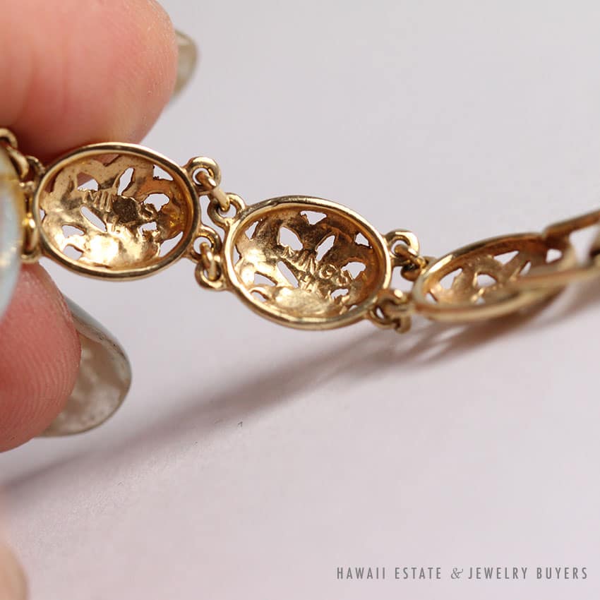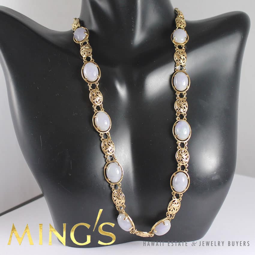 DescriptionSTAMPED: MING’S HK 14KPALE LAVENDER JADE OVAL CABOCHONS APPROX 11MMNECKLACE APPROXIMATELY 16″ LONG$5,990.001 in stockMING'S HAWAII RARE LAVENDER JADE CABOCHON LINK 14K YELLOW GOLD NECKLACE 16" quantityAdd to cartMake OfferSKU: LF021519-01Category: Pre-owned Ming's JewelryRelated StylesMing’s Hawaii Jade & Pearl 14K Brooch$1,690.00Ming’s Lavender Jade & Pearl Ring$3,600.00Ming’s Hawaii Pale Green Twin Jade Ball & White Pearl Ring$1,600.00Ming’s Hawaii Grey Jade Pearl Set$6,380.00
