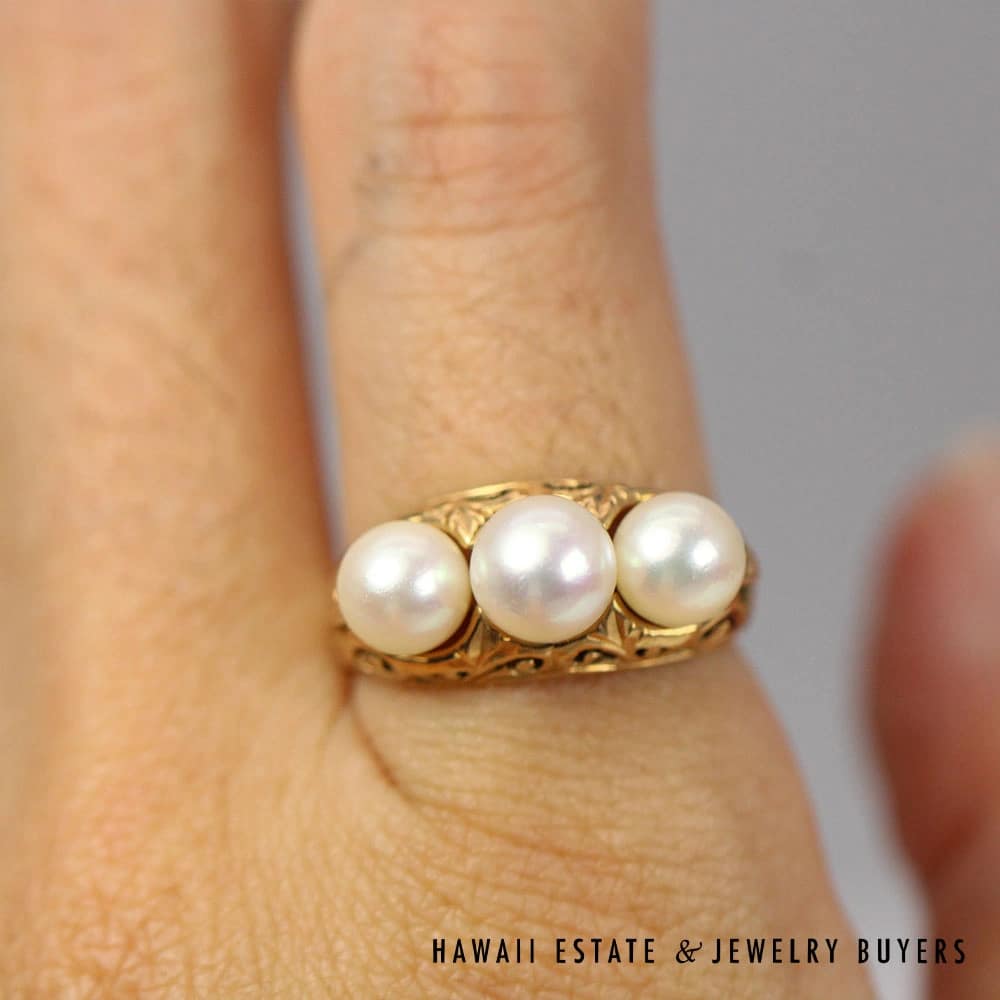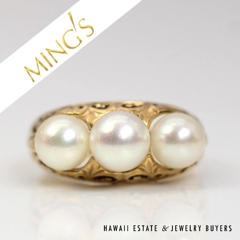 Stunning Ming’s Hawaii ring features three 6-6.5mm pearls with a beautiful side scroll design. Size 6.5, this ring is perfect for any vintage jewelry, pearl, or Ming’s Hawaii lover.