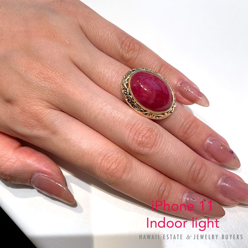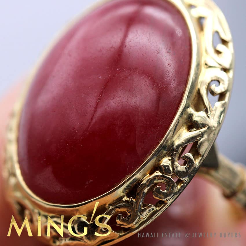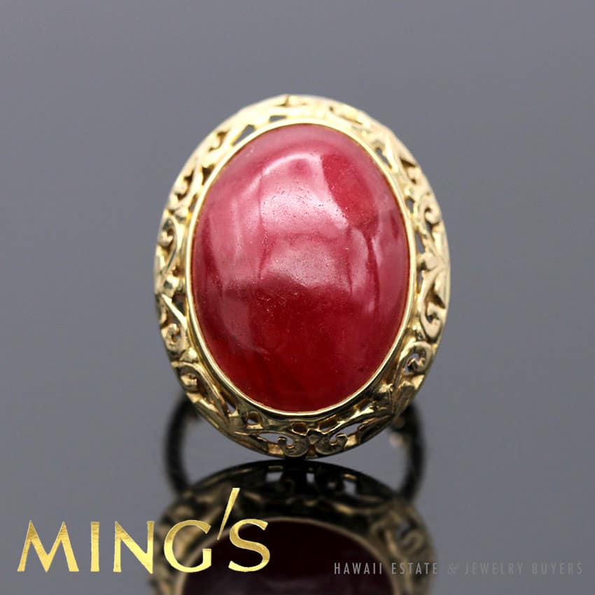 AUTHENTIC MING’S HAWAII VINTAGE RHODOCROSITE PINKISH-RED STONE MEASURES APPROX 22.21 x 16.41 x 6.69MM. THE STONE IS BEZEL SET WITH CUT-OUT SCROLL WORK AROUND THE STONE. THE RING IS 14K YELLOW GOLD STAMPED “MING’S 14K”.