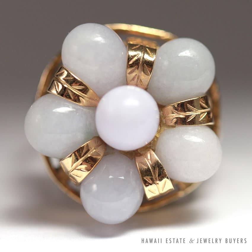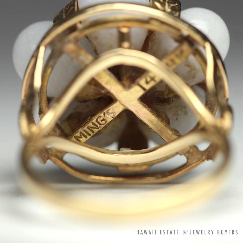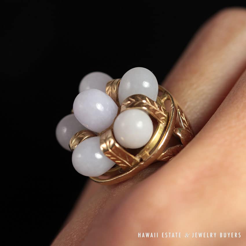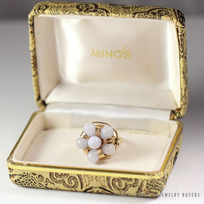 DescriptionSigned, authenticMetal: 14K Yellow GoldSize: 5.75Weight: 7.5gSKU: 1204-07$1,150.001 in stockMING'S HAWAII LAVENDER JADE 14K YELLOW GOLD CLUSTER RING (SZ 5.75) RARE W/ BOX quantityAdd to cartBuy withMake OfferSKU: 1204-07Category: Pre-owned Ming's JewelryRelated StylesMing’s Hawaii Bi-Color Jade Flower Ring$2,500.00Ming’s Hawaii Twin Jade Ball Pearl Ring$1,975.00Ming’s Hawaii Jade & Pearl 14K Brooch$1,690.00Ming’s Hawaii Pearl Cluster Leaf 14K Ring$1,600.00