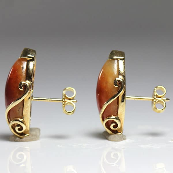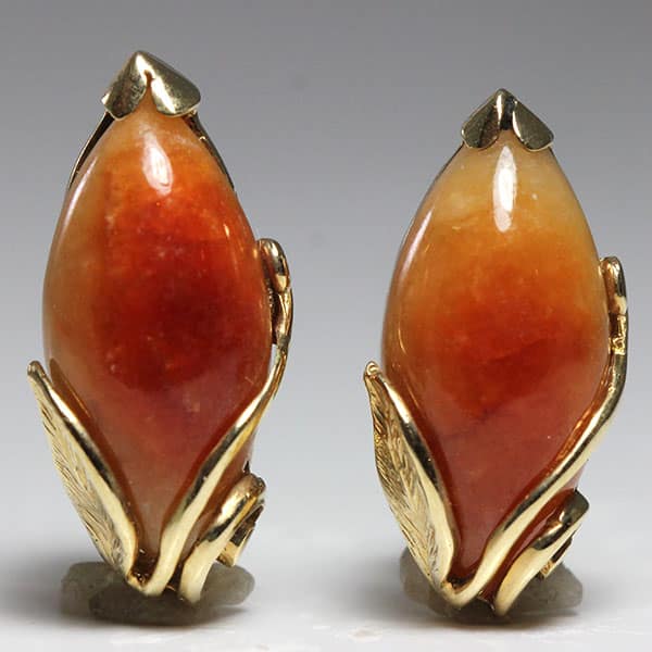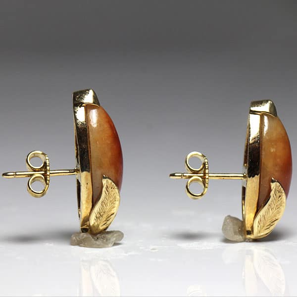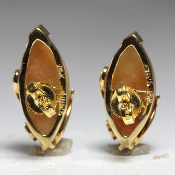 The earrings contain 2 matched navette shape brownish jades, measuring approx. 18.25 x 9.2mm. The jades are framed in styled leaves with a “v” prong top. The back has a pierced post and friction ear nuts. Weight: 7.4g