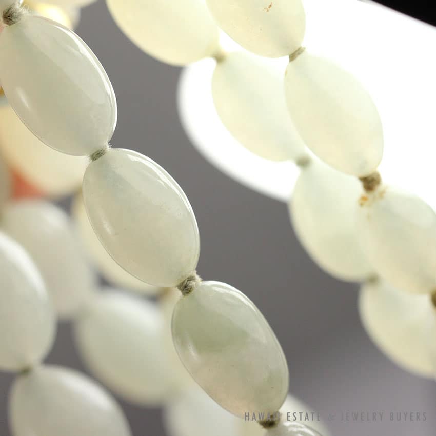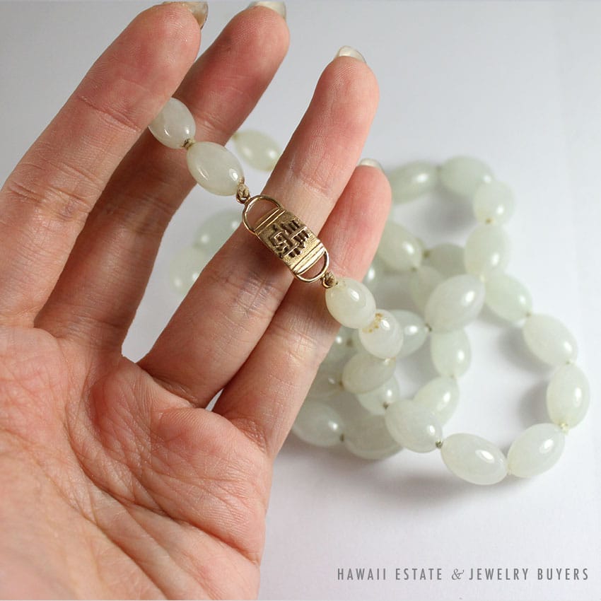 Descriptionitem is not stamped – identified as authentic Ming’s Hawaii$2,900.001 in stockMING'S OBLONG PALE GREEN JADE BEAD CHINESE 14K YELLOW GOLD NECKLACE 31.5" quantityAdd to cartMake OfferSKU: AS1204-01Category: Pre-owned Vintage JewelryRelated Styles1.65ct Natural Pink Sapphire and Diamond Ring$6,500.00Carved Pierced Bamboo Motif Jade 18K Yellow Gold Cufflinks$1,500.00Certified Grade A Mottled Green Graduated Bead Necklace$8,000.00Natural GIA Certified Ruby Diamond Ring$6,800.00