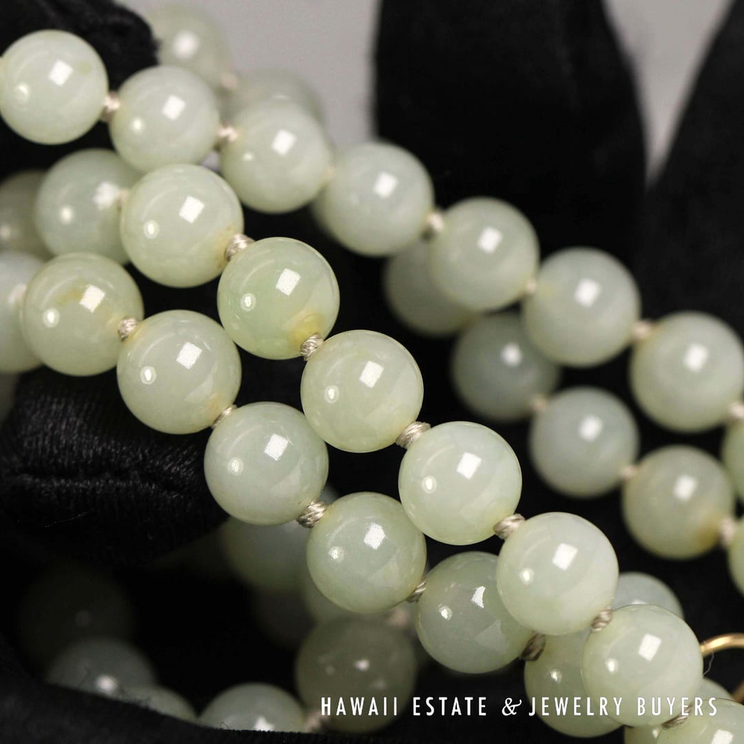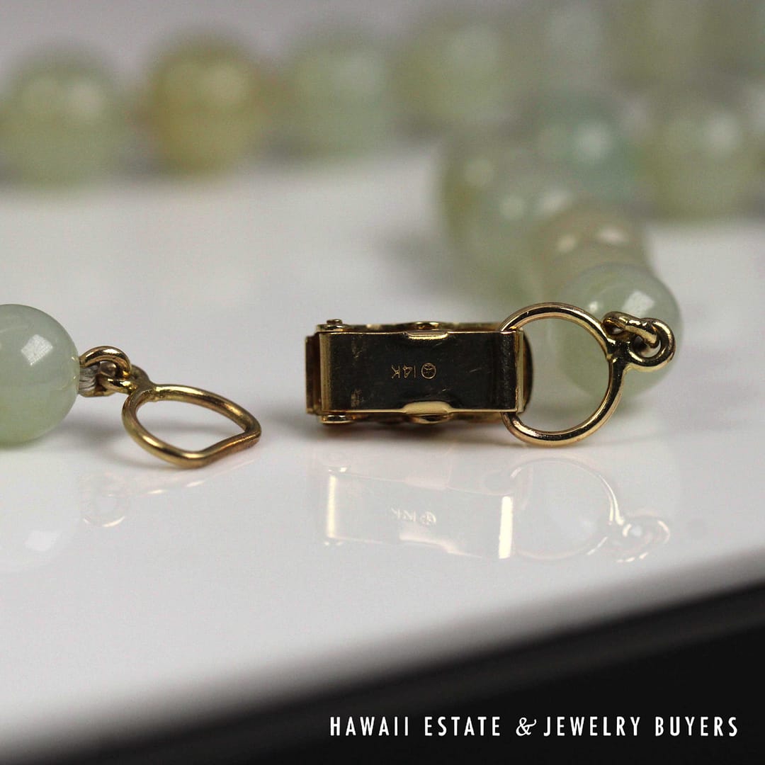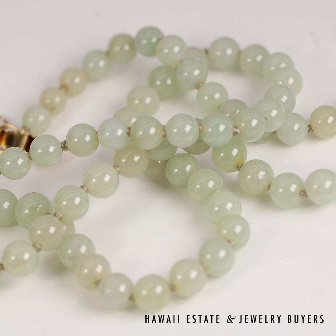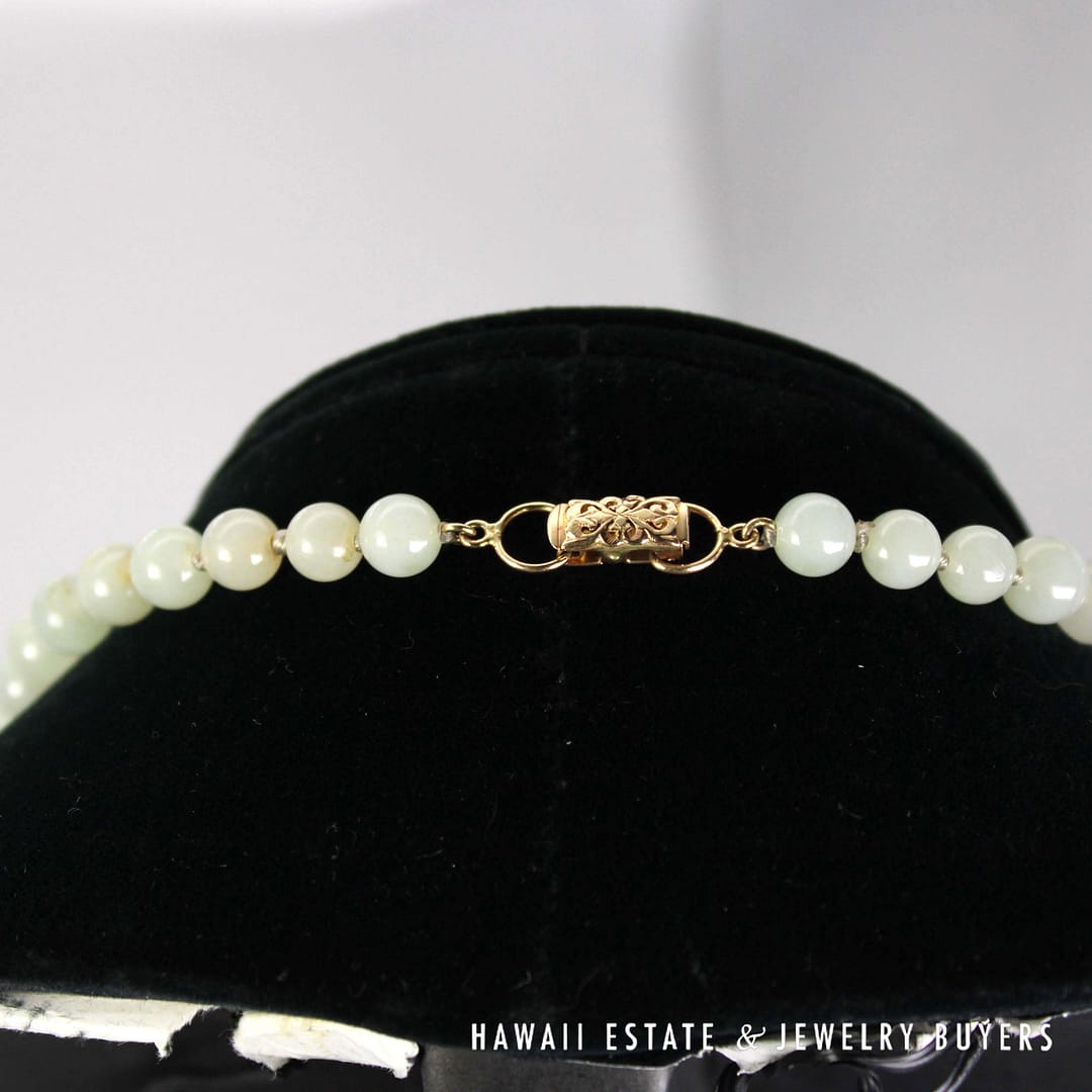 Elegant 27" pale green jade bead necklace with 14K yellow gold clasp – beautifully graduated from 7mm to 9mm for a timeless, sophisticated look.