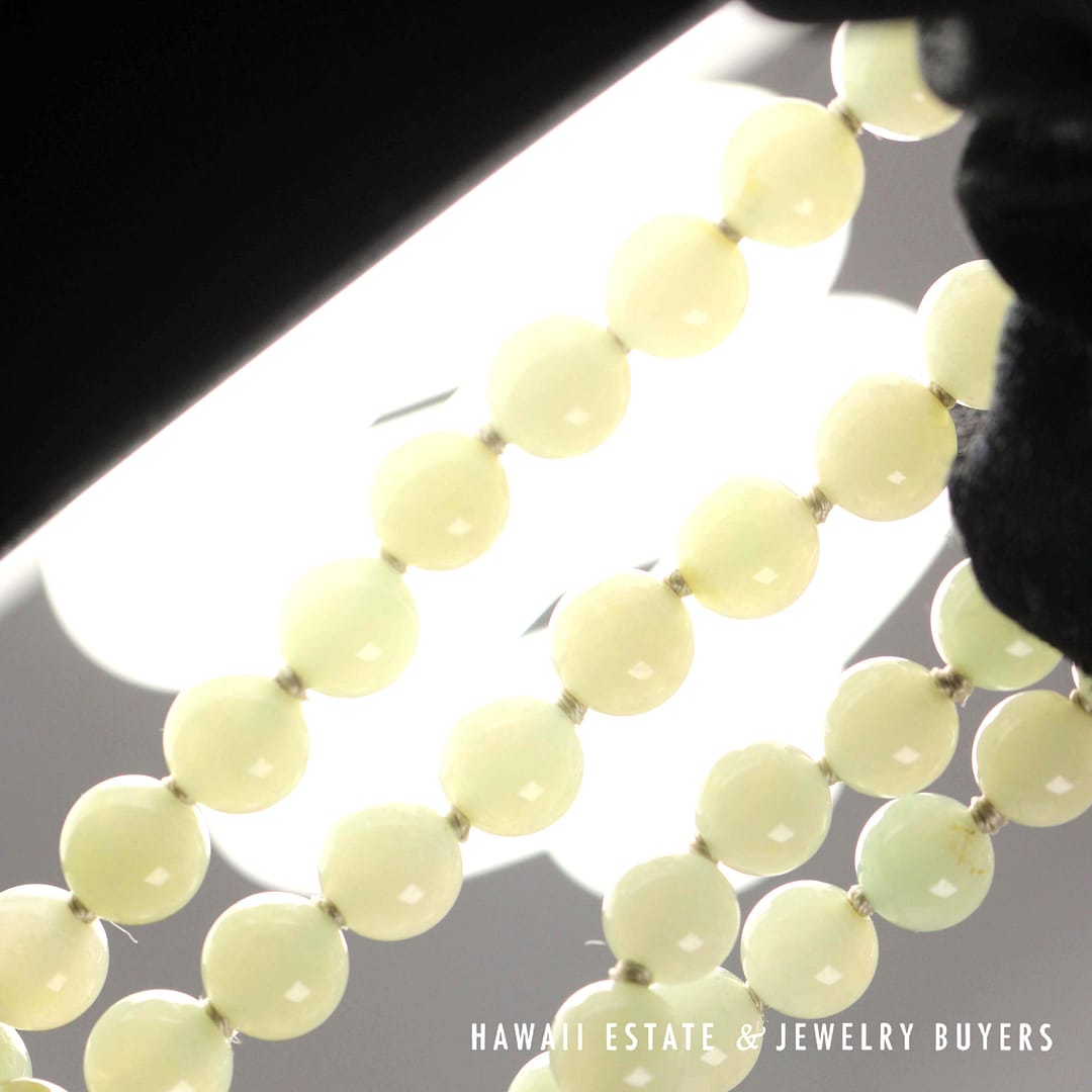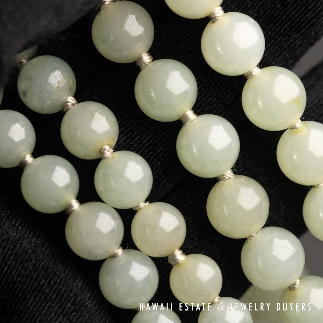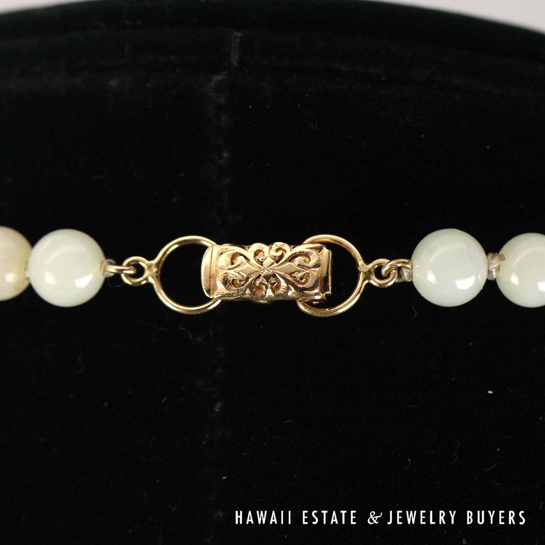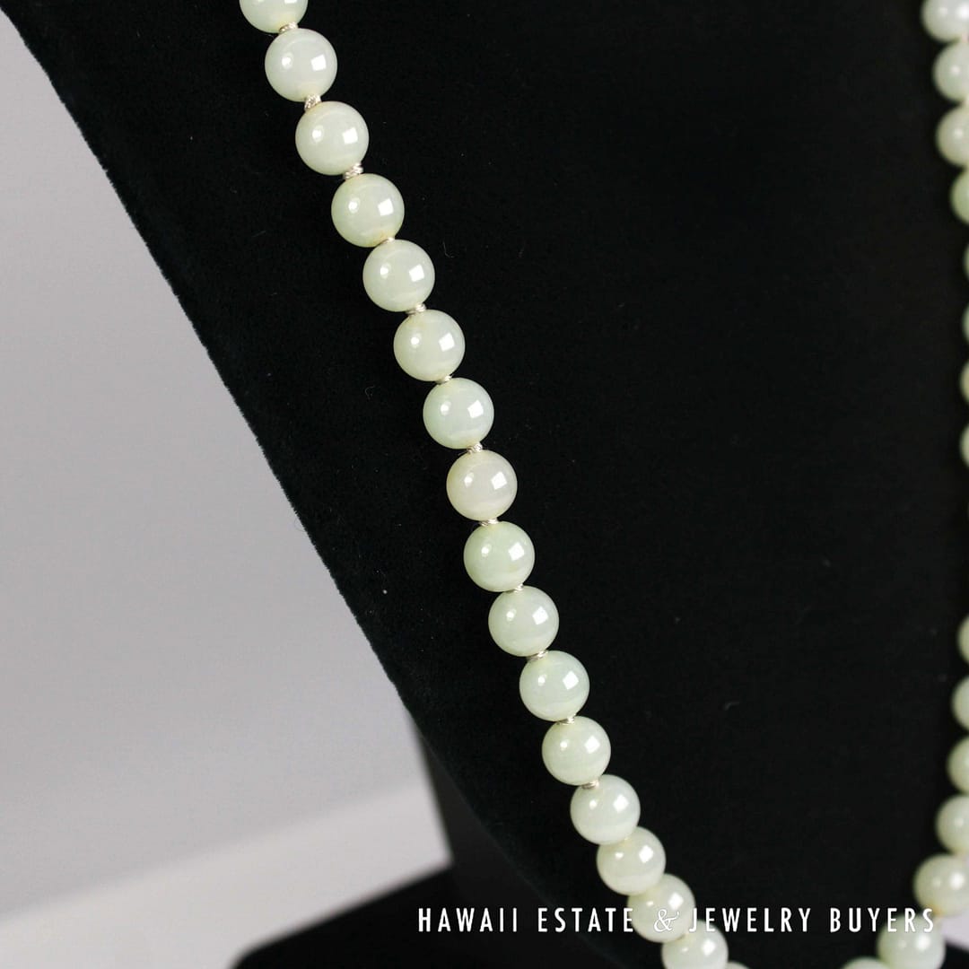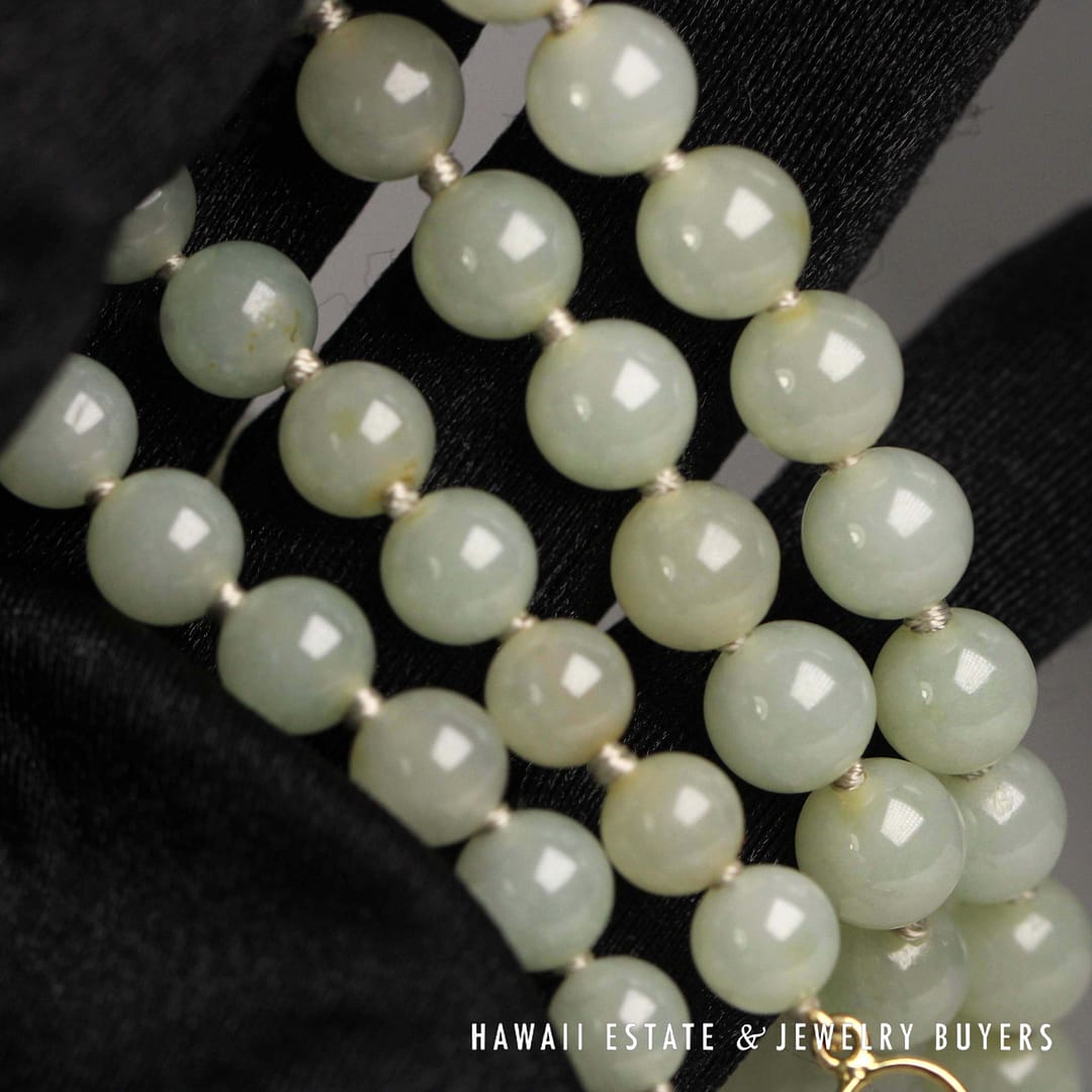 Elegant 27" pale green jade bead necklace with 14K yellow gold clasp – beautifully graduated from 7mm to 9mm for a timeless, sophisticated look.