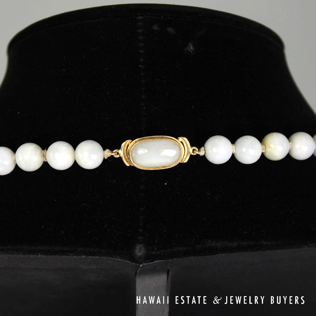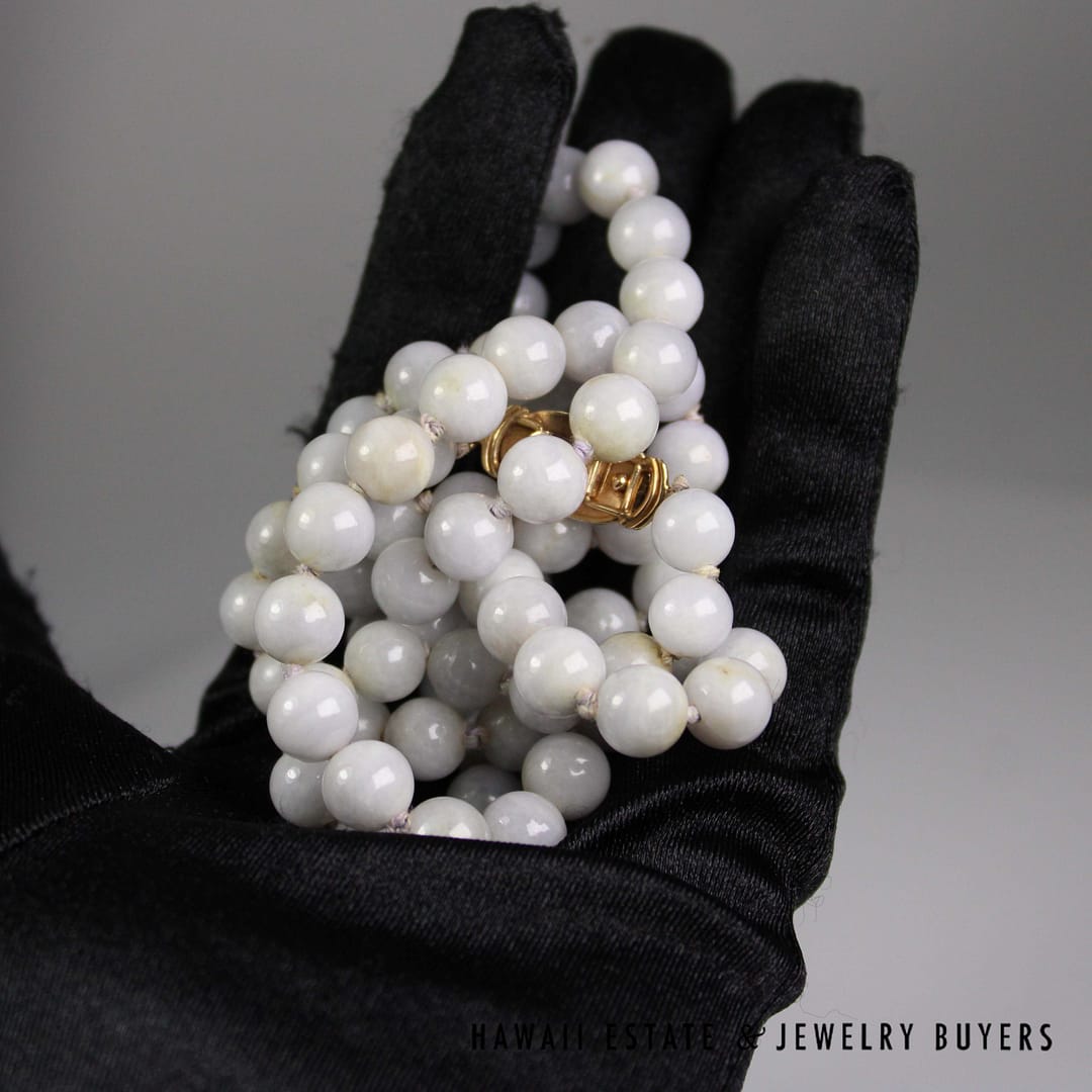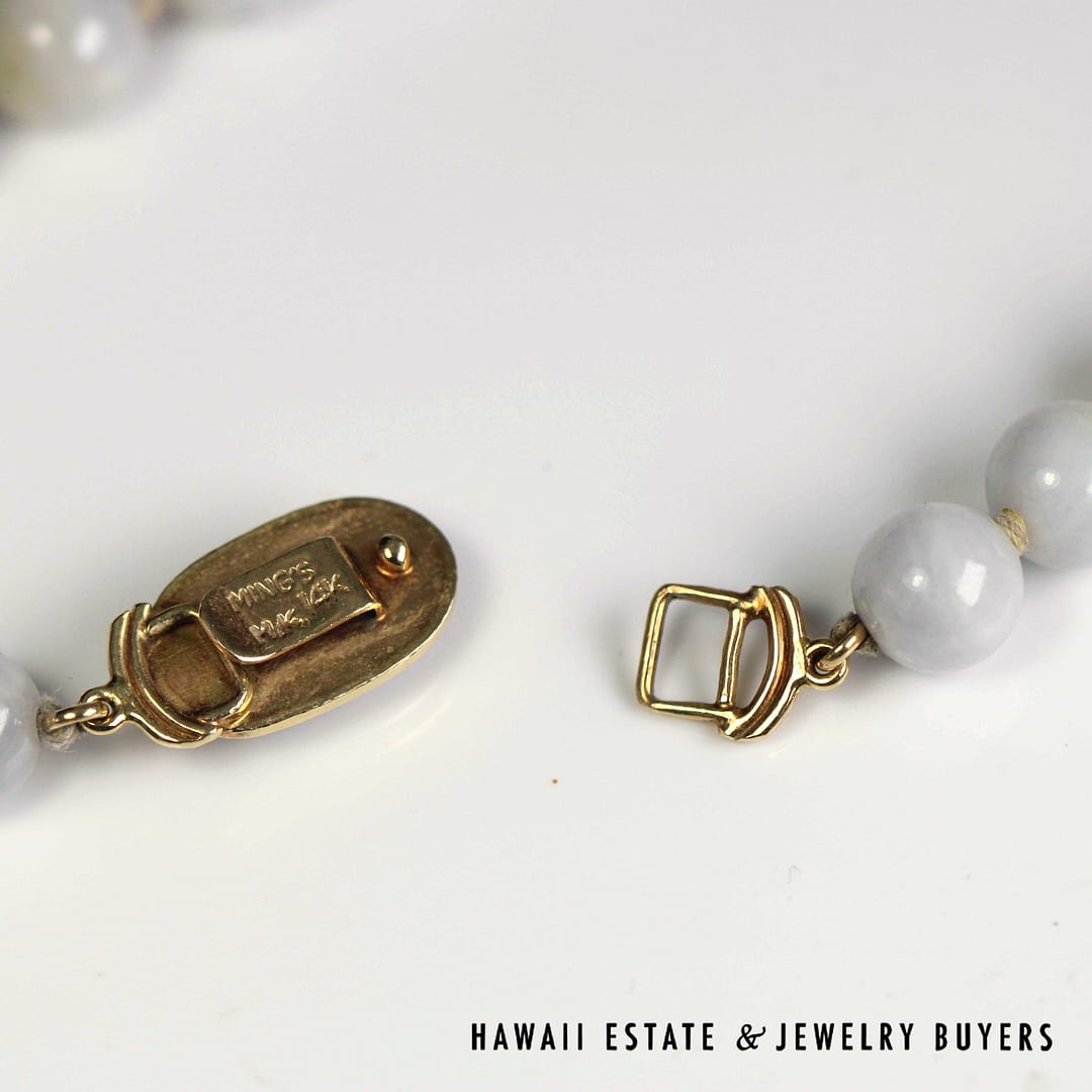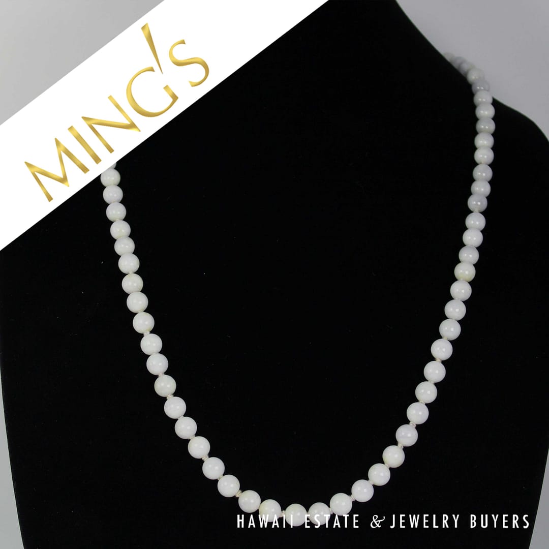 DescriptionBeautiful purple jade bead necklace by Ming's Hawaii measuring 30" with a 14K Yellow Gold clasp stamped MINGS H.K. 14KMING'S 14KYG PALE LAVENDER JADE 9mm BEAD NECKLACE 30" (SU091820-04) $1,300.001 in stockMing's Pale Lavender Jade 9mm Bead 14k Yellow Gold Necklace 30" quantityAdd to cartMake OfferSKU: SU091820-04Category: Pre-owned Ming's JewelryRelated StylesMing’s Hawaii Bi-Color Jade Flower Ring$2,500.00Ming’s Hawaii Oval Carved Flower Large Jade 14K Yellow Gold Ring$1,800.00Ming’s Hawaii Jade Cabochon Pearl Ring$2,975.00Ming’s Hawaii Pearl Cluster Flower 14K Ring$1,100.00