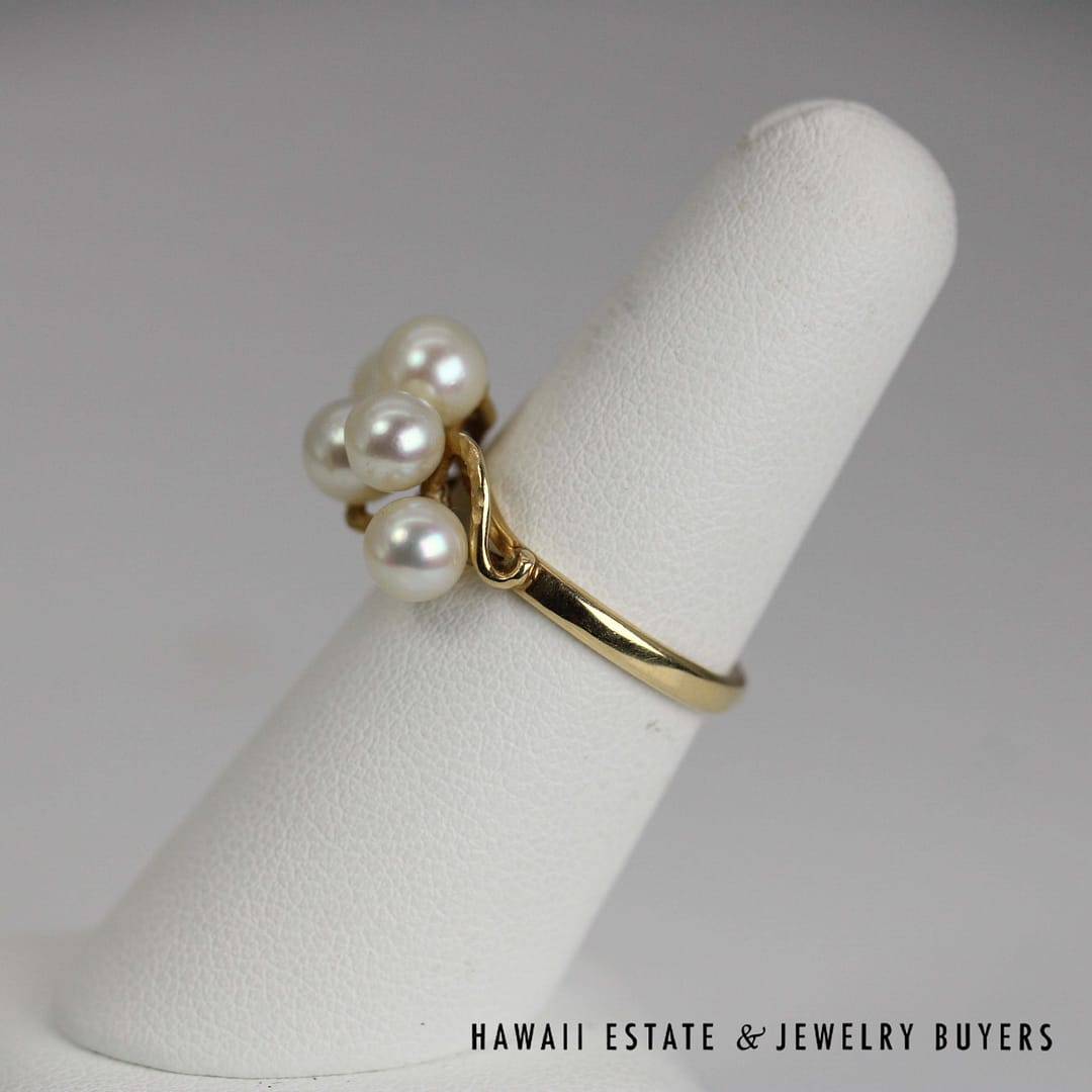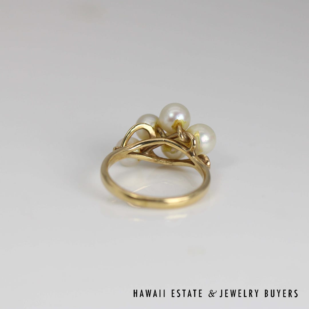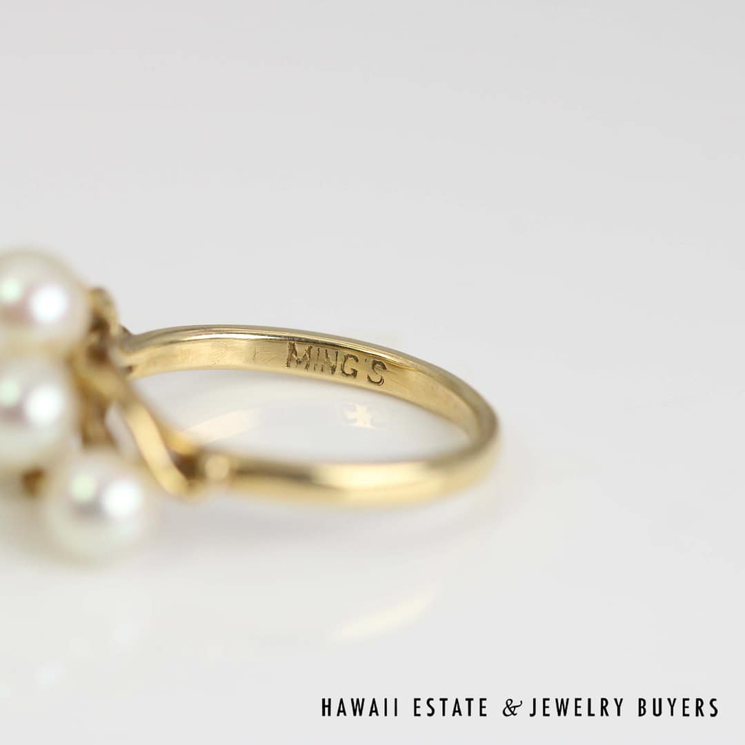 This beautiful Ming's ring showcases a classic pearl cluster design set in 14 karat yellow gold, sized at 7 for an elegant and timeless statement piece.