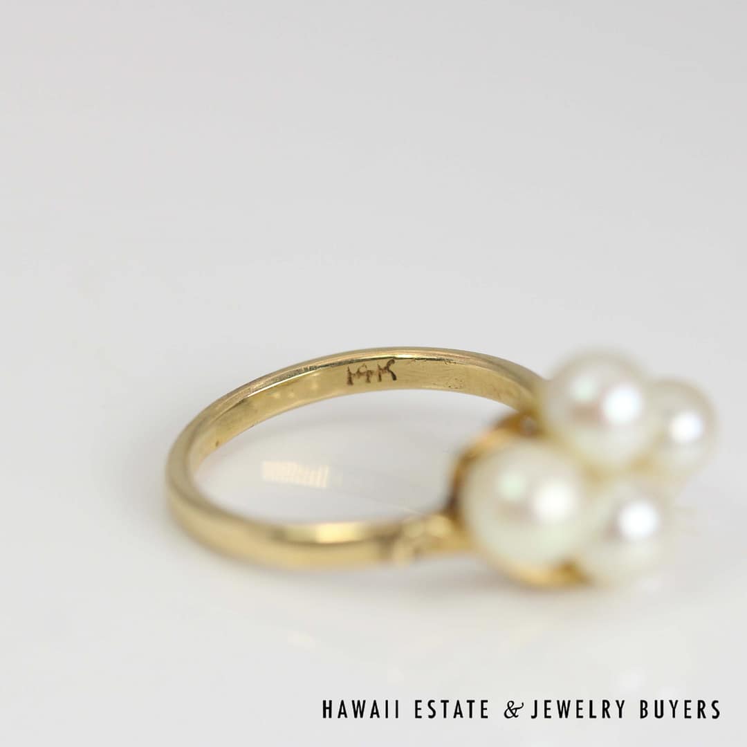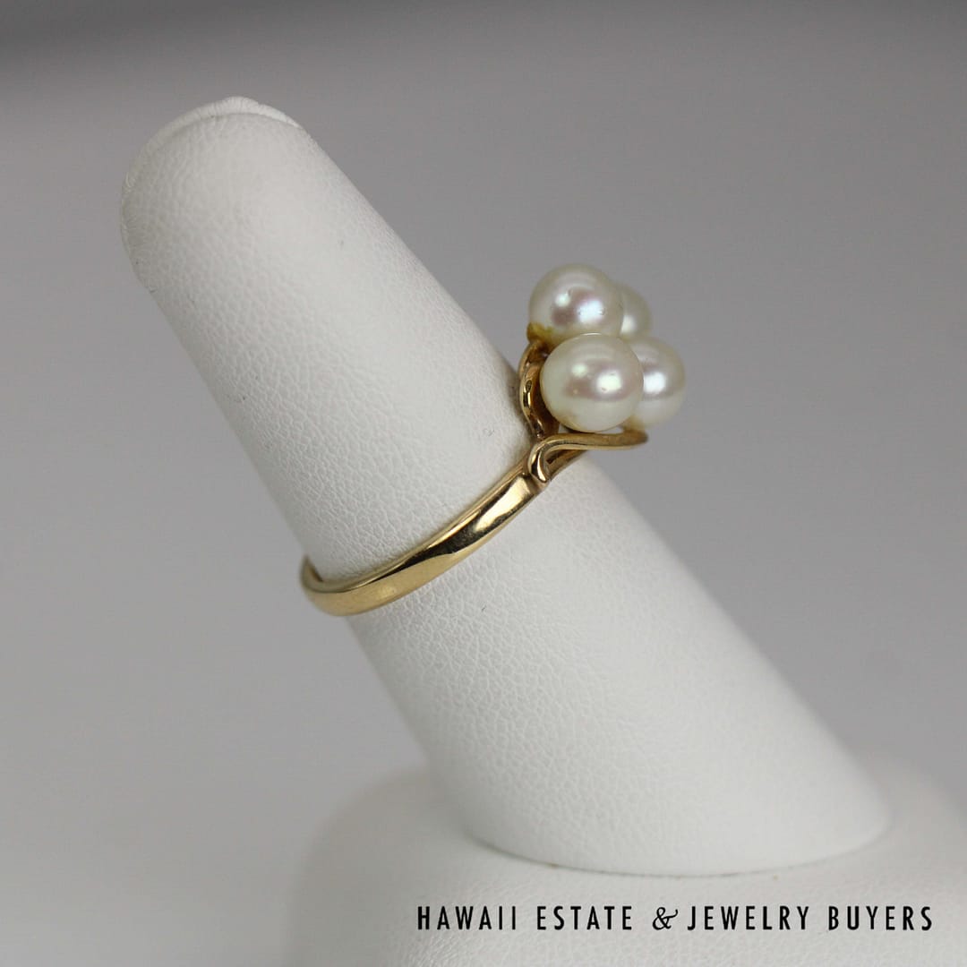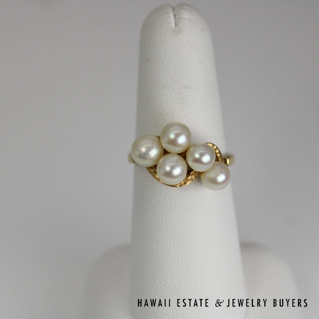 This beautiful Ming's ring showcases a classic pearl cluster design set in 14 karat yellow gold, sized at 7 for an elegant and timeless statement piece.