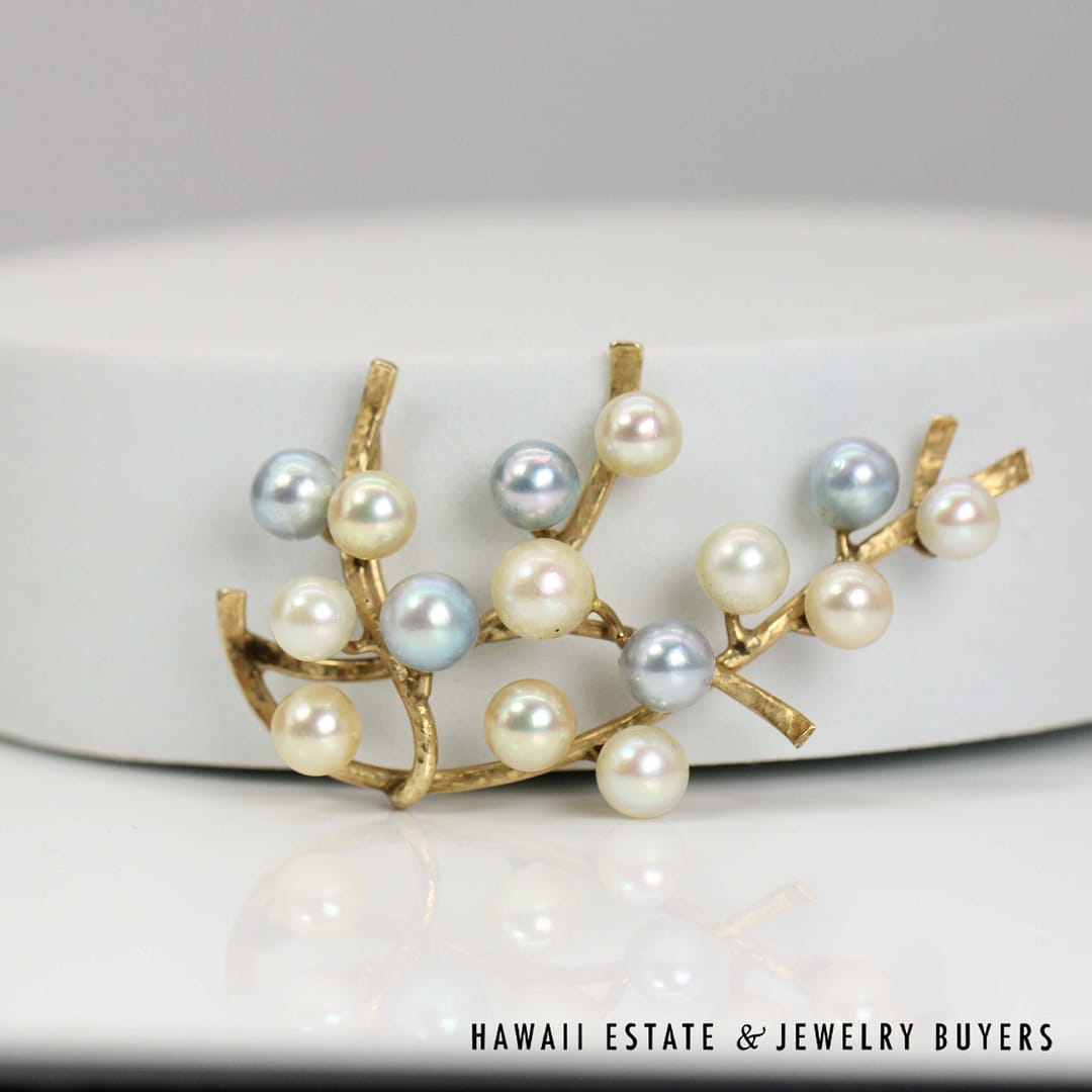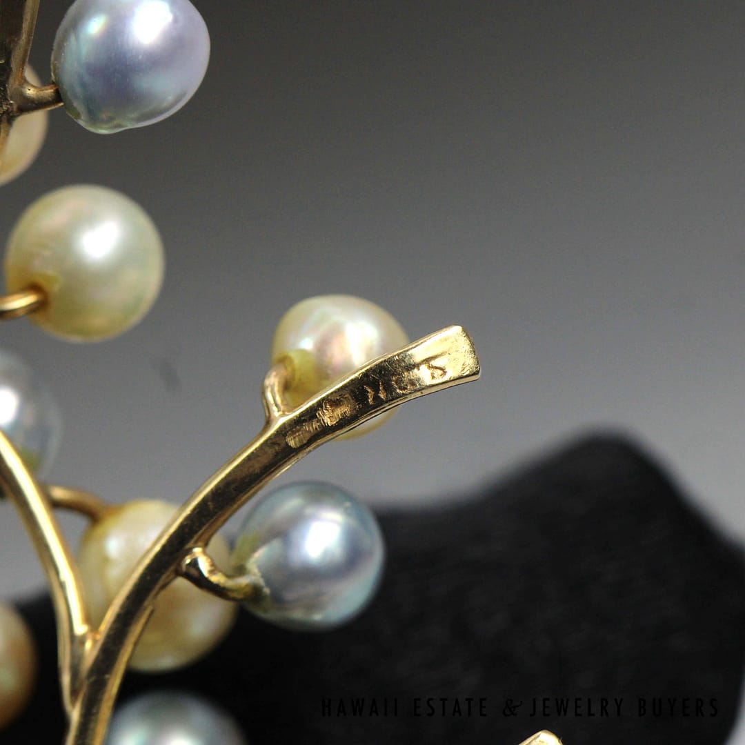 Artistic and bold, this Ming's pendant showcases white and blue pearls in a 57x35mm 14k yellow gold setting. Weighing 10.8g, it offers distinctive charm.