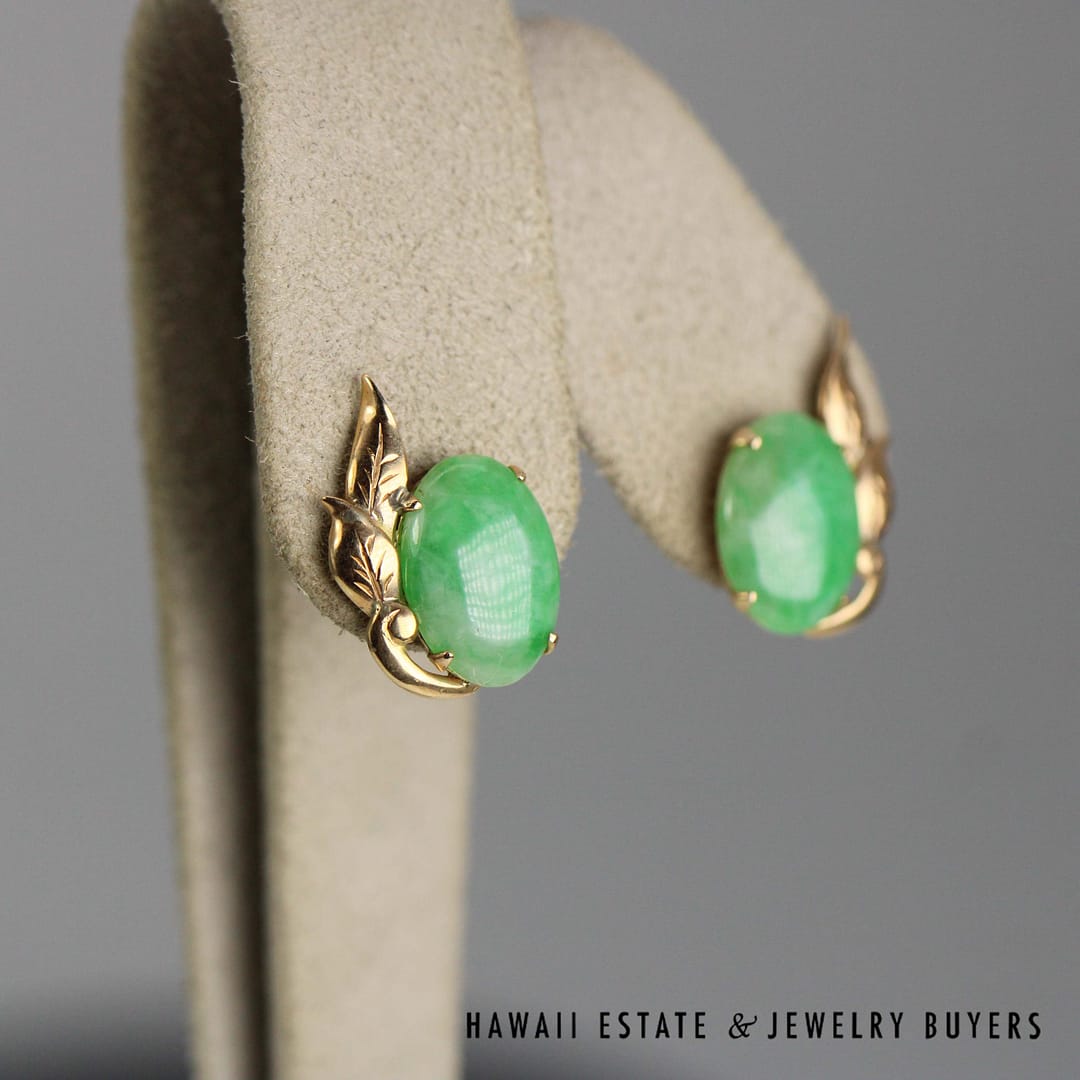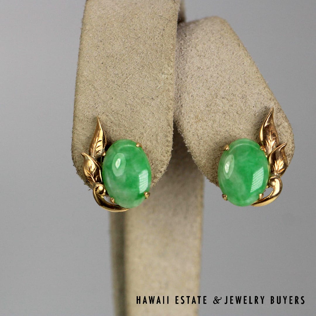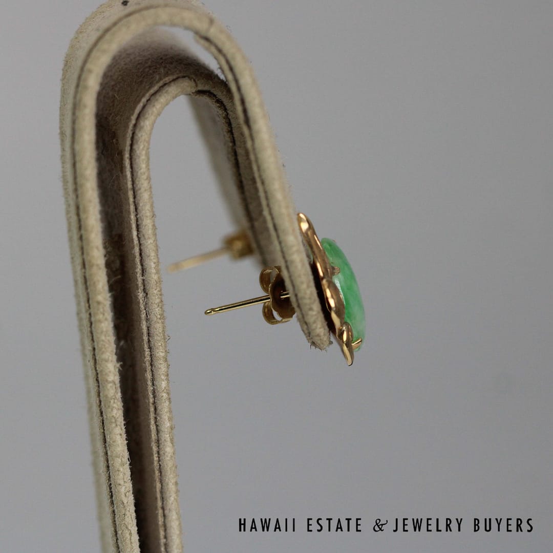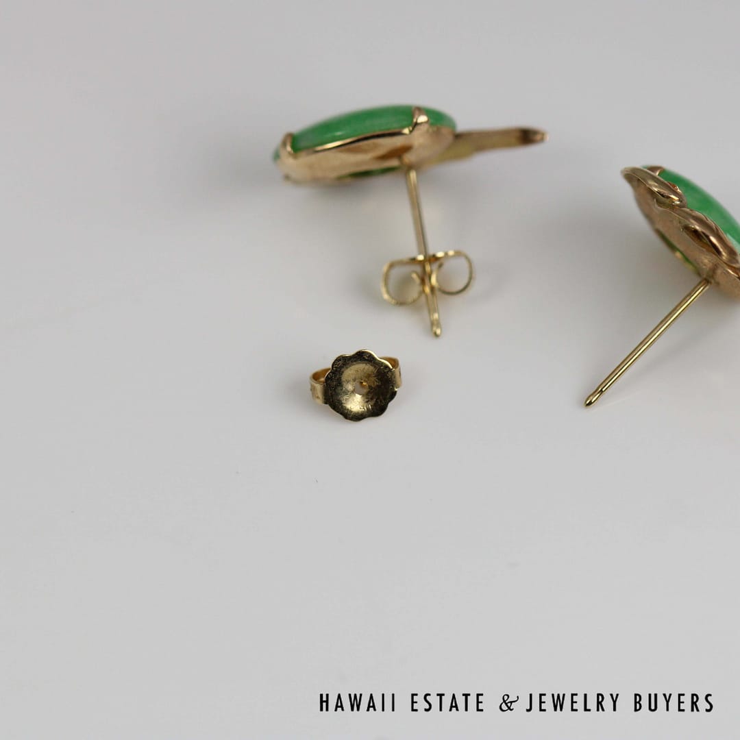 Add a touch of natural beauty to your ensemble with these 14K yellow gold earrings, showcasing 14x10mm oval cabochons of richly mottled green jade for a look that's both earthy and elegant.