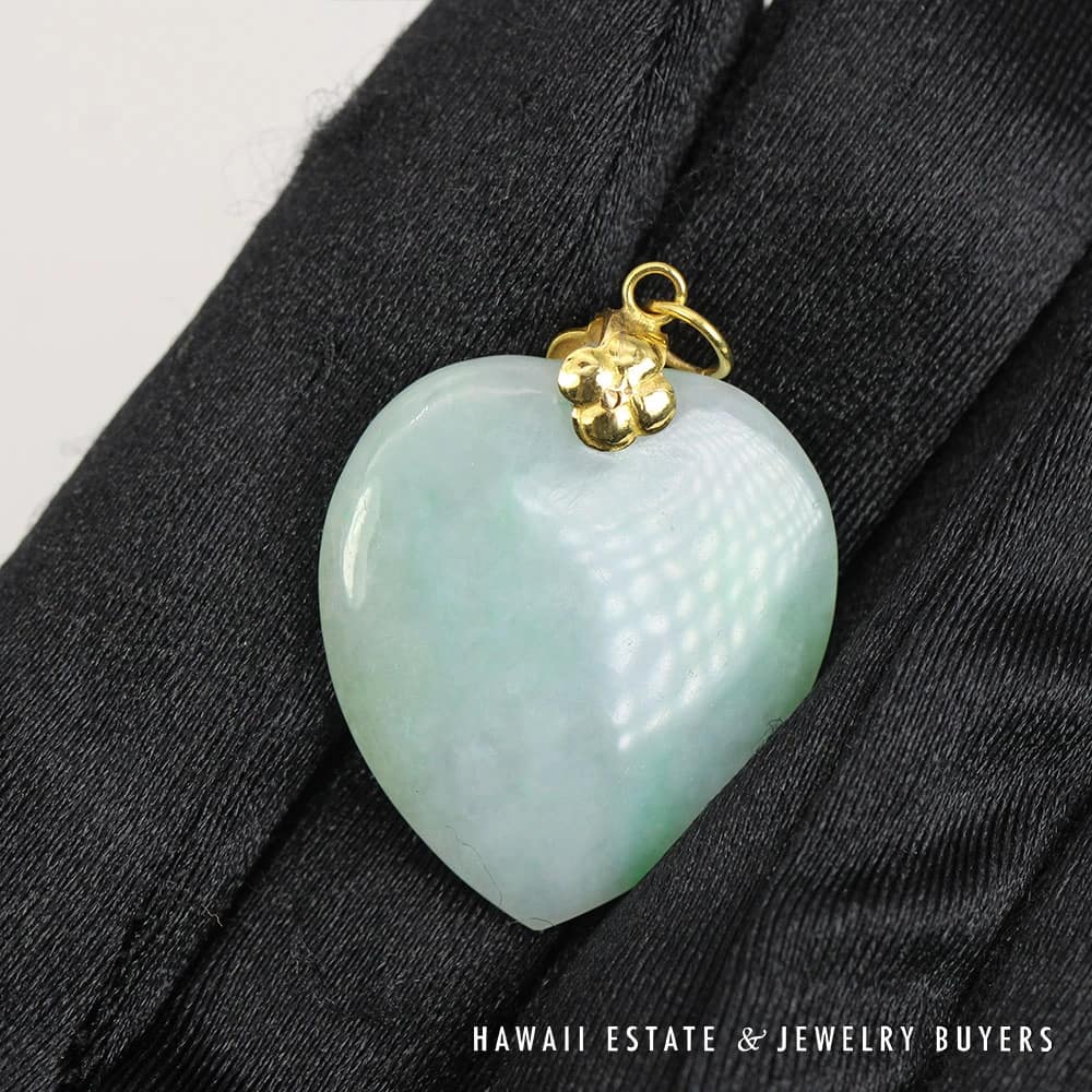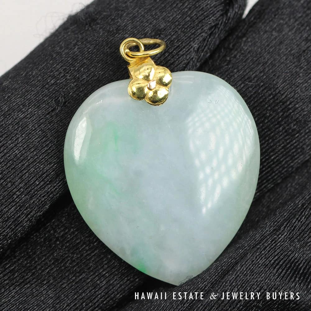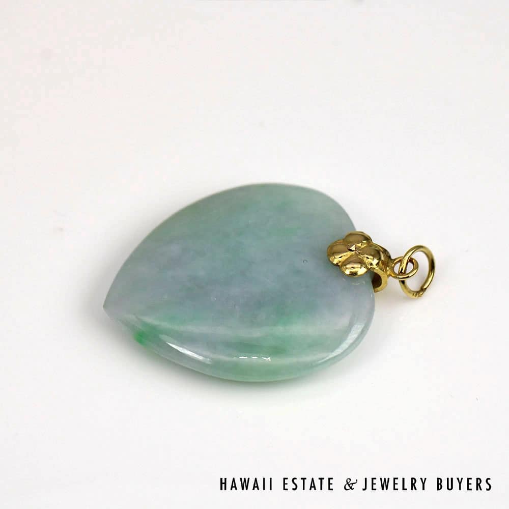 DescriptionA vintage heart shield pendant with 14K Yellow gold clasp.3012-04 7g 14KYG Mottled Green & Lavender Heart Pendant Measures 22 X 20m$790.001 in stockMottled Green & Lavender Heart 7g 14K Yellow Gold Pendant Measures 22 X 20m quantityAdd to cartBuy withMake OfferSKU: 3012-04Category: Pre-owned Jade JewelryRelated StylesGIA 4.2g 14KWG 13x10MM OVAL GREEN CABOCHON JADE 0.50ctw DIAMOND RING SIZE 5$3,100.00GIA 44g 14KYG MOTTLED GRAY AND ORANGY BROWN JADE WITH DRAGON MOTIF$6,700.005.4g 14KYG GREEN JADE MARQUISE CABOCHON PENDANT$499.009.3g 14KYG JADE DONUT 16mm DIAMETER CUFFLINKS$1,400.00