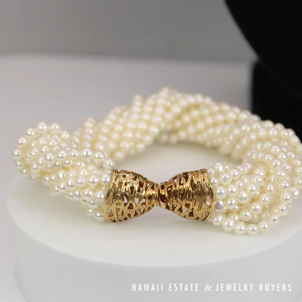 205g 14KYG MULTI STRAND PEARL SET 22″ NECKLACE & SIZE 6.5 BRACELET WITH PIERCED BEEHIVE CLASPS (3030-01)