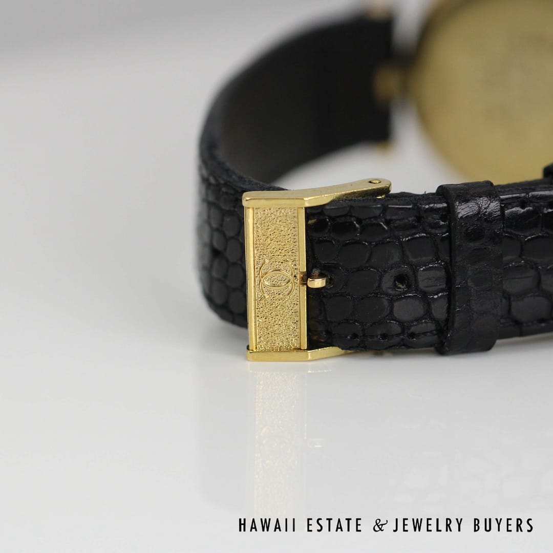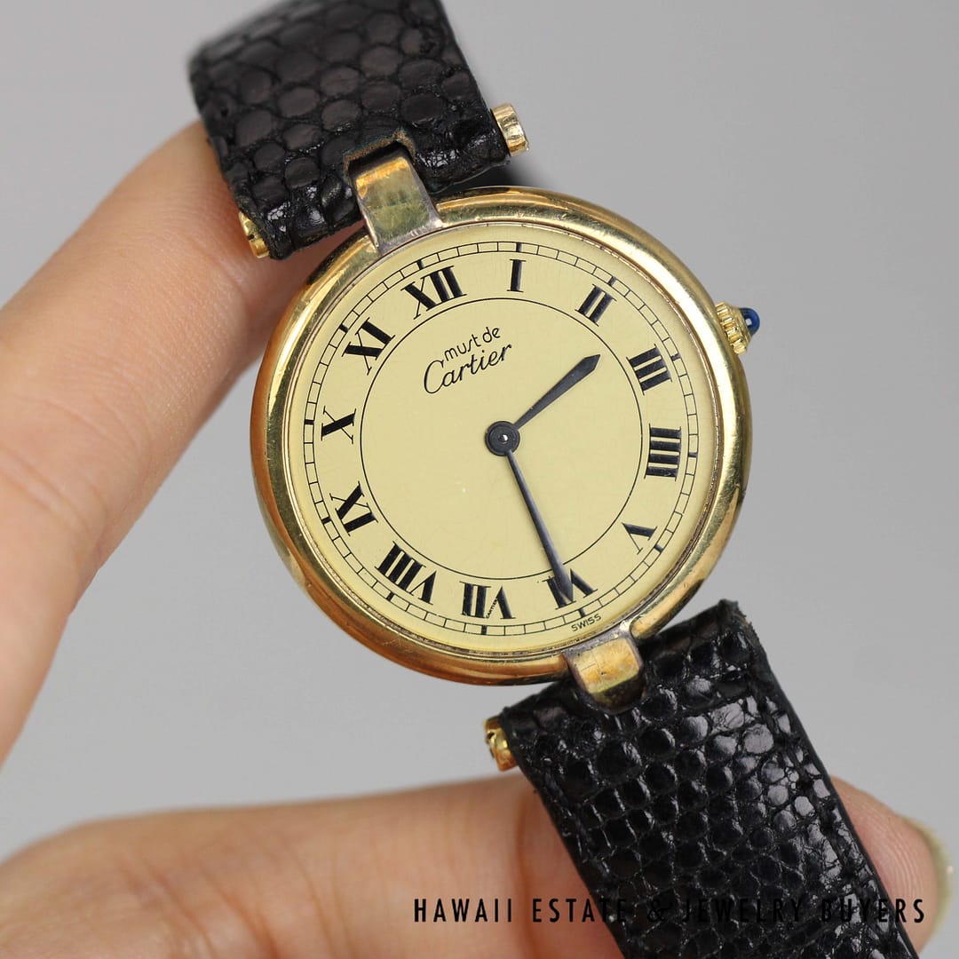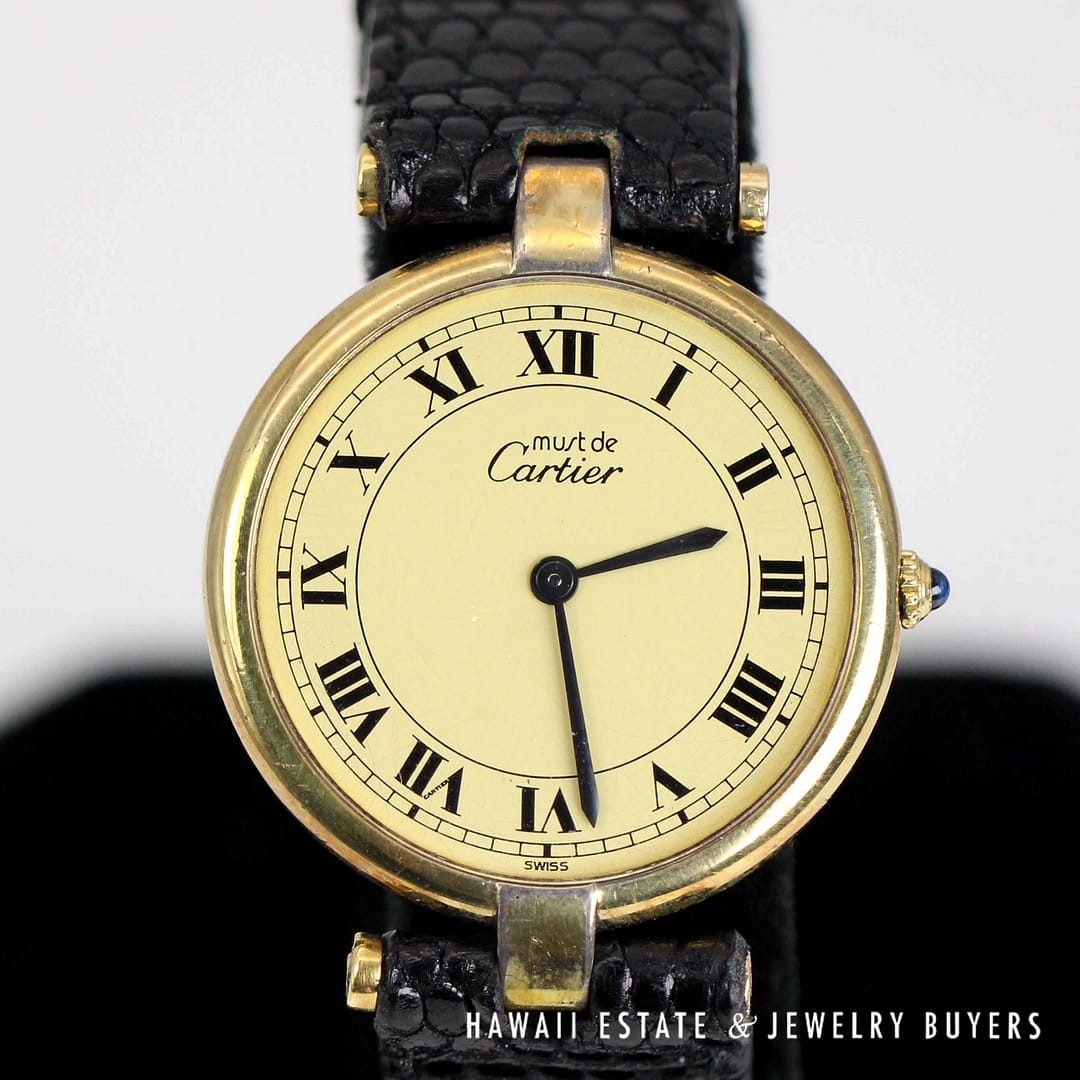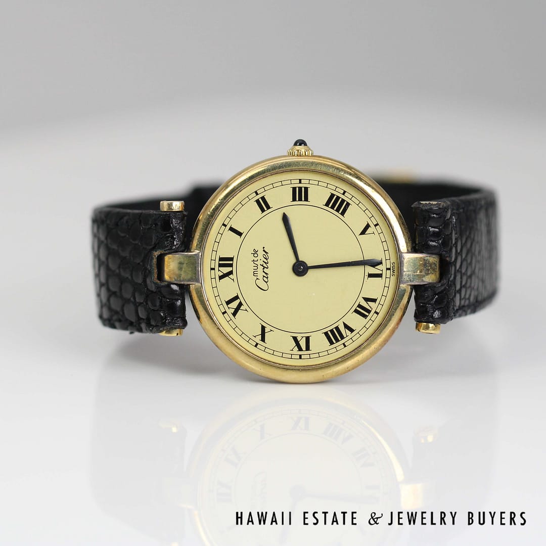 Experience timeless sophistication with this Must De Cartier vermeil watch featuring a classic round dial and elegant Roman numerals, a true icon of refined style.