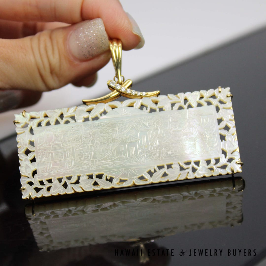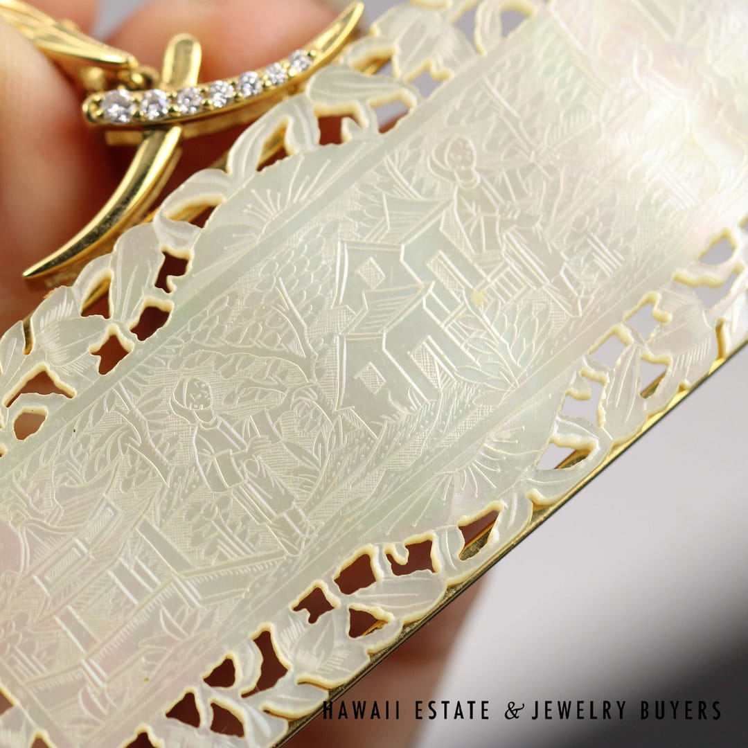 A beautiful rare pendant featuring intricate carvings in rare Mother of Pearl. Embellished with 0.12ctw of diamonds on the bale, the pendant measures 70x49mm and is set in 18K Yellow Gold. A gorgeous piece.