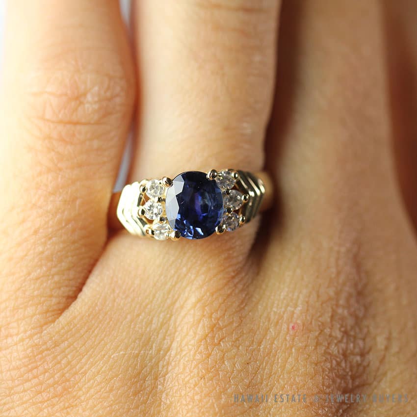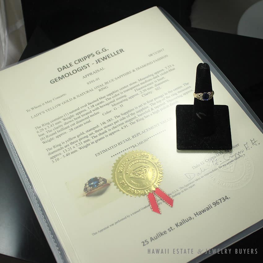 DescriptionPlease refer to included gemologist appraisal:– natural oval faceted blue sapphire approx 1.38CTW– 6 round brilliant diamond melee approx 0.28CTW G – H, SI2ESTIMATED RETAIL REPLACEMENT VALUE: $4,160$4,000.001 in stockNATURAL BLUE SAPPHIRE & DIAMOND 14K YELLOW GOLD RING W/ GEMOLOGIST APPRAISAL quantityAdd to cartMake OfferSKU: ST01-01Category: Pre-owned Vintage JewelryTag: sapphireRelated StylesNatural Lavender Cabochon Pendant$2,300.00Certified Nephrite Jade White Hollow Cylinder$3,700.00Certified Jade White Carved Bangle Bracelet$5,300.00Natural GIA Certified Ruby Diamond Ring$6,800.00