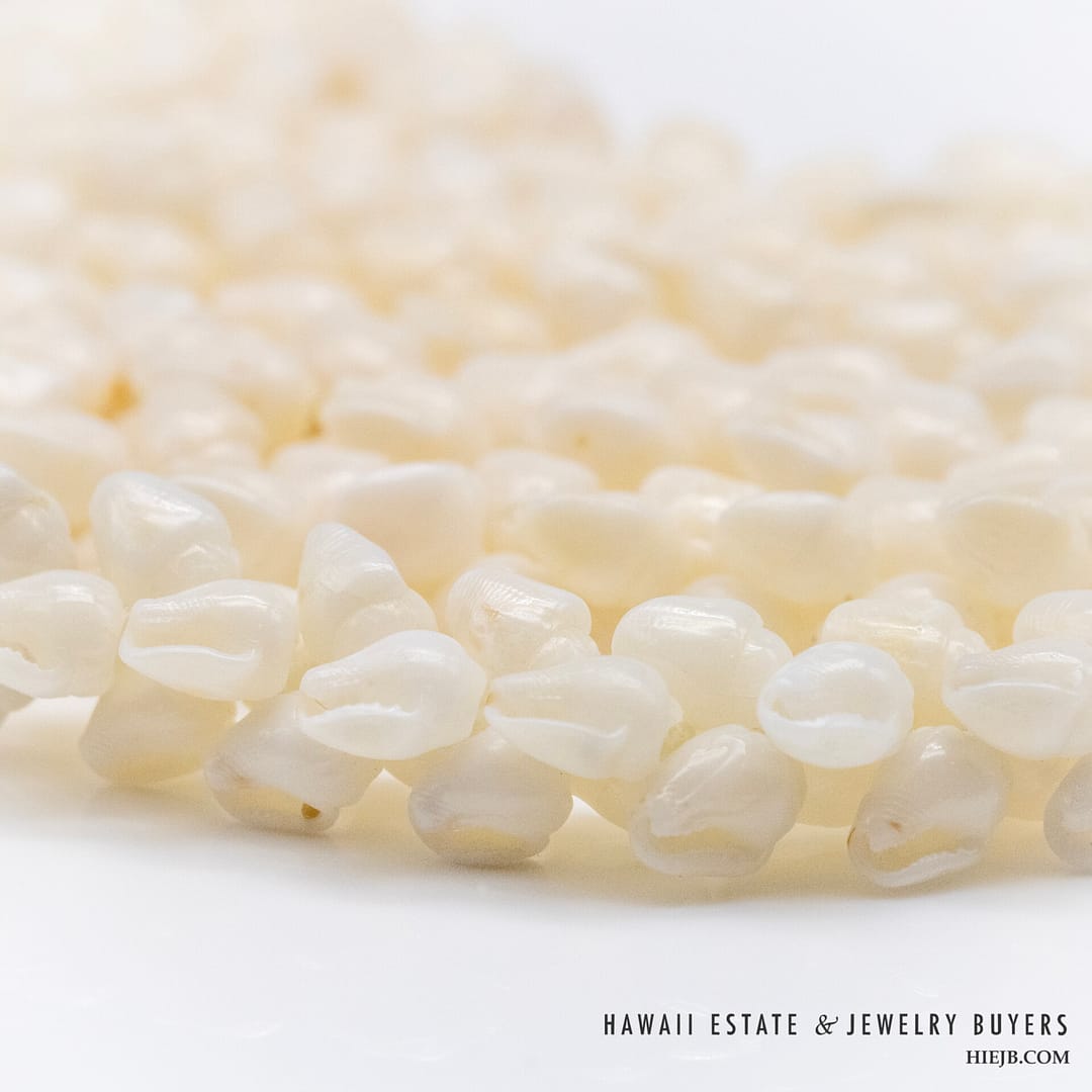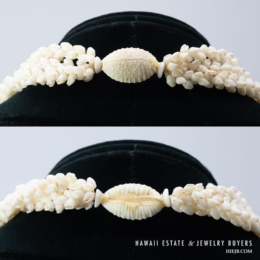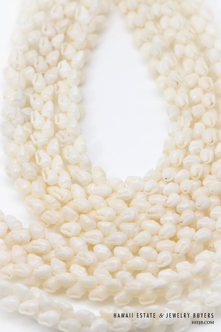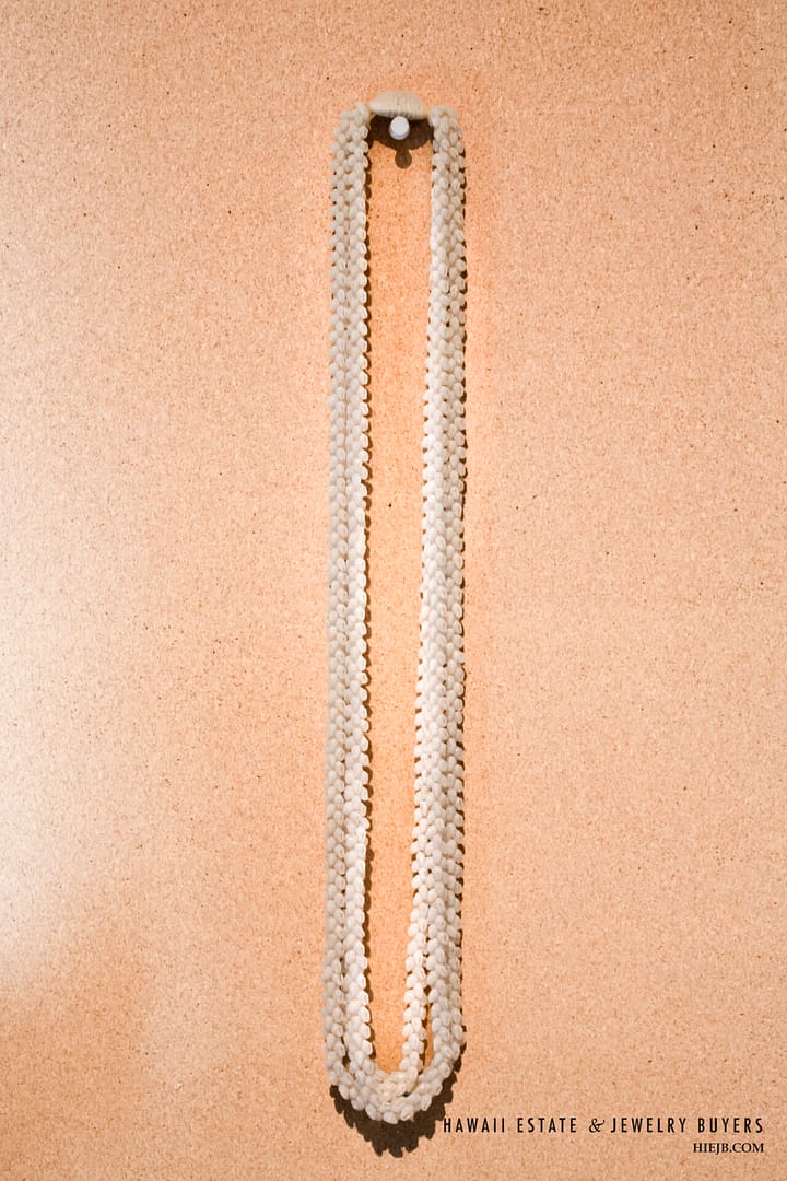 DescriptionNi’ihau shell lei is triple strand Pikake momi ke’oke’o maika’i with poleho apu’upu’u.Length is 36 inches.$7,500.00NI'IHAU SHELL LEI 3 STRAND PIKAKE MOMI KE'OKE'O MAIKA'I 36 INCH quantityAdd to cartBuy withMake OfferSKU: 030923-08Category: Pre-owned Vintage JewelryTags: NIIHAU, NIIHAU SHELL, NIIHAU SHELL LEIRelated StylesGIA Grade A Nephrite Jade Twist Bangle$3,500.00Certified Twisted White Nephrite Jade Bangle$6,000.00Vintage Fire Opal & Diamond 18K Ring$7,000.00Carved Pierced Bamboo Motif Jade 18K Yellow Gold Cufflinks$1,500.00