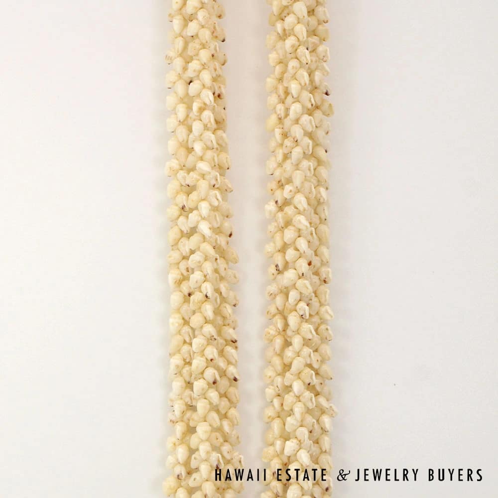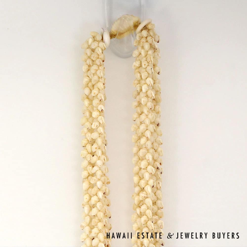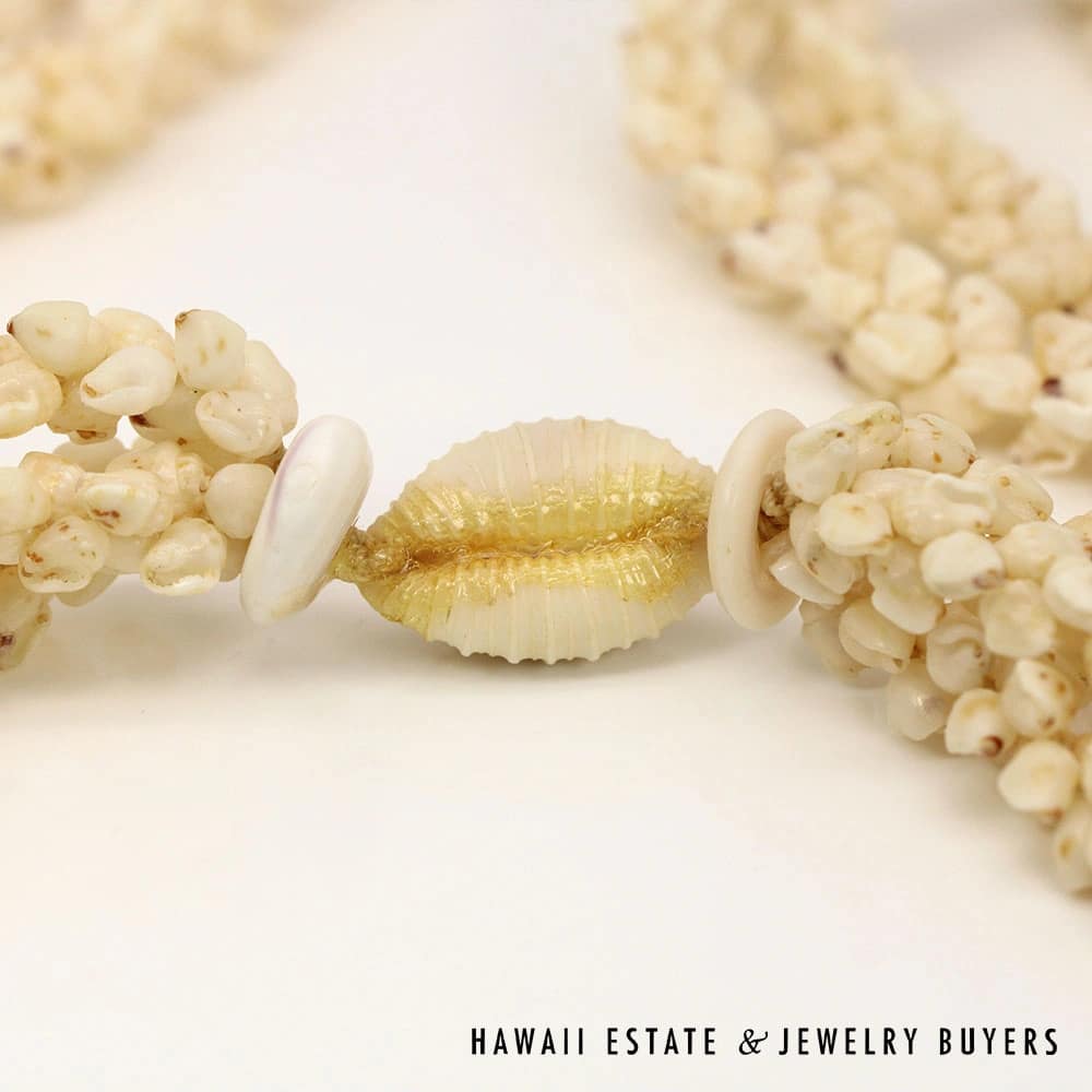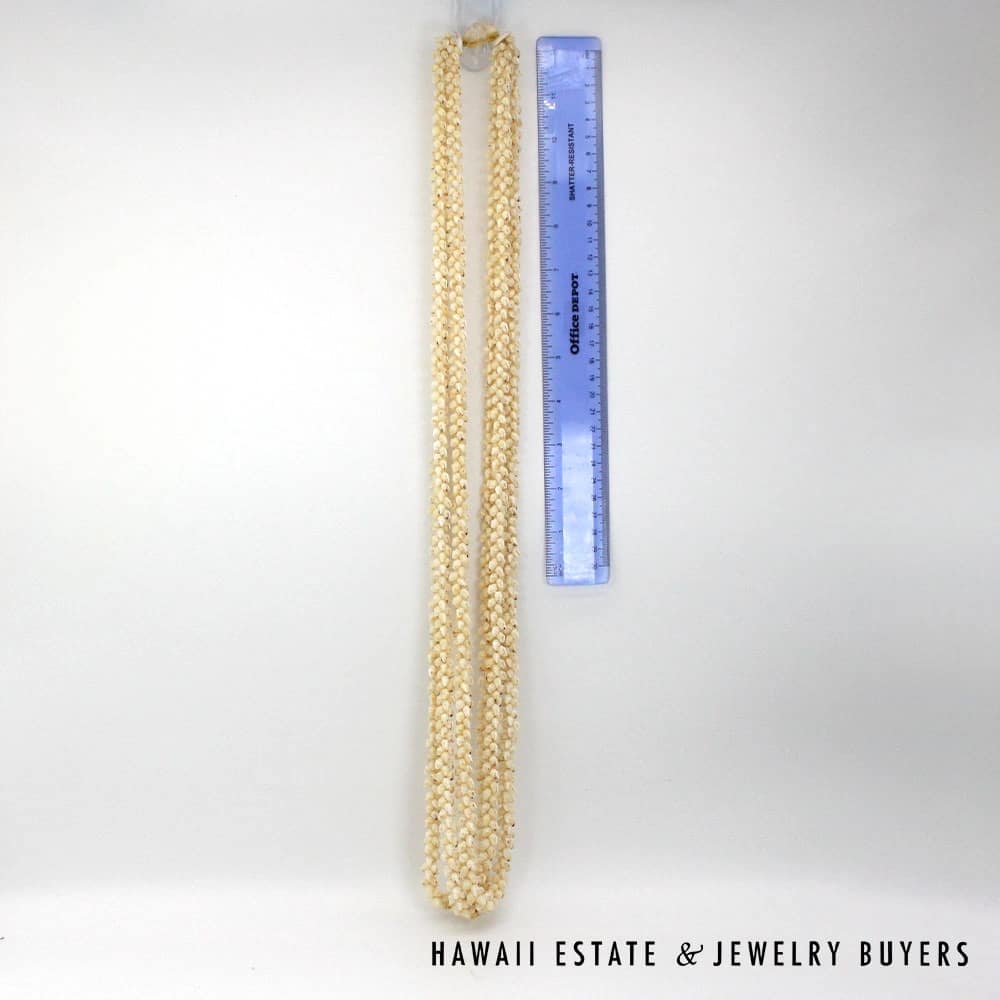 All shells are of the Momi (Dove shell) variety with Lenalena (slightly yellow/off-white) coloring. The strands are connected by a 22mmX15mm Pōleholeho (decorative shell which ties the ends of each strand together) of the ‘Āpu’upu’u (bumpy cowrie) variety with superbly-matched color.