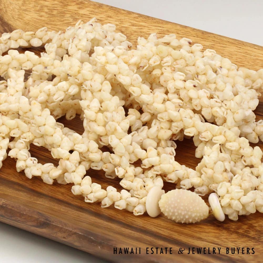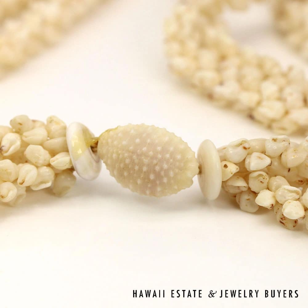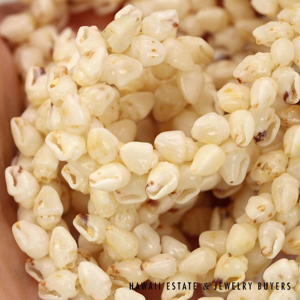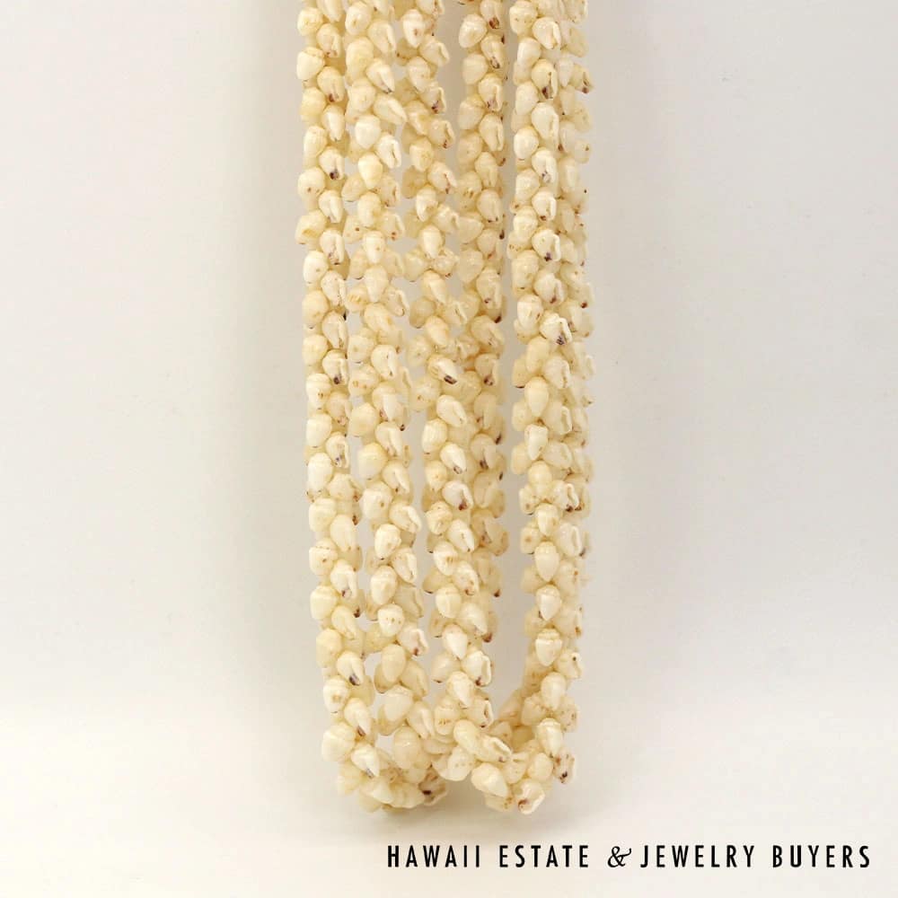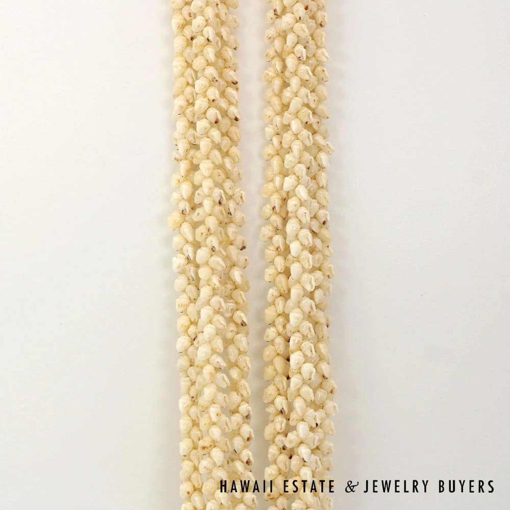 All shells are of the Momi (Dove shell) variety with Lenalena (slightly yellow/off-white) coloring. The strands are connected by a 22mmX15mm Pōleholeho (decorative shell which ties the ends of each strand together) of the ‘Āpu’upu’u (bumpy cowrie) variety with superbly-matched color.