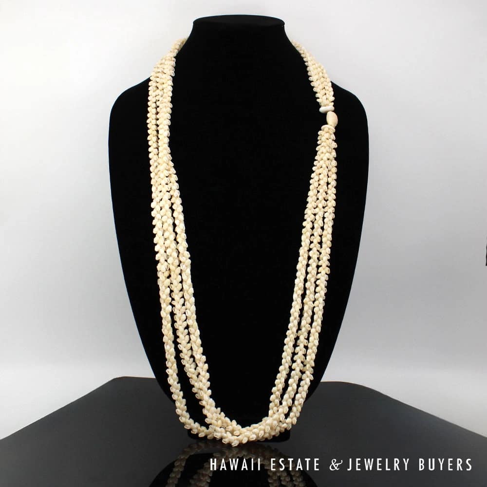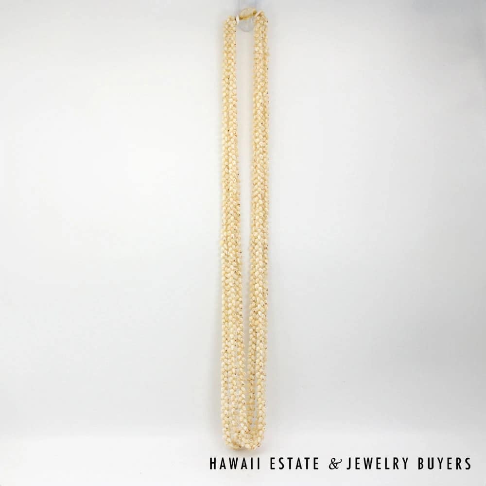 Strung in the Pikake style, each layer of shells interlaces seamlessly with the next.