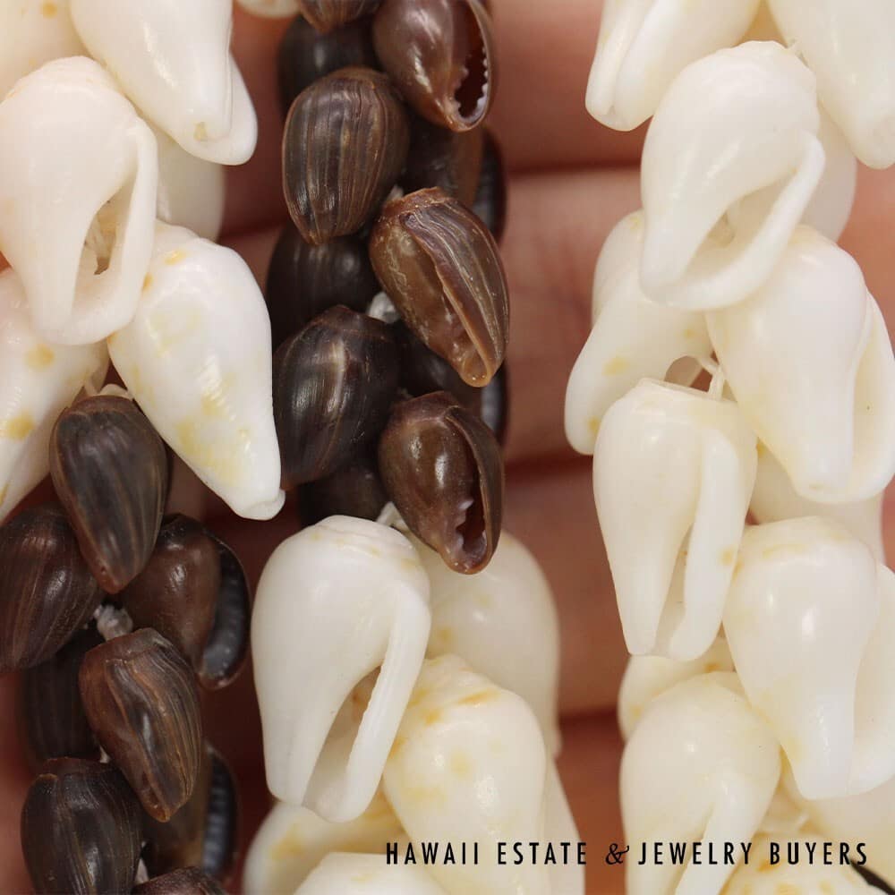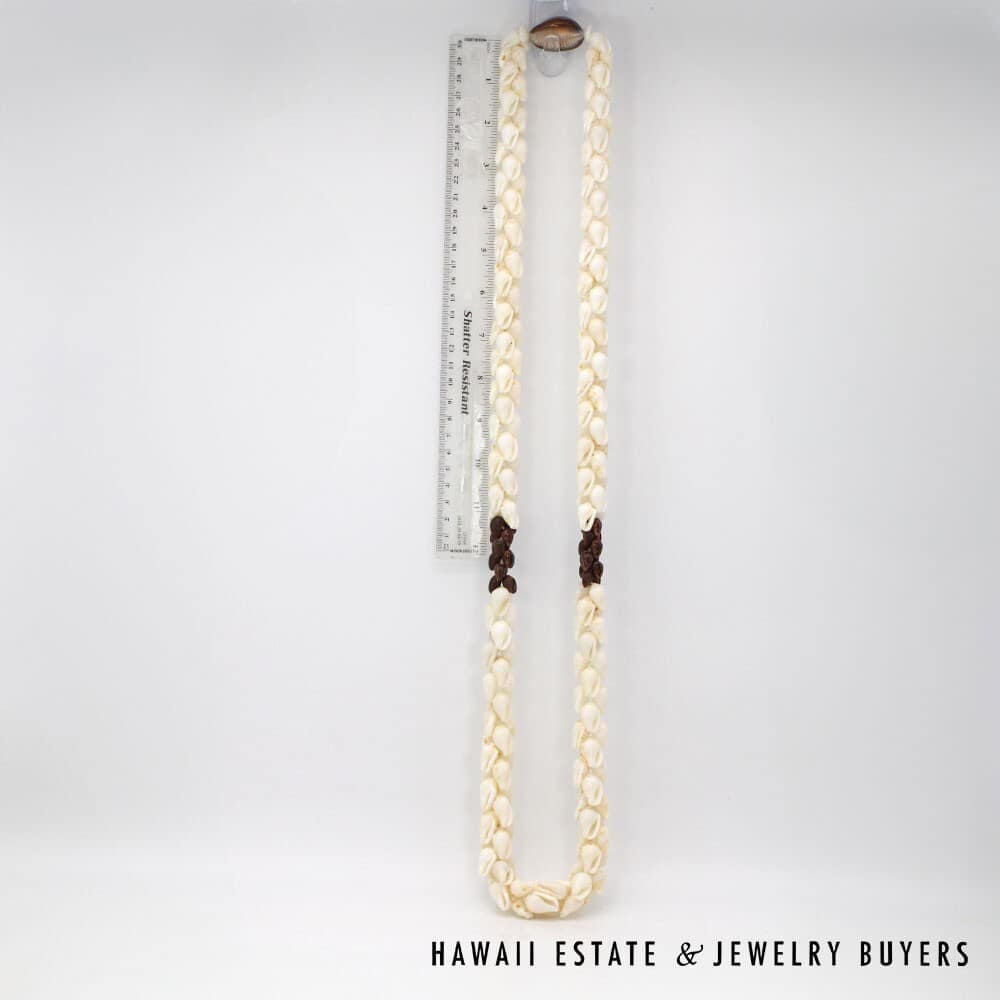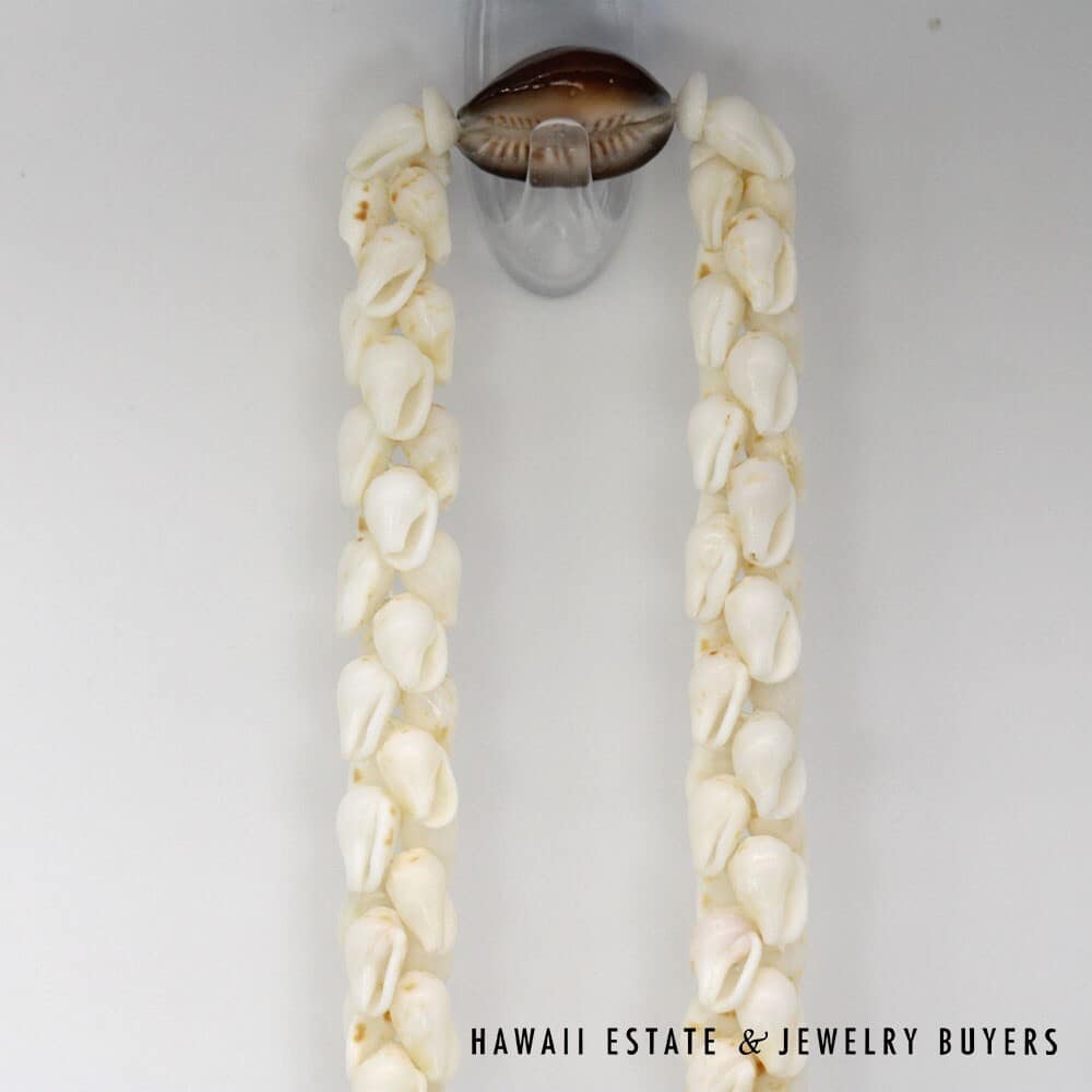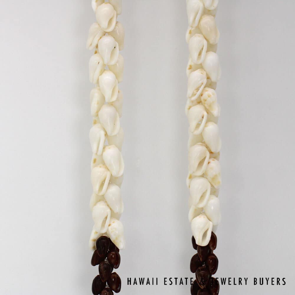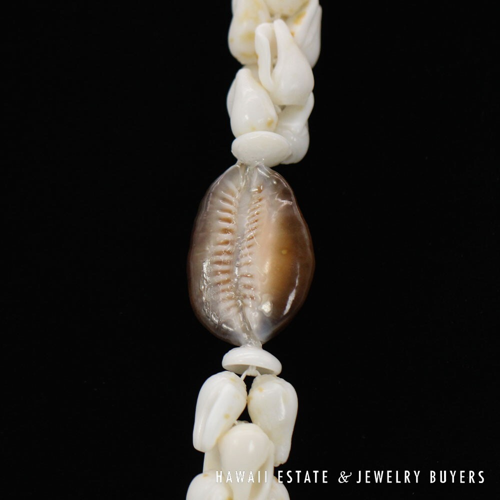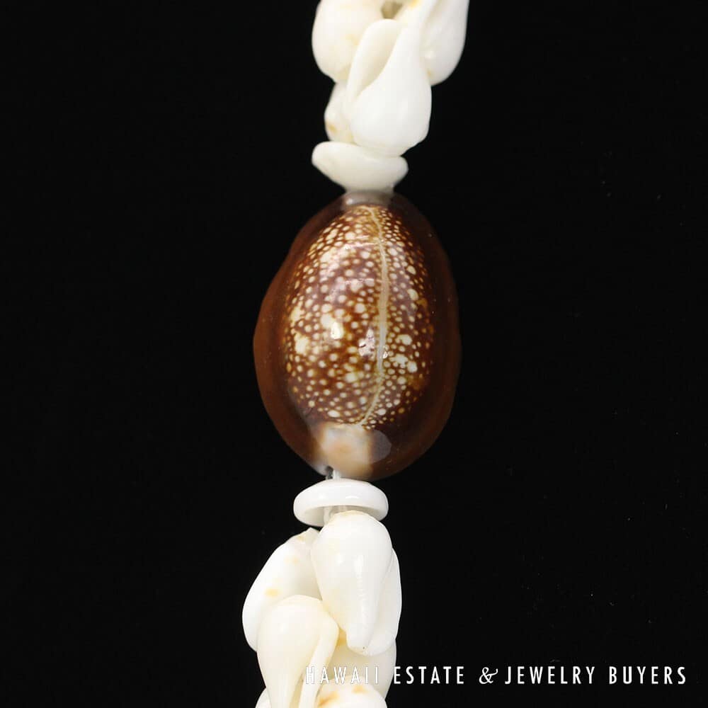 The shells are of the 'Ålīlea (large dove shell with clean white color and golden spots) and Pōleho (dark brown cone) varieties. Each end of the strand is connected together by a 33mmX22mm Pōleholeho (decorative shell used to conceal string ends) of the "night cowrie" variety.