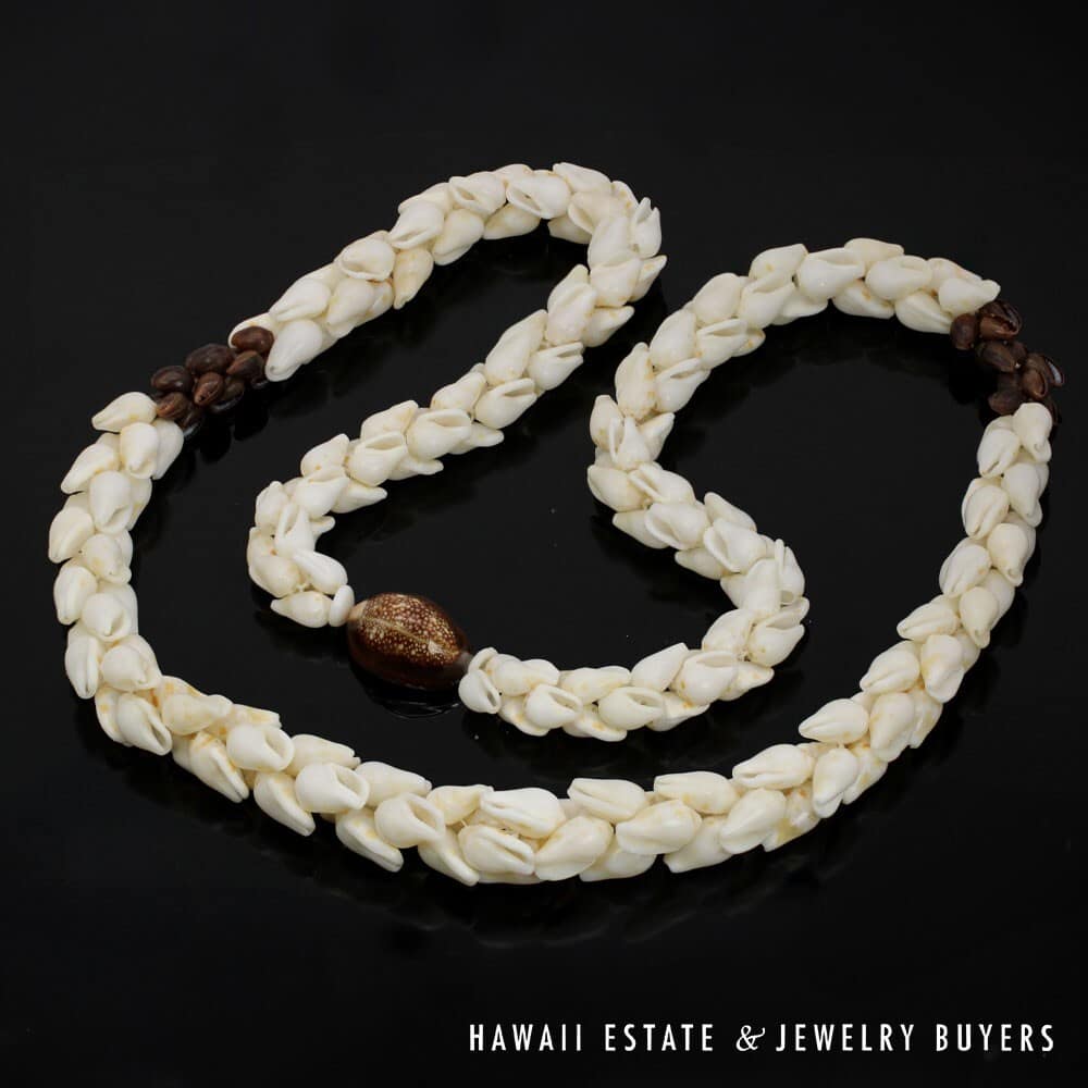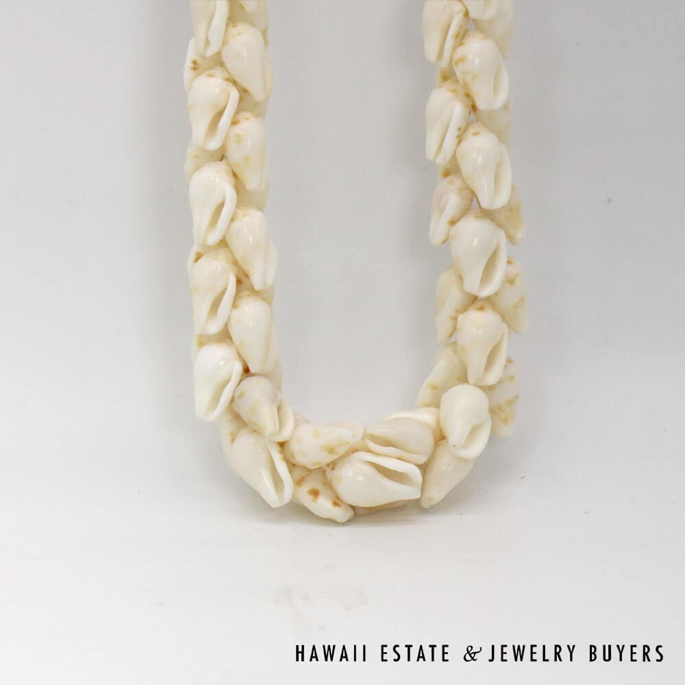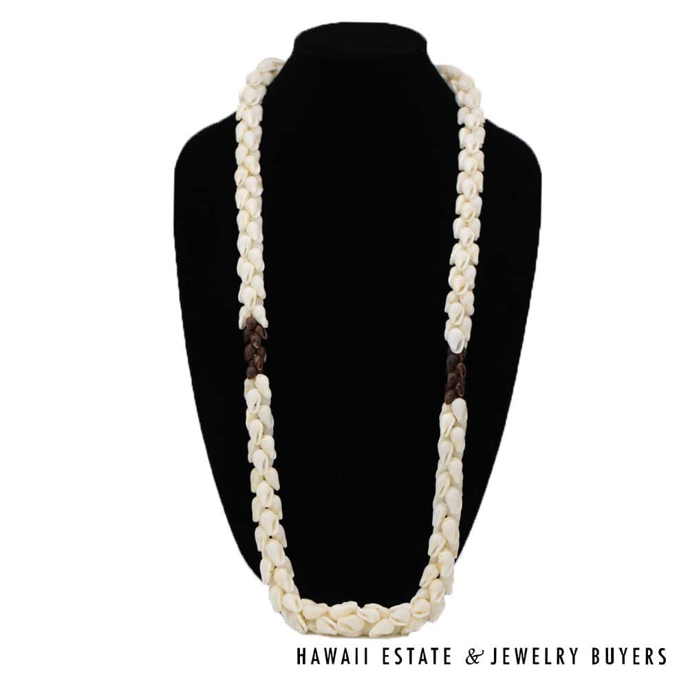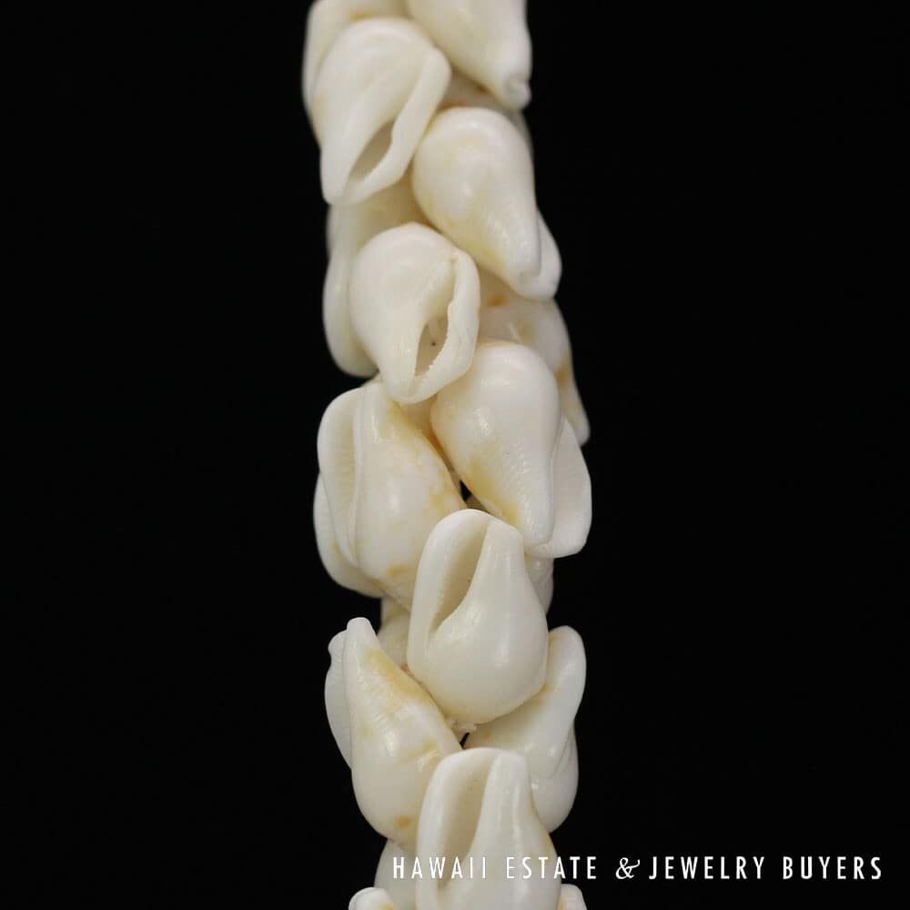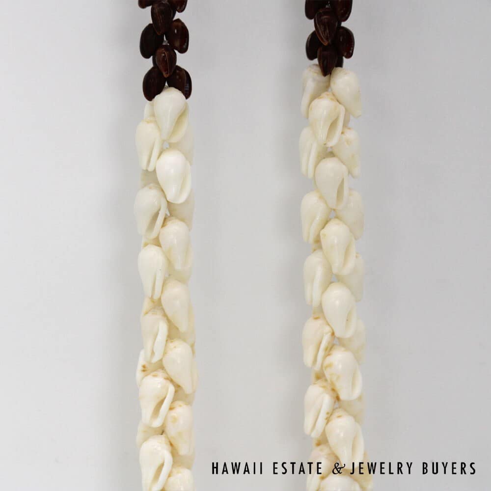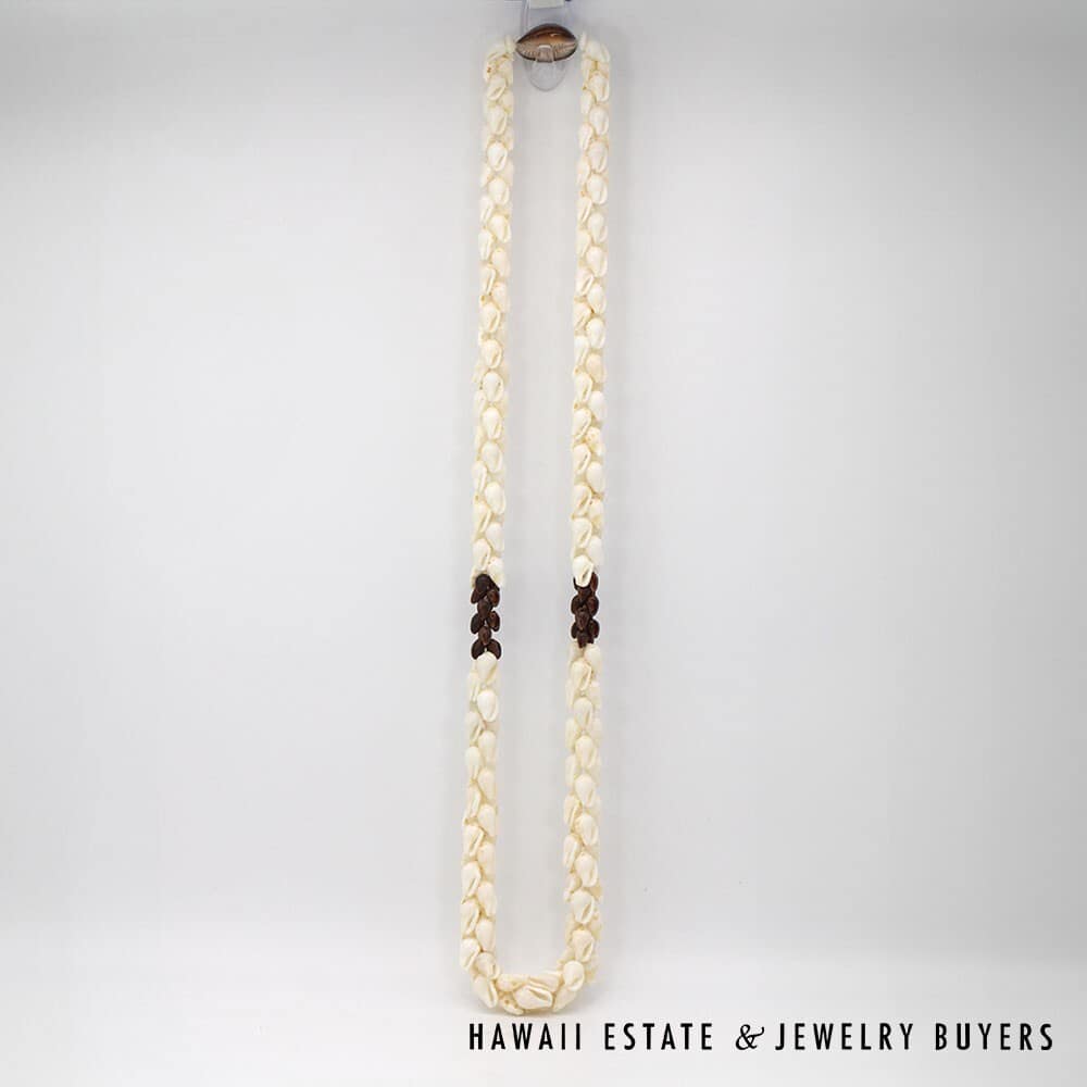 The shells are of the 'Ålīlea (large dove shell with clean white color and golden spots) and Pōleho (dark brown cone) varieties. Each end of the strand is connected together by a 33mmX22mm Pōleholeho (decorative shell used to conceal string ends) of the "night cowrie" variety.