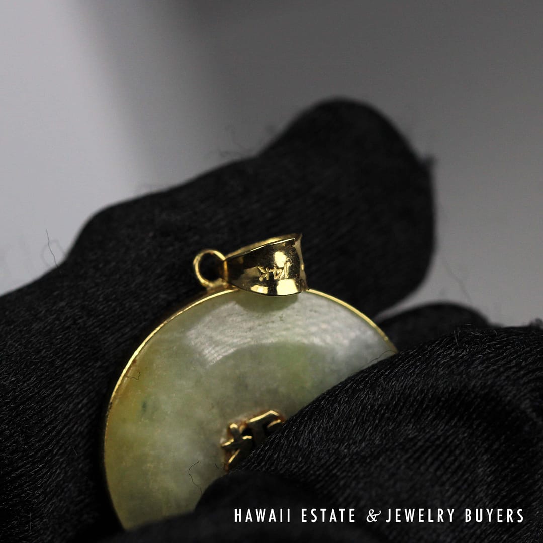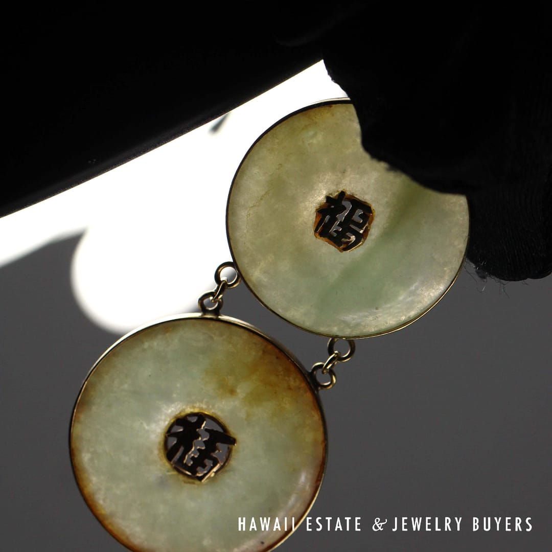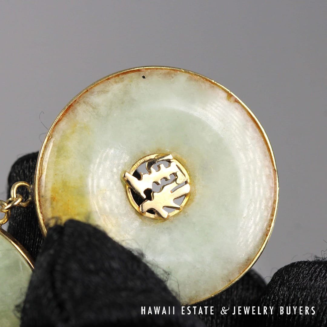DescriptionThe pendant is stamped HK 14K and weighs 10 grams. Donuts measure 24 and 26mm, length of pendant is 61mm10g 14KYG PALE GREEN JADE DOUBLE DONUT PENDANT (LA041421-21)$750.001 in stockPale Green Jade Double Donut 14K Yellow Gold Pendant with Chinese Characters quantityAdd to cartBuy withMake OfferSKU: LA041421-21Category: Pre-owned Jade JewelryRelated StylesGIA 4.7g 14KYG GREEN JADE HEART PENDANT$3,100.0023g 18KYG MOTTLED GREEN JADE CARVED PENDANT$2,800.0036.8g 14KYG LIGHT GREENISH GRAY JADE HINGED BANGLE BRACELET SIZE 7.5$6,500.00GIA 3.4g 24KYG TYPE A GREEN JADE HEART PENDANT MEASURES 28 X 19mm$3,900.00