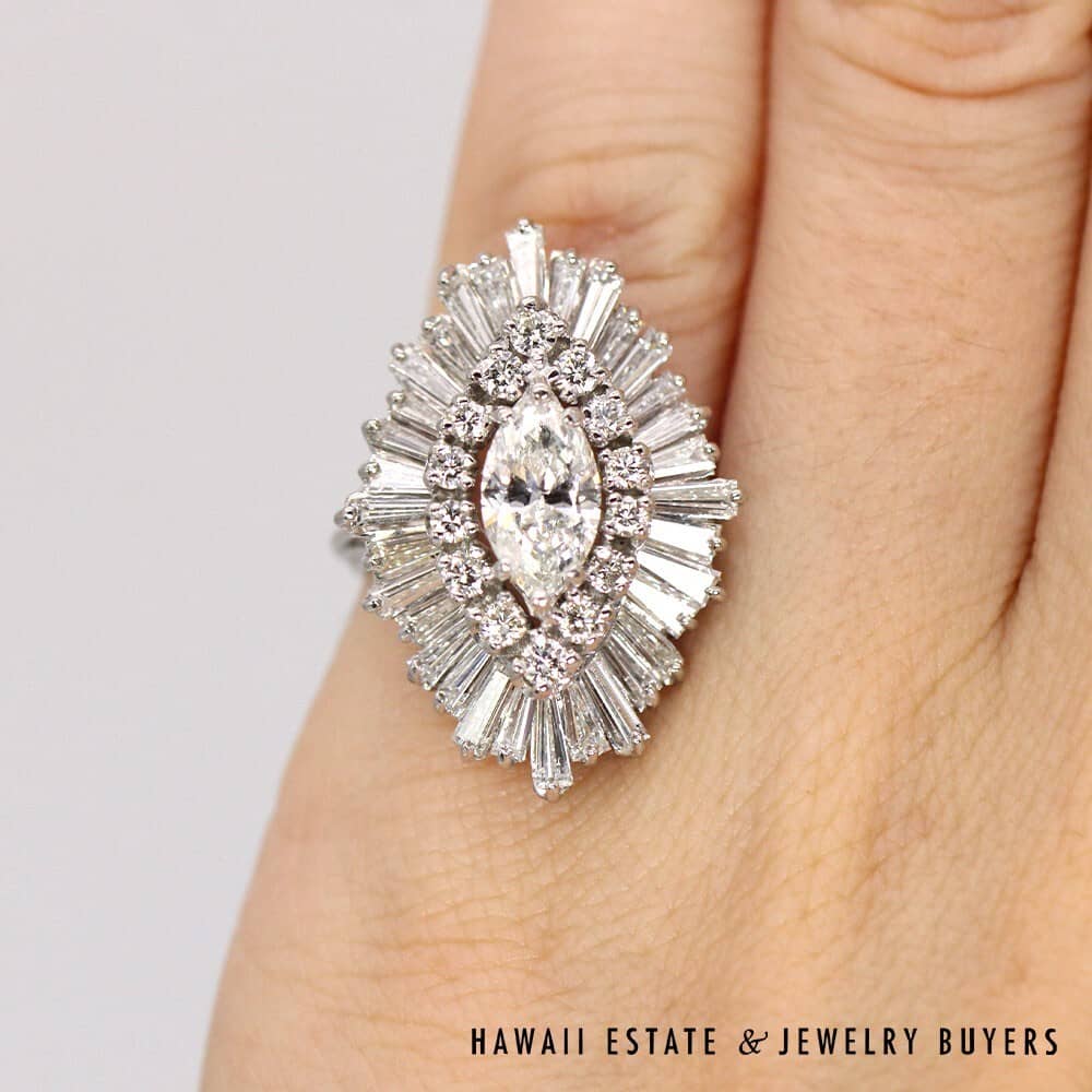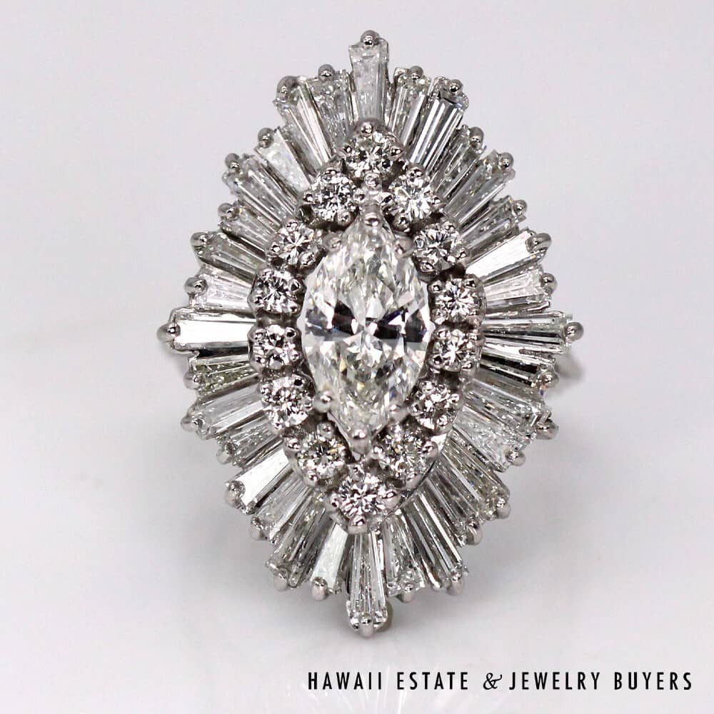 Experience the exquisite elegance of this Platinum 3.25ctw Marquis Diamond Ballerina Ring, a true testament to timeless style and grace. The ring boasts a stunning array of baguette, round, and marquise-cut diamonds, meticulously set to capture the light and showcase their unmatched brilliance. Crafted from platinum, the metal's purity ensures a luxurious feel and a lustrous finish that complements the diamonds' sparkle. The ring's halo measures approximately 26mmX18mm at the longest and widest points and taper seamlessly to a 2mm wide band. The center stone is approximately 9mmX5mm and all diamonds have SI1 average clarity and I/J average color.