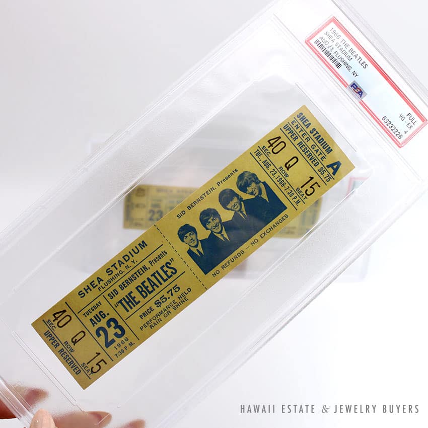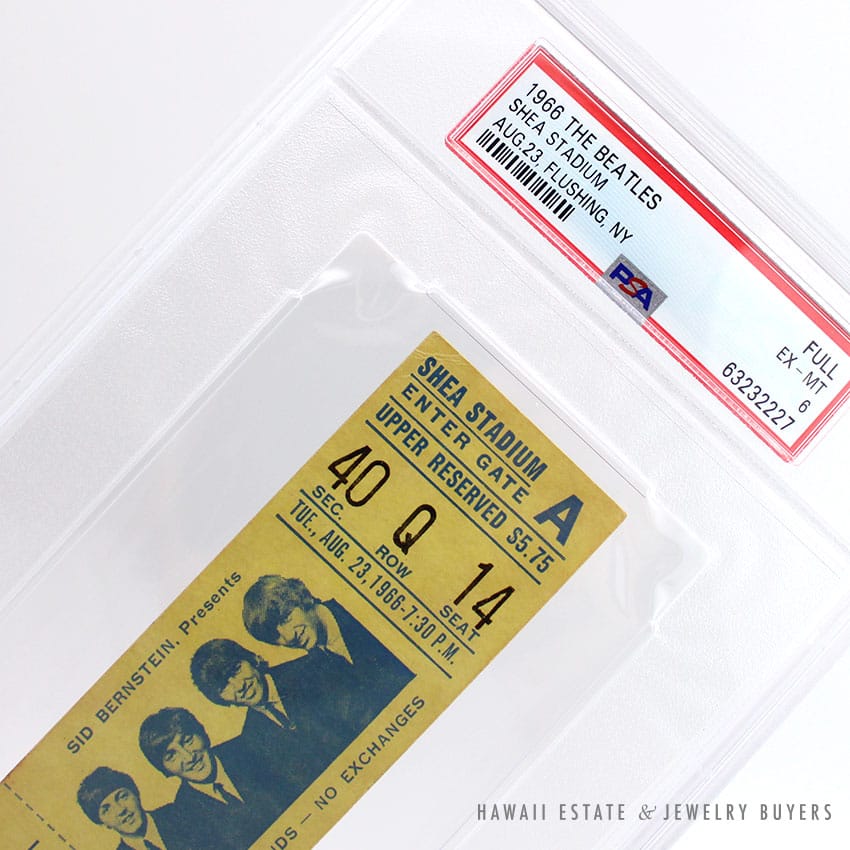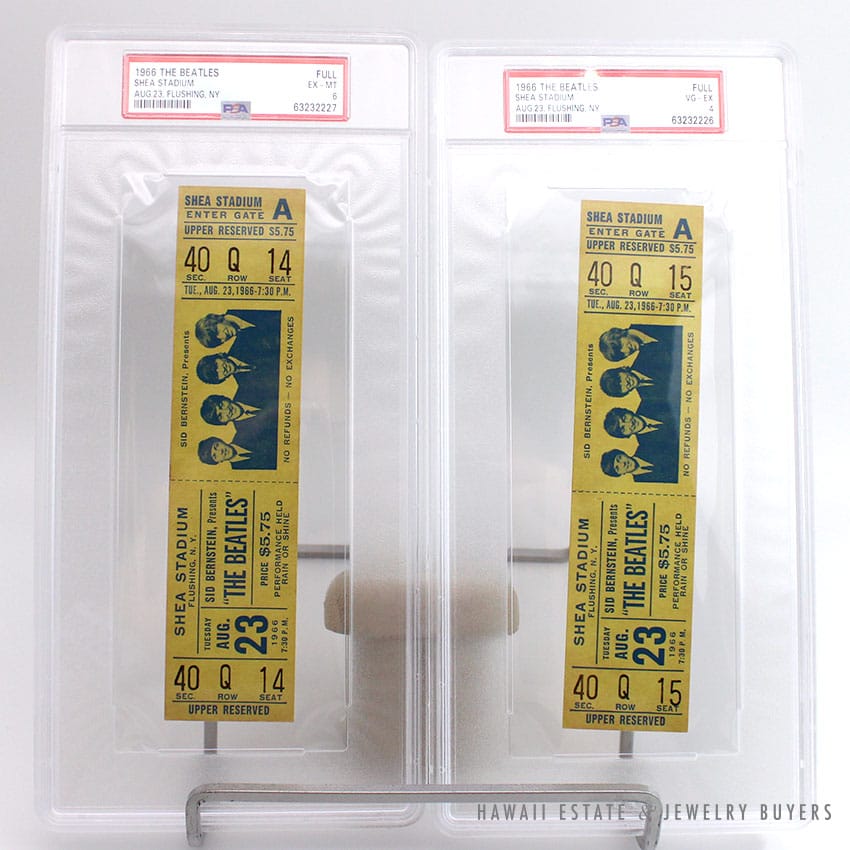 DescriptionSET OF (2) PSA GRADED 1966 BEATLES CONCERT TICKETS SHEA STADIUM AUG 23 FLUSHING, NY 7:30PM(1) UPPER SEC 40, ROW Q, SEAT 14 – PSA #63232227 FULL EX-MT 6(1) UPPER SEC 40, ROW Q, SEAT 15 – PSA #63232226 FULL VG-EX 4$10,000.00Out of stockSKU: PSATICKETS-01Category: Pre-owned Vintage JewelryTag: The BeatlesRelated StylesGIA CERTIFIED NATURAL GRADE A LAVENDER JADEITE JADE PENDANT W/ DIAMONDS$5,900.00Certified Nephrite Jade White Hollow Cylinder$3,700.00Certified Jade White Carved Bangle Bracelet$5,300.00Carved Pierced Bamboo Motif Jade 18K Yellow Gold Cufflinks$1,500.00