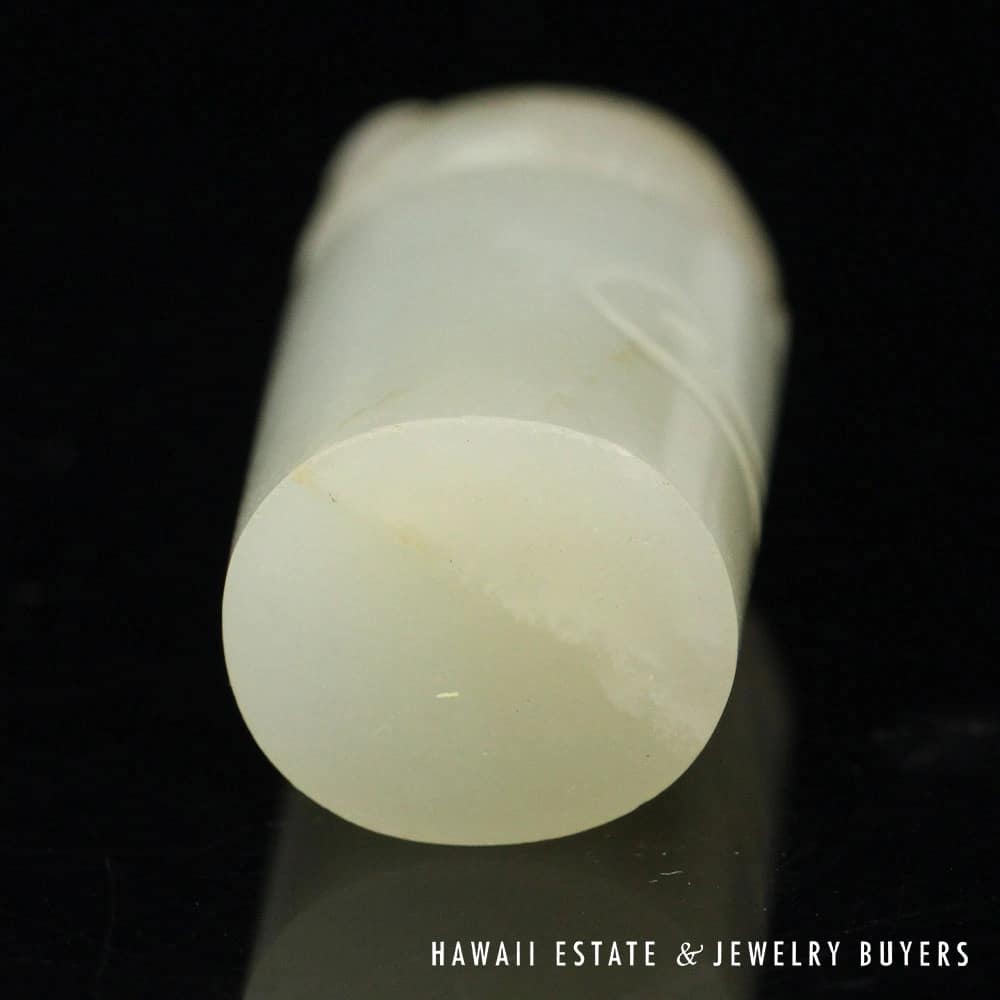 Immerse yourself in the rich history of China with this exquisite Qing Era Mythical Creature Mutton Fat Jade Seal Stamp. Carved from the finest jade, this seal showcases a vibrant green hue that radiates with its own timeless elegance. The intricate design, featuring a mythical creature, is a testament to the skilled craftsmanship of the era and serves as a beautiful piece of art or a functional collectible. The stamp end of the seal has not been carved and has a slight oval shape, measuring about 18mm wide by 15mm thick. The cylinder is 44mm tall and weighs about 27.14g.