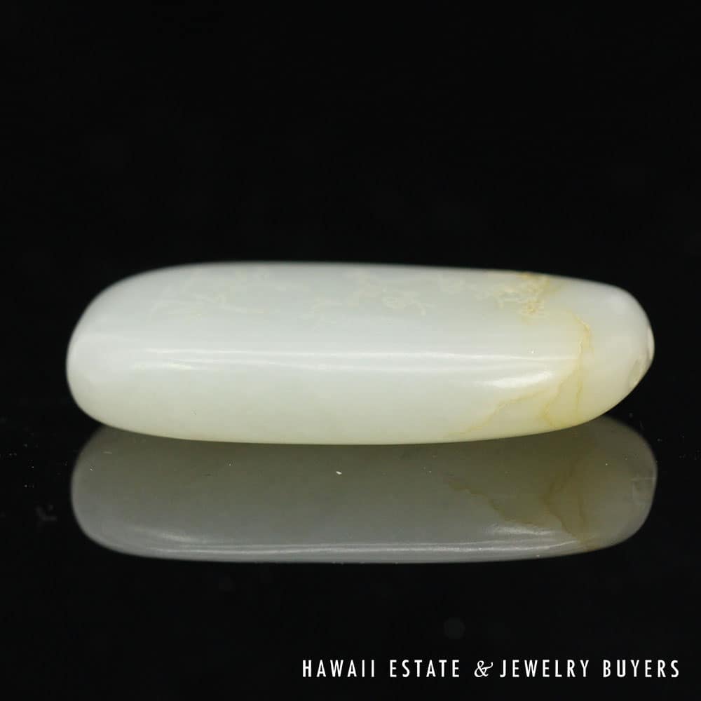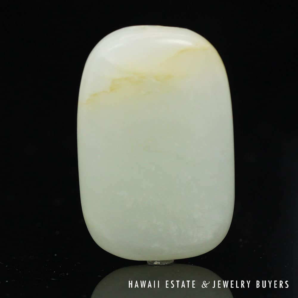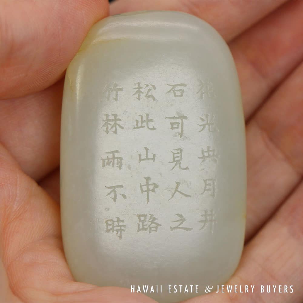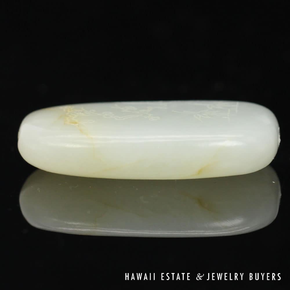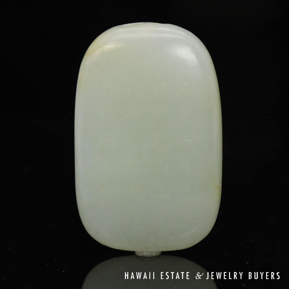 This piece of mutton fat jade has been skillfully carved to exhibit botanical motifs on one side and the traditional Chinese “Forest Poem” on the other. A pair of holes have been drilled into the top side of the carving, allowing it to be easily threaded onto a chain or ribbon and worn as a pendant.