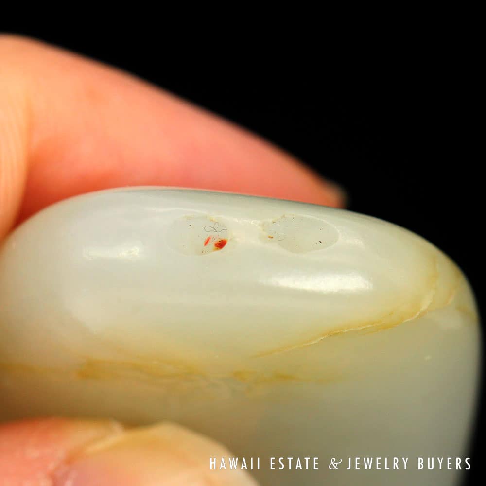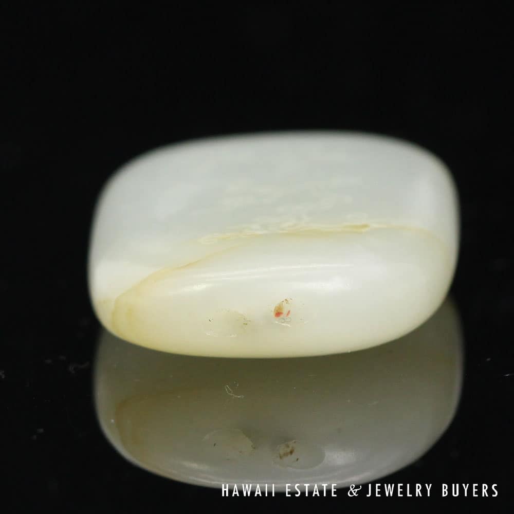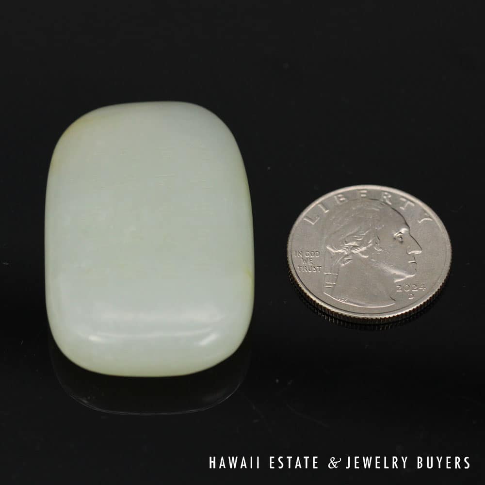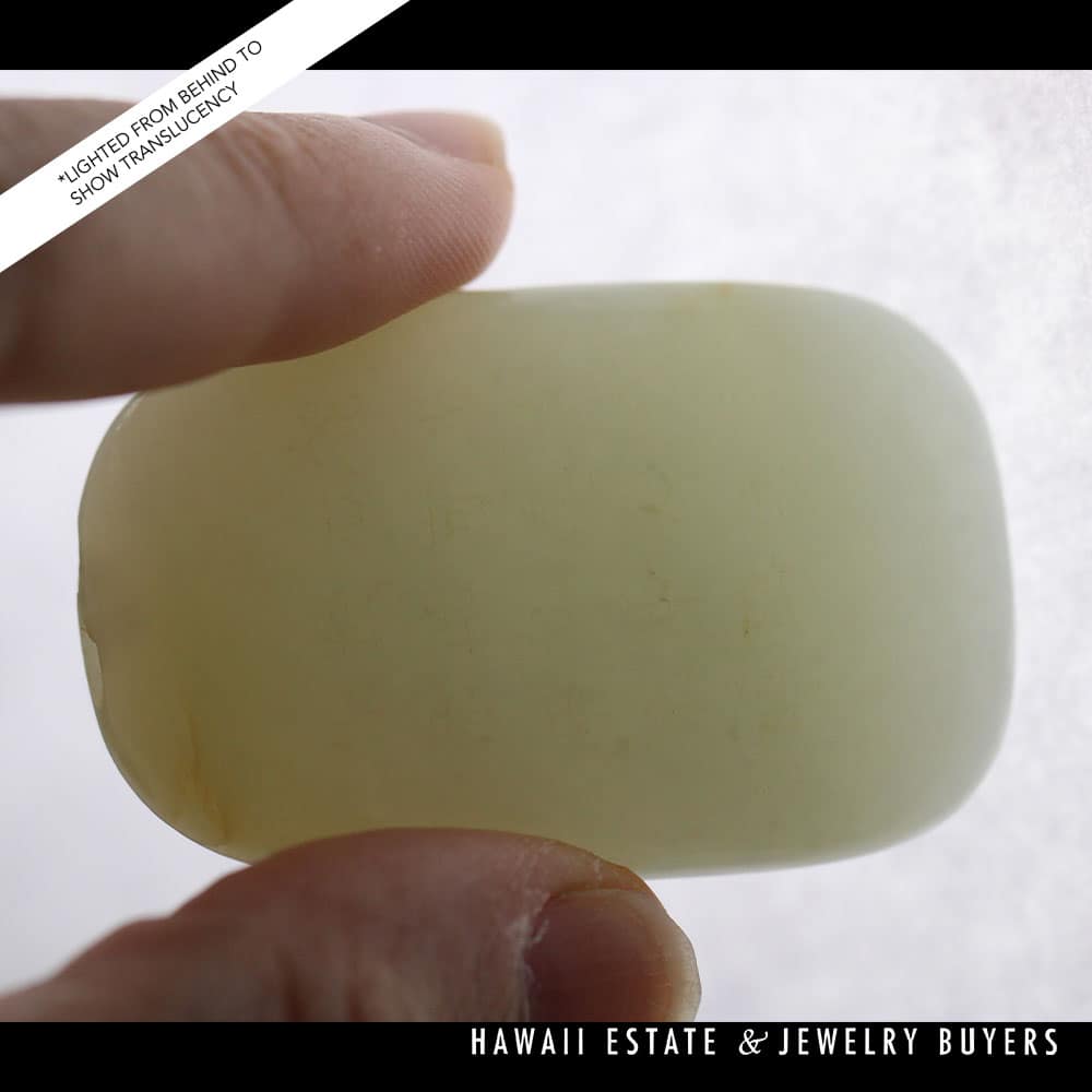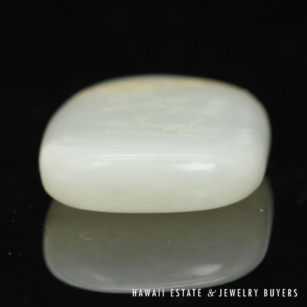 This piece of mutton fat jade has been skillfully carved to exhibit botanical motifs on one side and the traditional Chinese “Forest Poem” on the other. A pair of holes have been drilled into the top side of the carving, allowing it to be easily threaded onto a chain or ribbon and worn as a pendant.