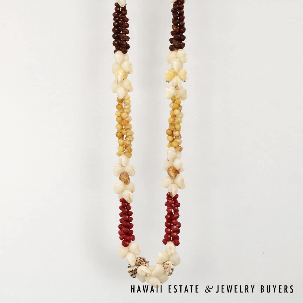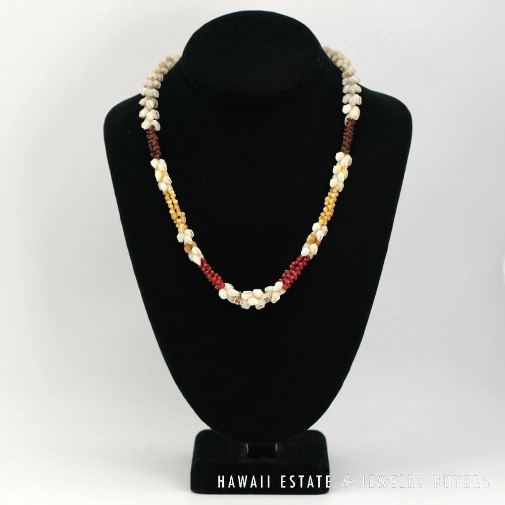 The shells are a mix of Momi (dove shells) with Lenalena (yellow/off-white), Uli Uli (blue/deep gray), Kahakaha (deep gold with darker stripes), and Onikiniki (white with black/dark brown stripes) colorations, as well as Kahelelani (turban shells) in the colors of Akalaikaika (rich pink/magenta) and Ele Ele (black/dark brown).