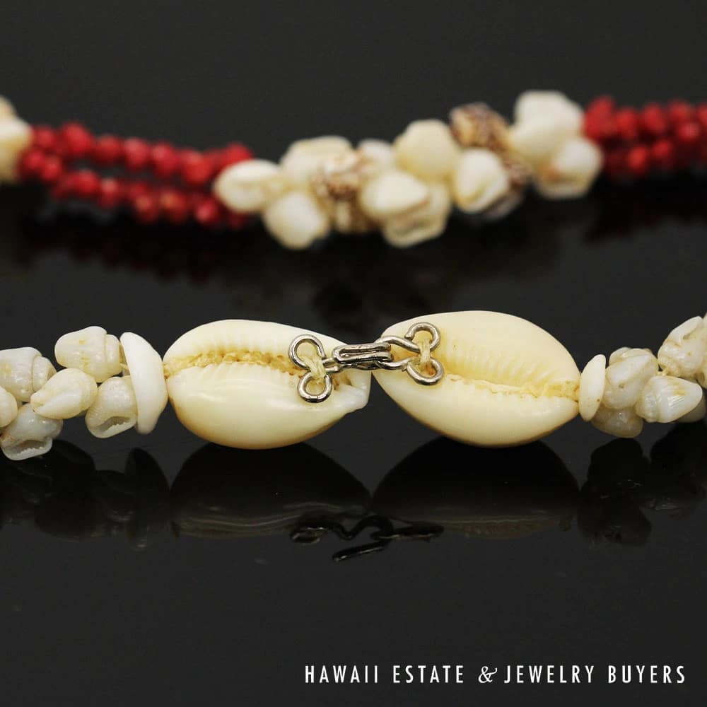 The choker can be easily secured around the neck with a hook-and-eye closure, which has been skillfully concealed behind a pair of Pōleholeho (decorative shells used to tie-off the ends of each strand) of the smooth ‘money cowrie‘ variety.