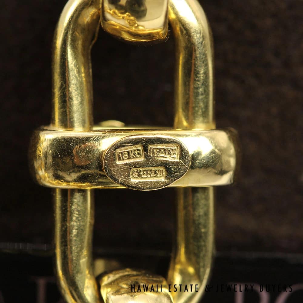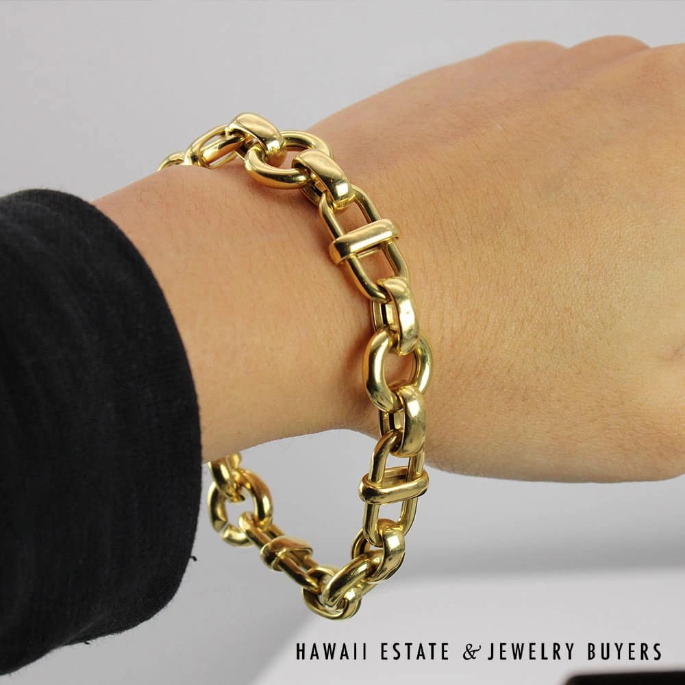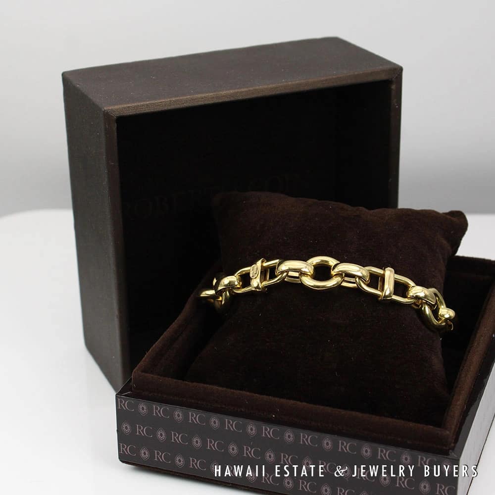 DescriptionBeautiful authentic Roberto Coin bracelet in 18K Yellow Gold. Comes with original Roberto Coin box (which shows signs of wear as shown).ROBERTO COIN 15.3g 18KYG LINK BRACELET SIZE 7 WITH BOX (072120-02$3,000.00Out of stockSKU: 072120-02Category: Pre-owned Designer JewelryTag: ROBERTO COINRelated StylesMichael B. Burmese Ruby Diamond Ring$6,500.00TIFFANY & CO. 15MM SOUTH SEA CULTURED PEARL PLATINUM ELSA PERETTI PENDANT & NECKLACE 32″ WITH FOLIO, BOX & PAPER$8,000.00MIKIMOTO 2.23CTW DIAMOND & PEARL 14K WHITE GOLD ELEGANT SWIRL BROOCH PIN W/ GEMOLOGIST APPRAISAL$5,600.00Tiffany & Co Angela Cummings 18K Earrings$4,500.00