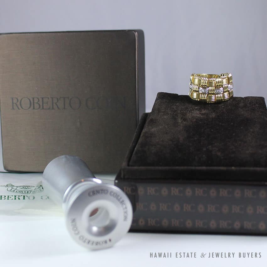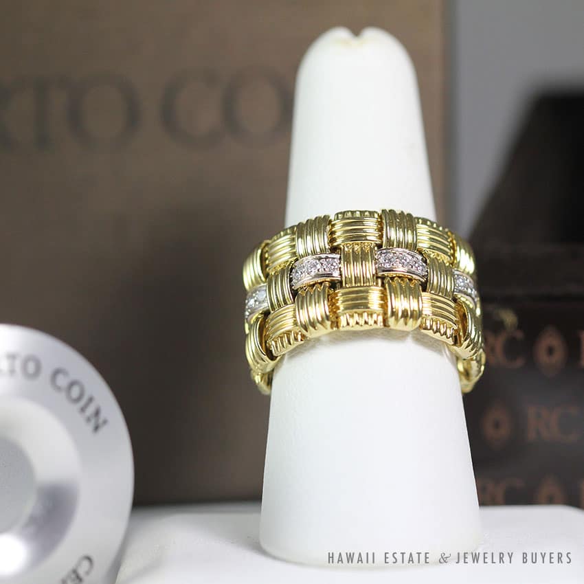 “Interlocking ribbed gold links in a basket weave design create a flexible, fabrice like movement in Roberto Coin’s signature collection meaning ‘passionate'”